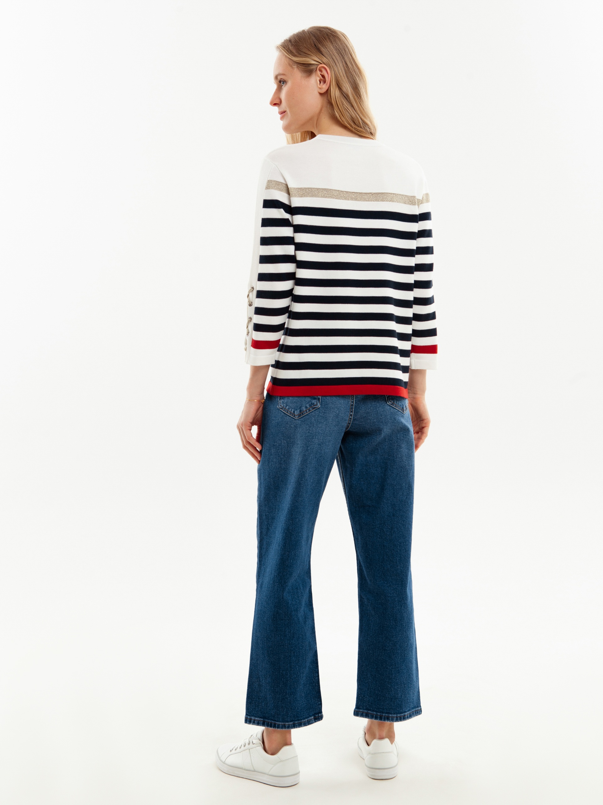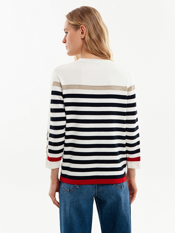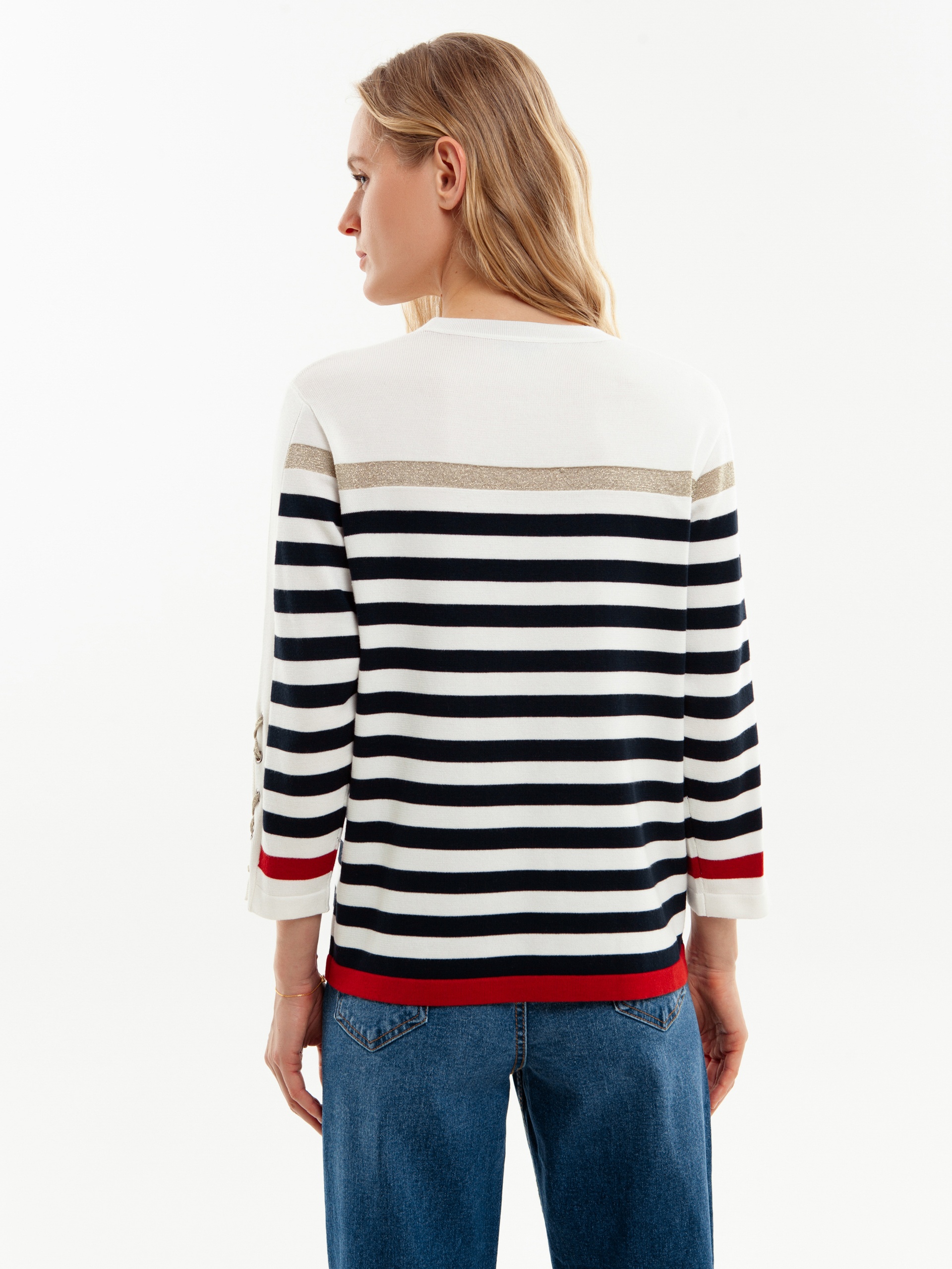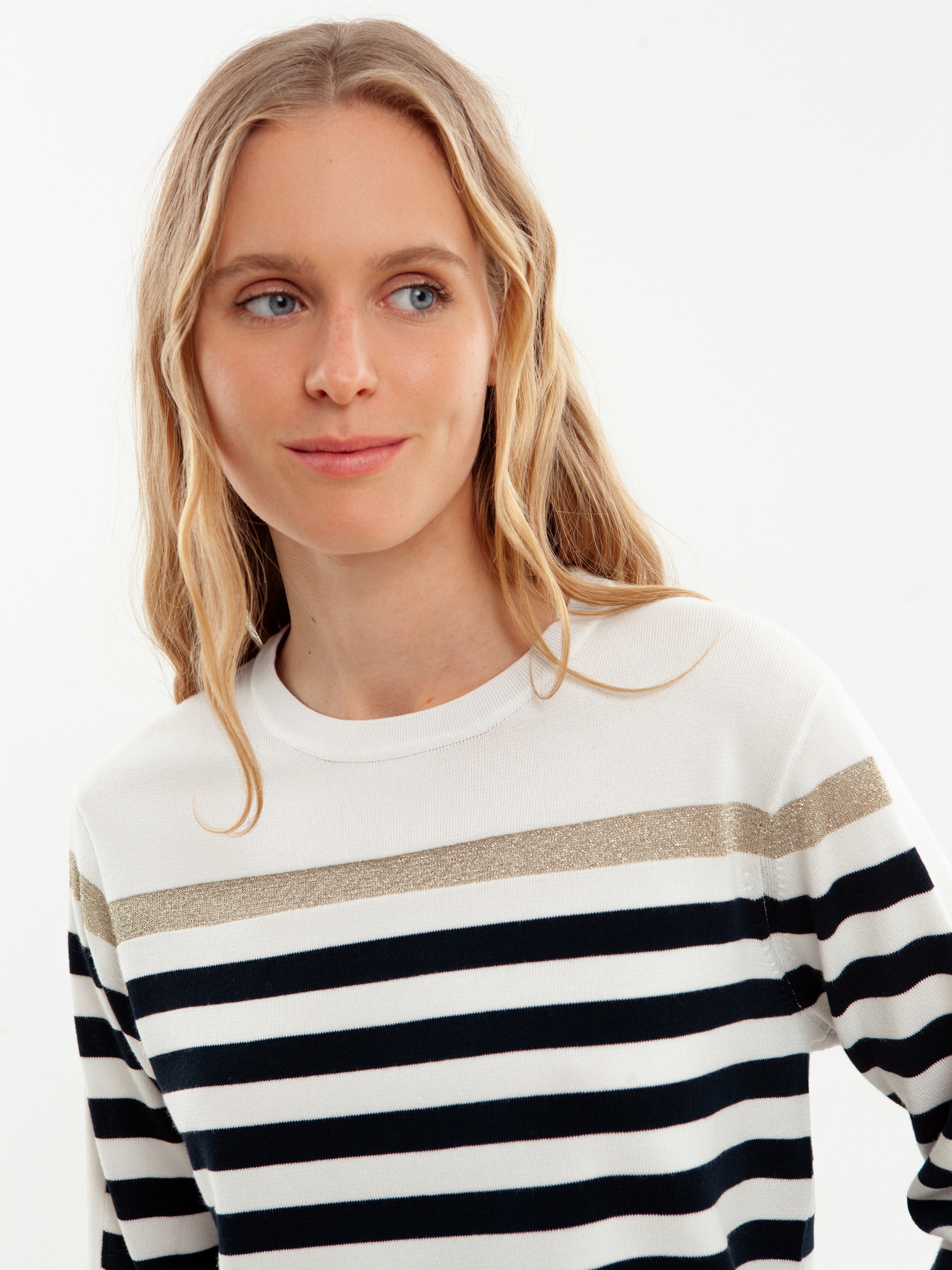 Джемпер прямого кроя в бретонскую полоску с золотистыми вставками люрекса и контрастными элементами, придаст вашему весеннему образу настроение морского вояжа, даже если за окном холода.
