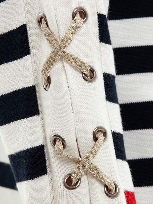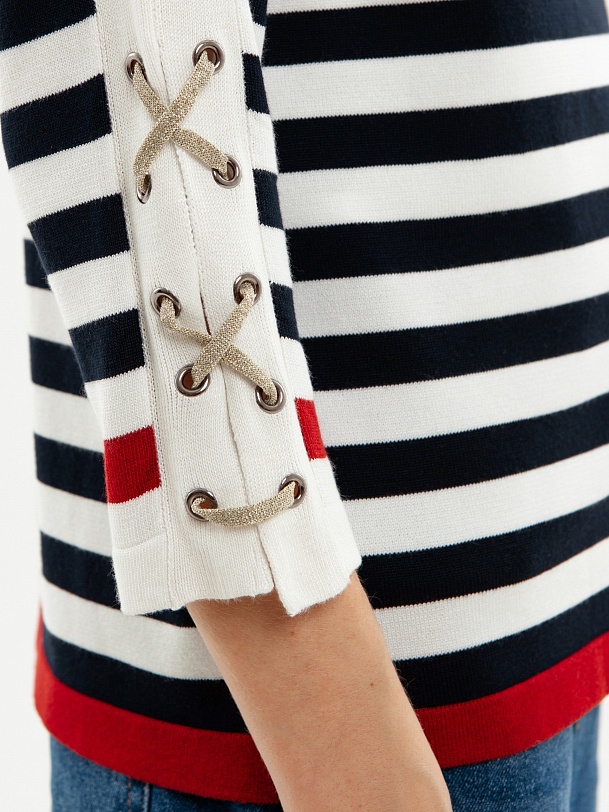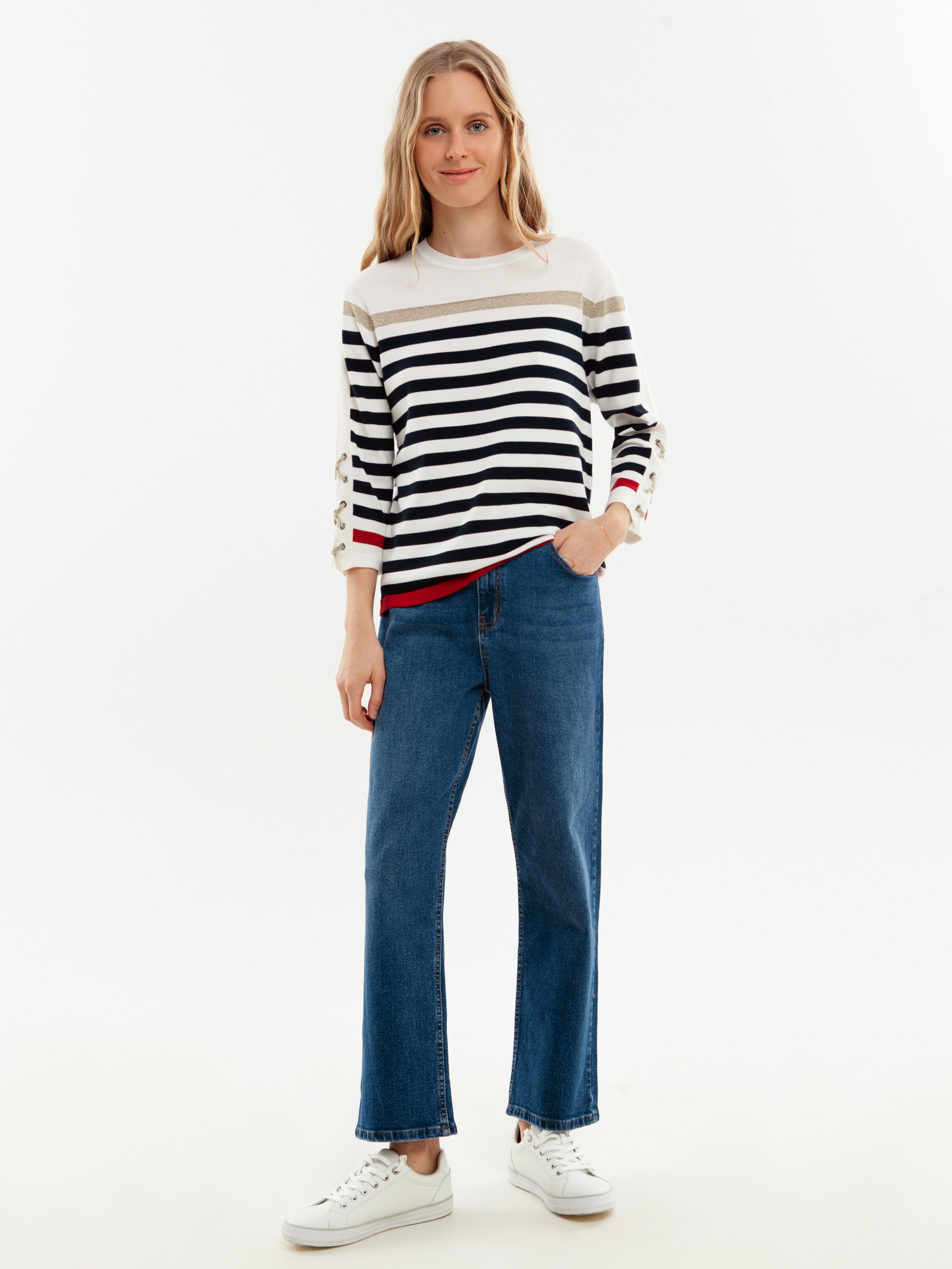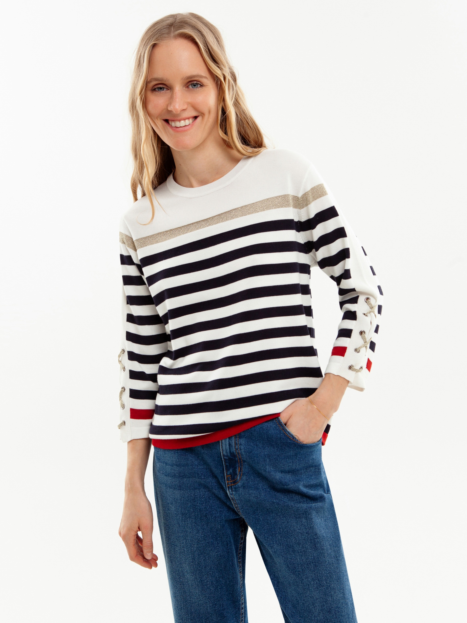 Джемпер прямого кроя в бретонскую полоску с золотистыми вставками люрекса и контрастными элементами, придаст вашему весеннему образу настроение морского вояжа, даже если за окном холода.