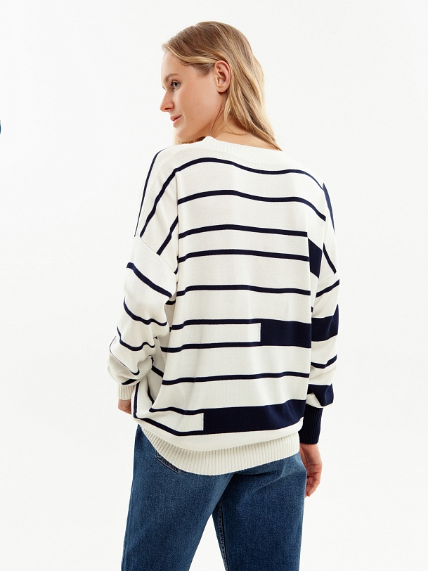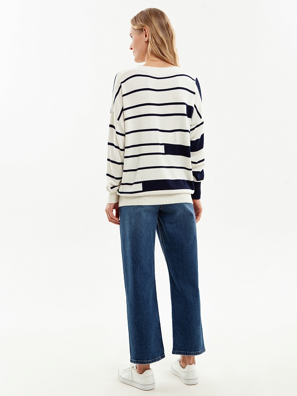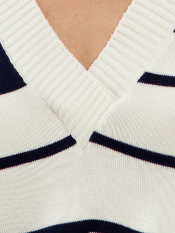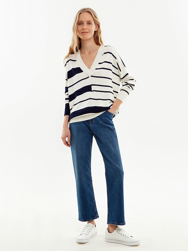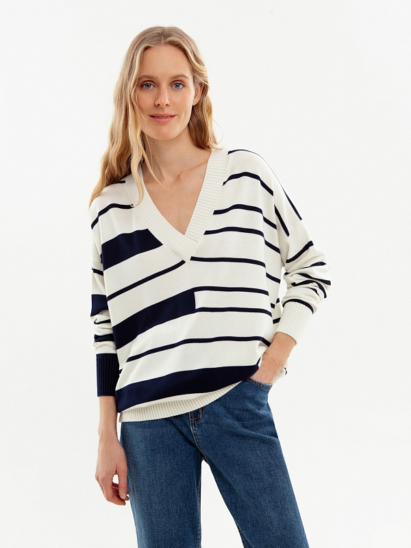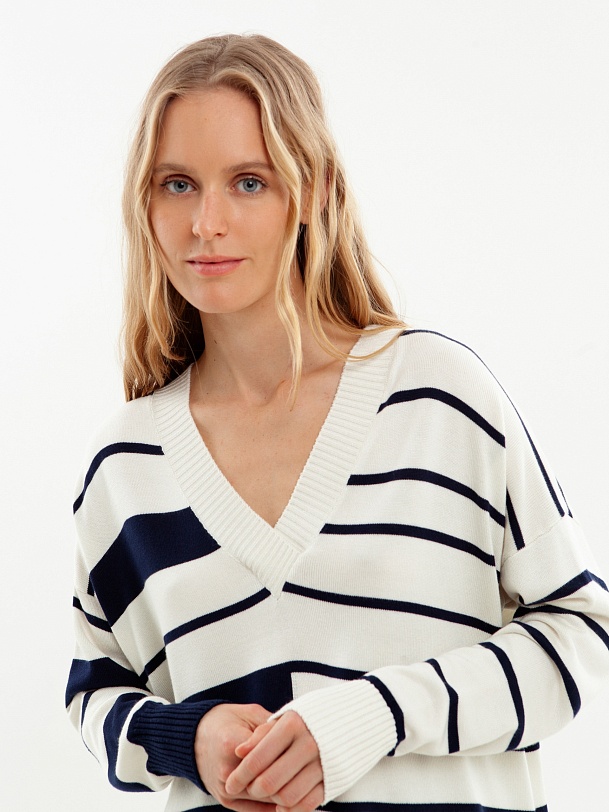 Джемпер свободного силуэта с V-образным вырезом и бретонскую полосу. Вискозная нить в составе пряжи приятно холодит кожу и имеет легкий блеск.