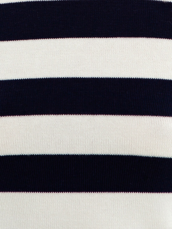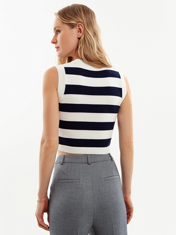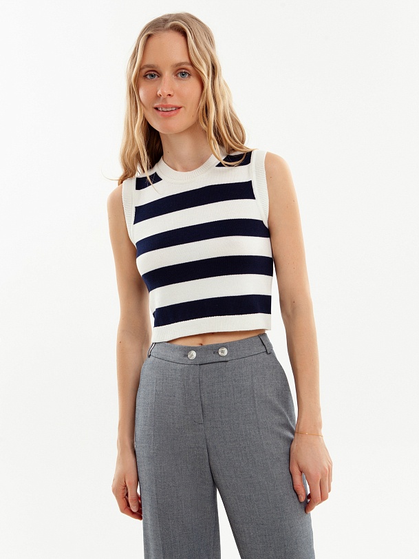 Вязаный кроп-топ в широкую полосу. Он станет универсальным дополнением для весенних casual-образов, с кардиганами, жакетами или рубашками.