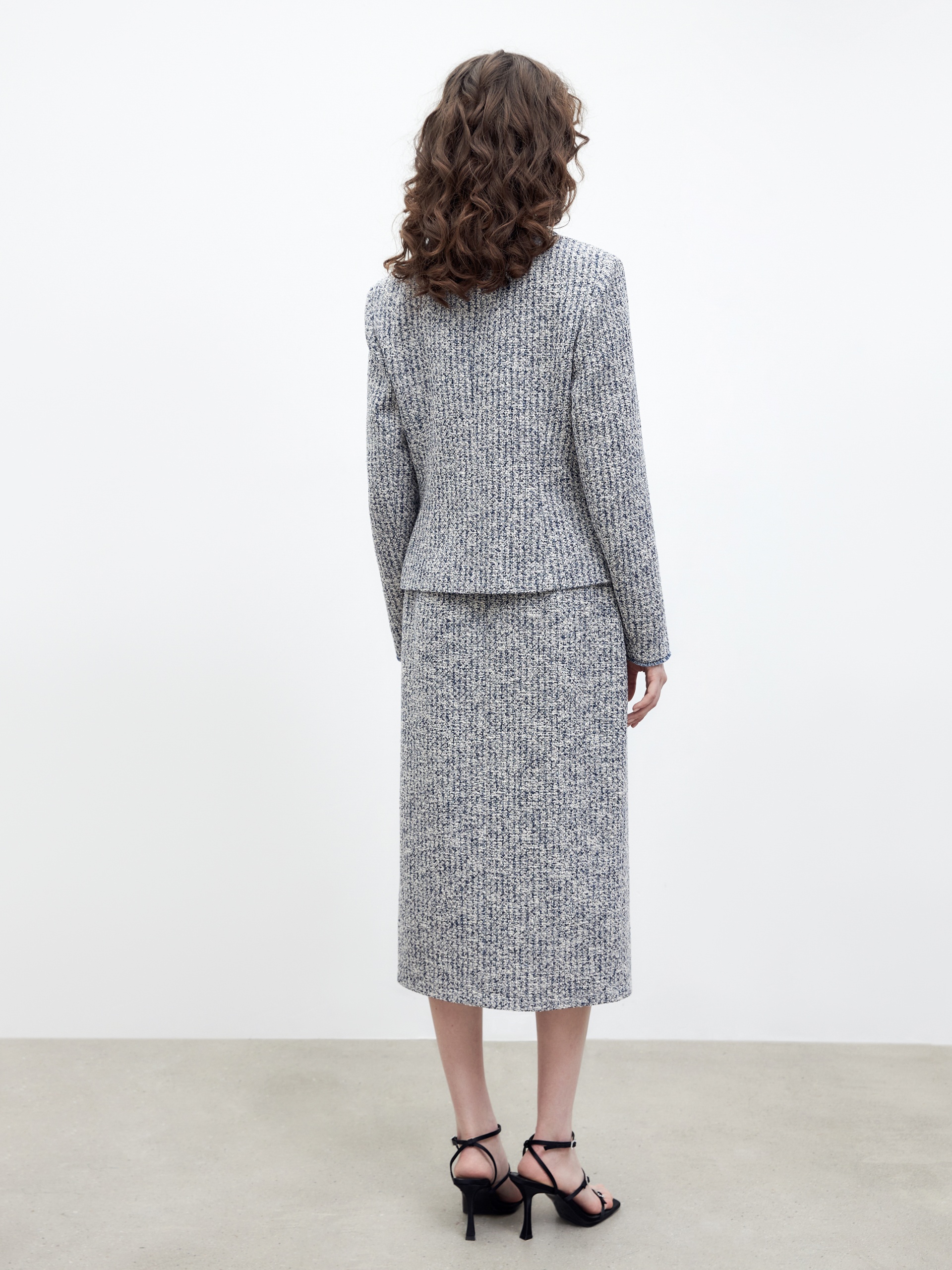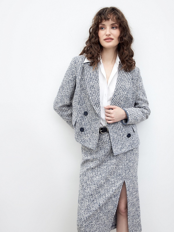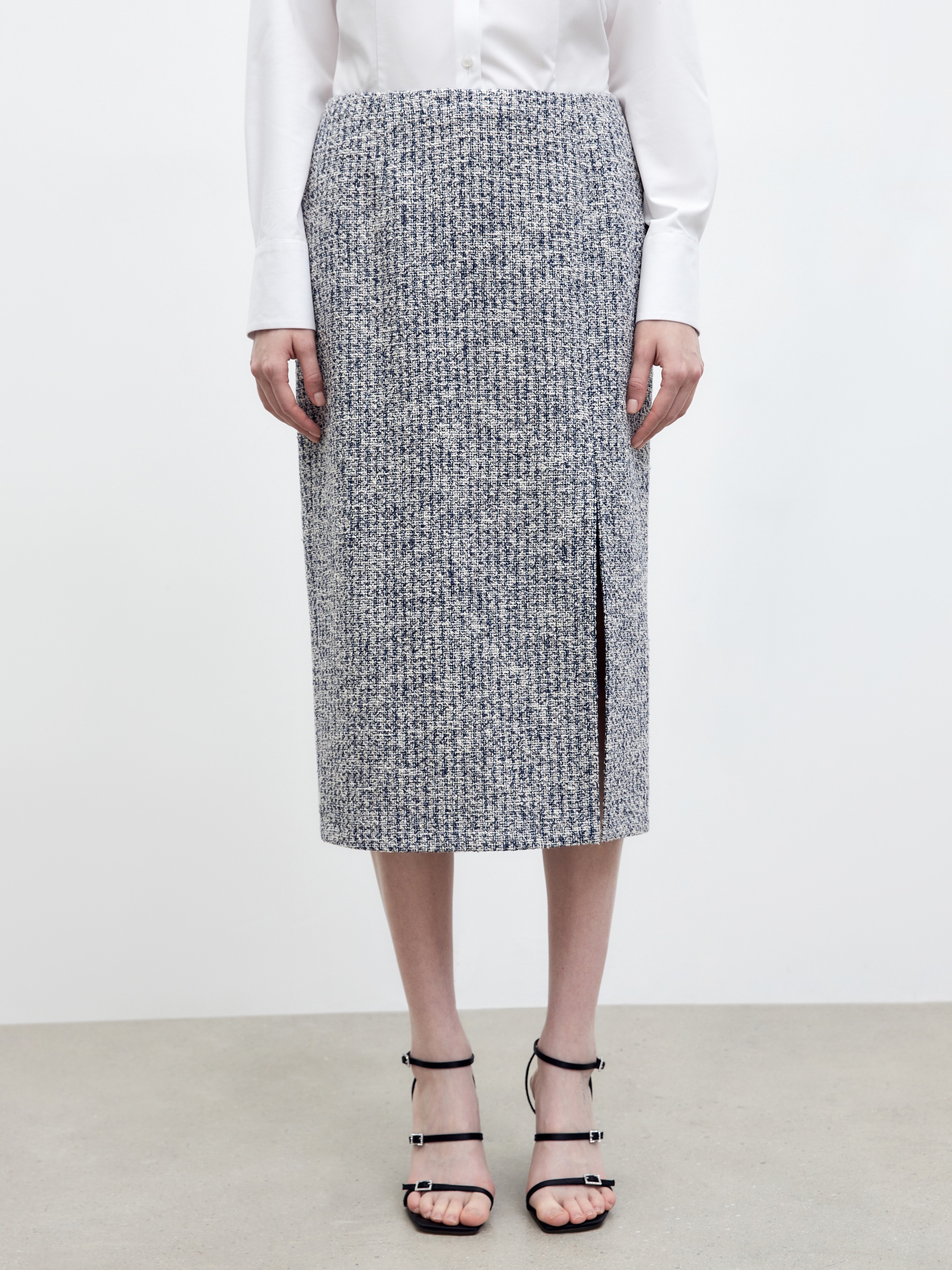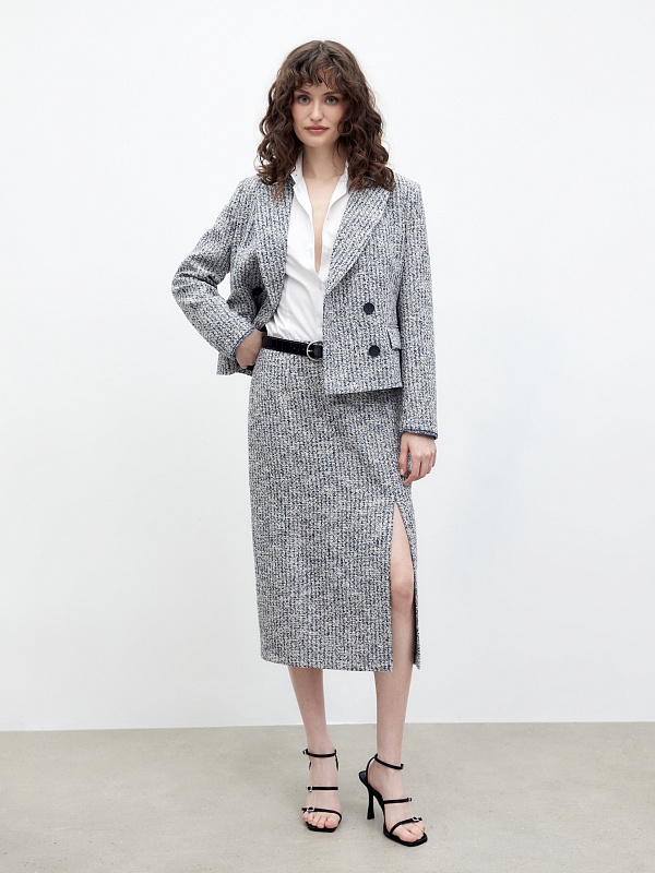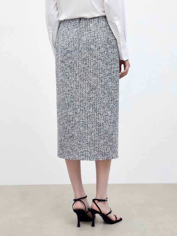 Юбка-карандаш длиной миди из фактурной твидовой ткани, на подкладке. Сбоку разрез, застежка на спинке на потайную молнию.