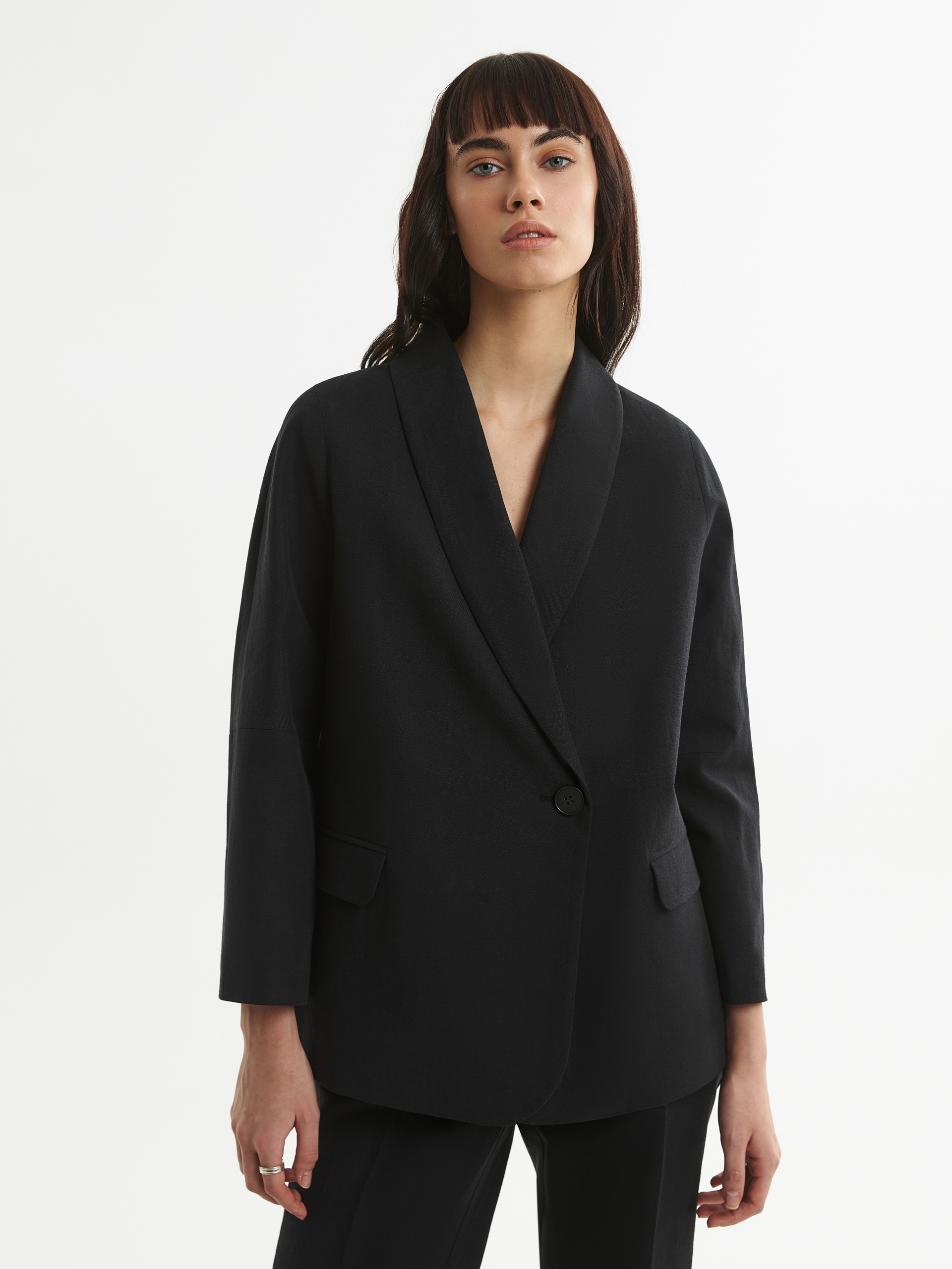 Хлопковый жакет на подкладке прямого силуэта с воротником-шаль, мягким спущенным плечом и укороченным рукавом. Застежка на пуговицу. Края бортов закругленные. Жакет идеально сочетается с брюками и юбкой из одной ткани.
