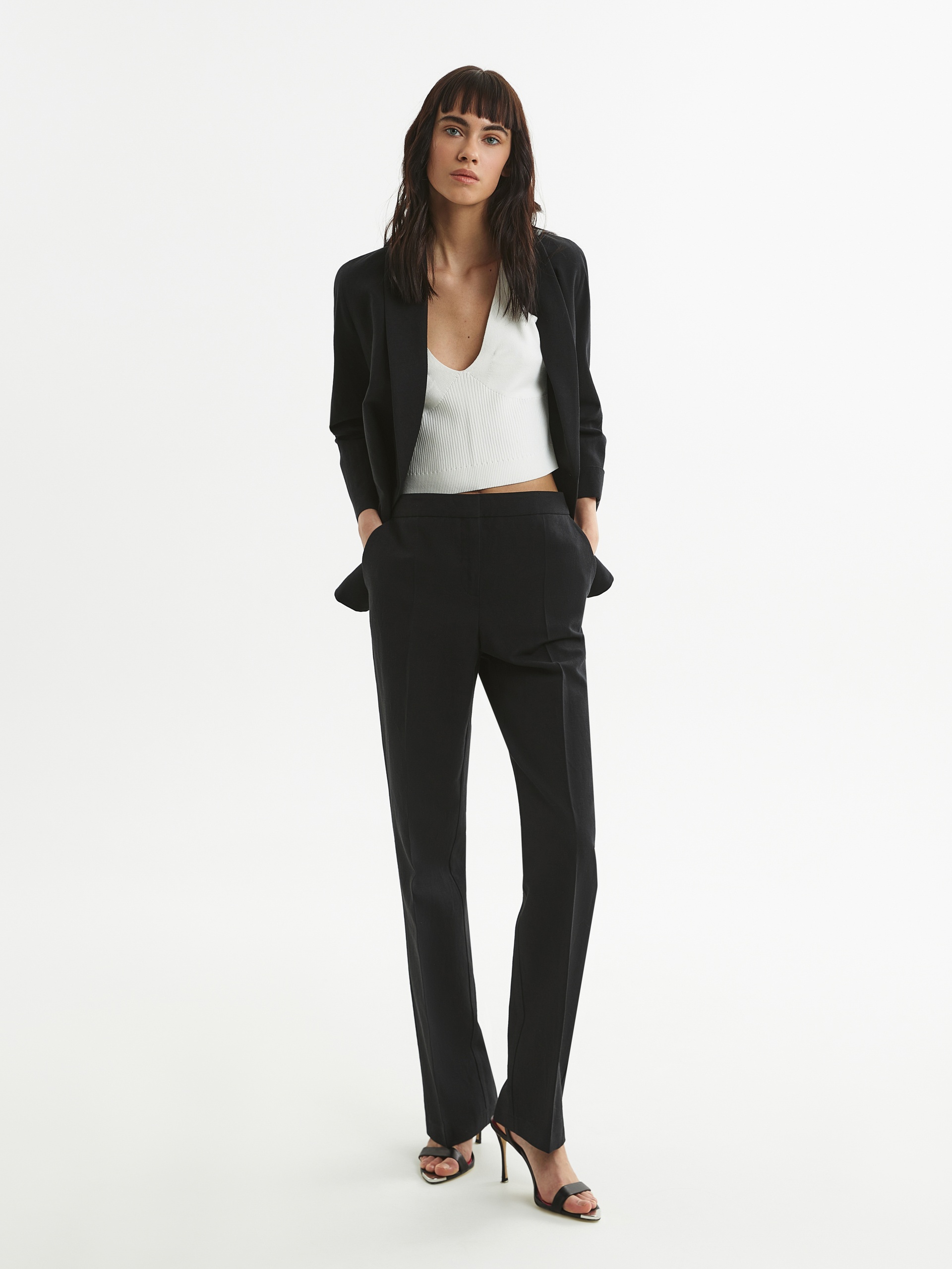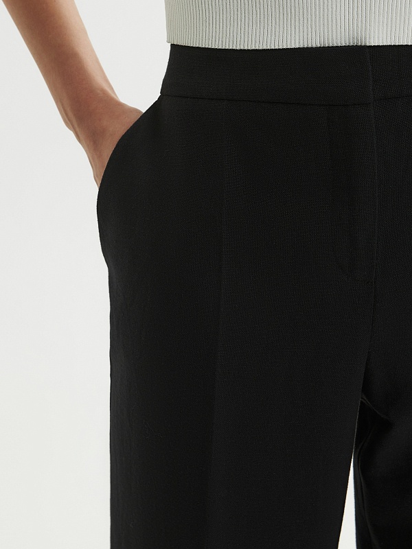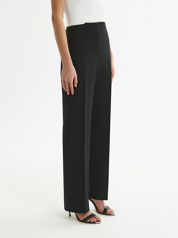 Элегантные брюки прямого силуэта со стрелками на притачном поясе. Застежка спереди на молнию. Карманы в боковых швах.