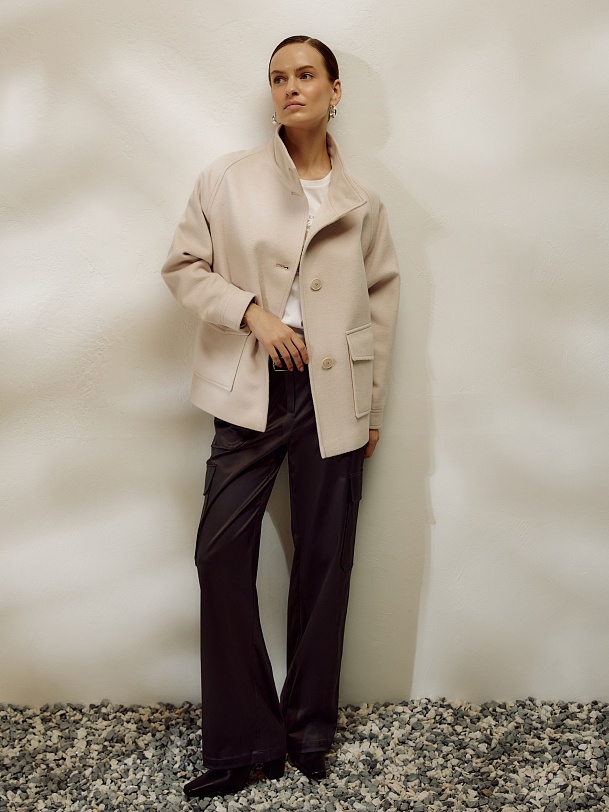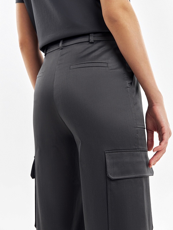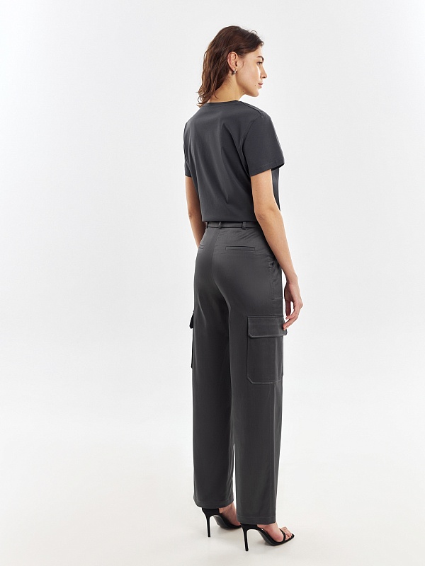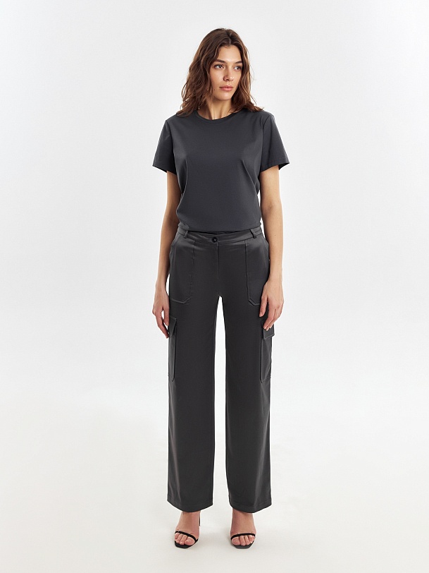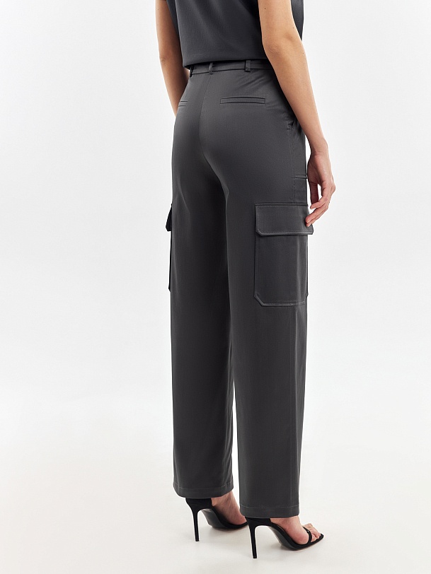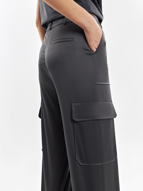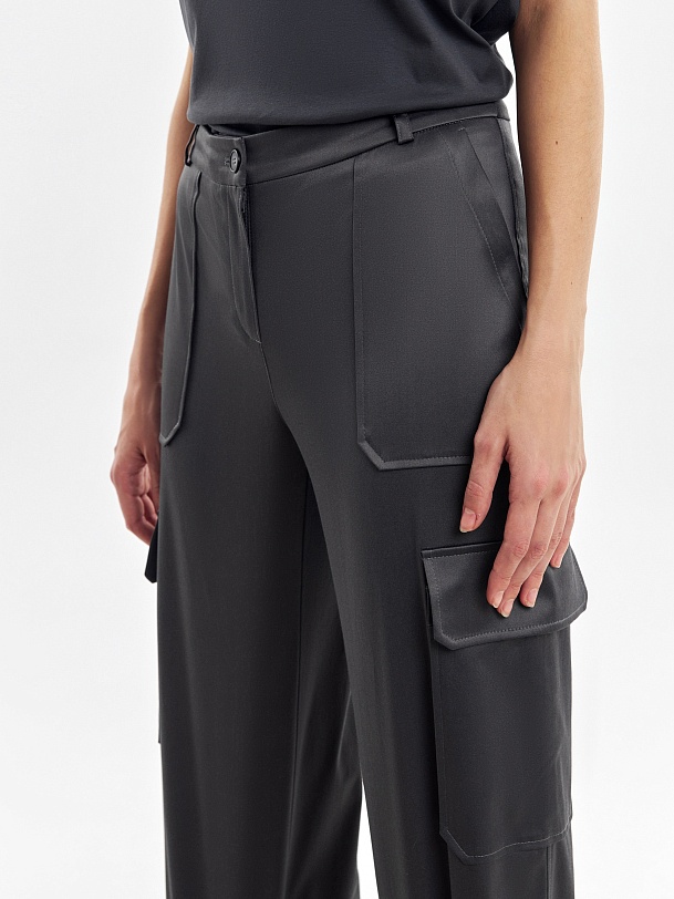 Прямые широкие брюки карго с большими накладными карманами с клапанами, на притачном поясе со шлевками и двумя прорезными карманами сзади. Брюки выполнены из плотной атласной ткани в благородном сером цвете.