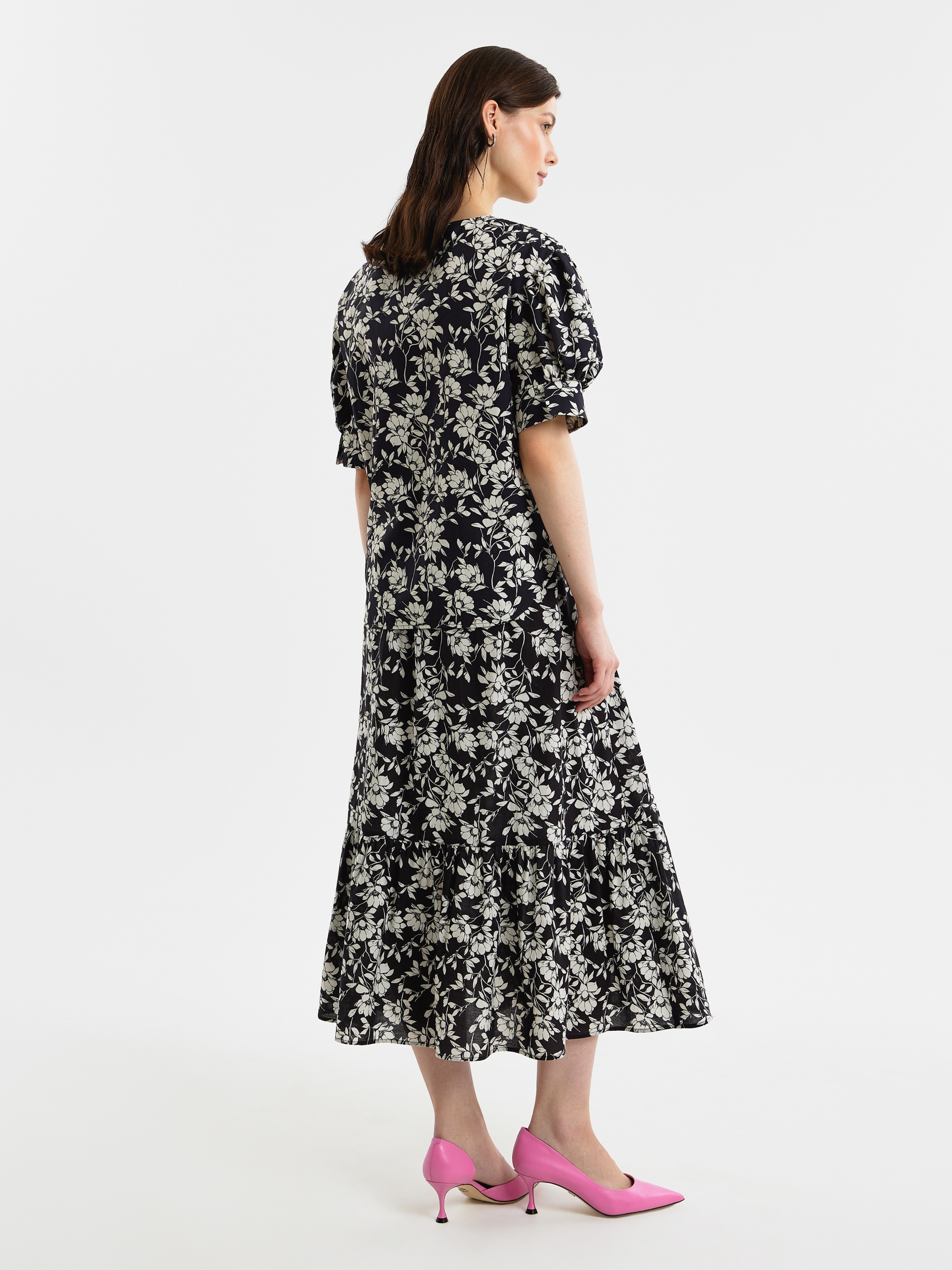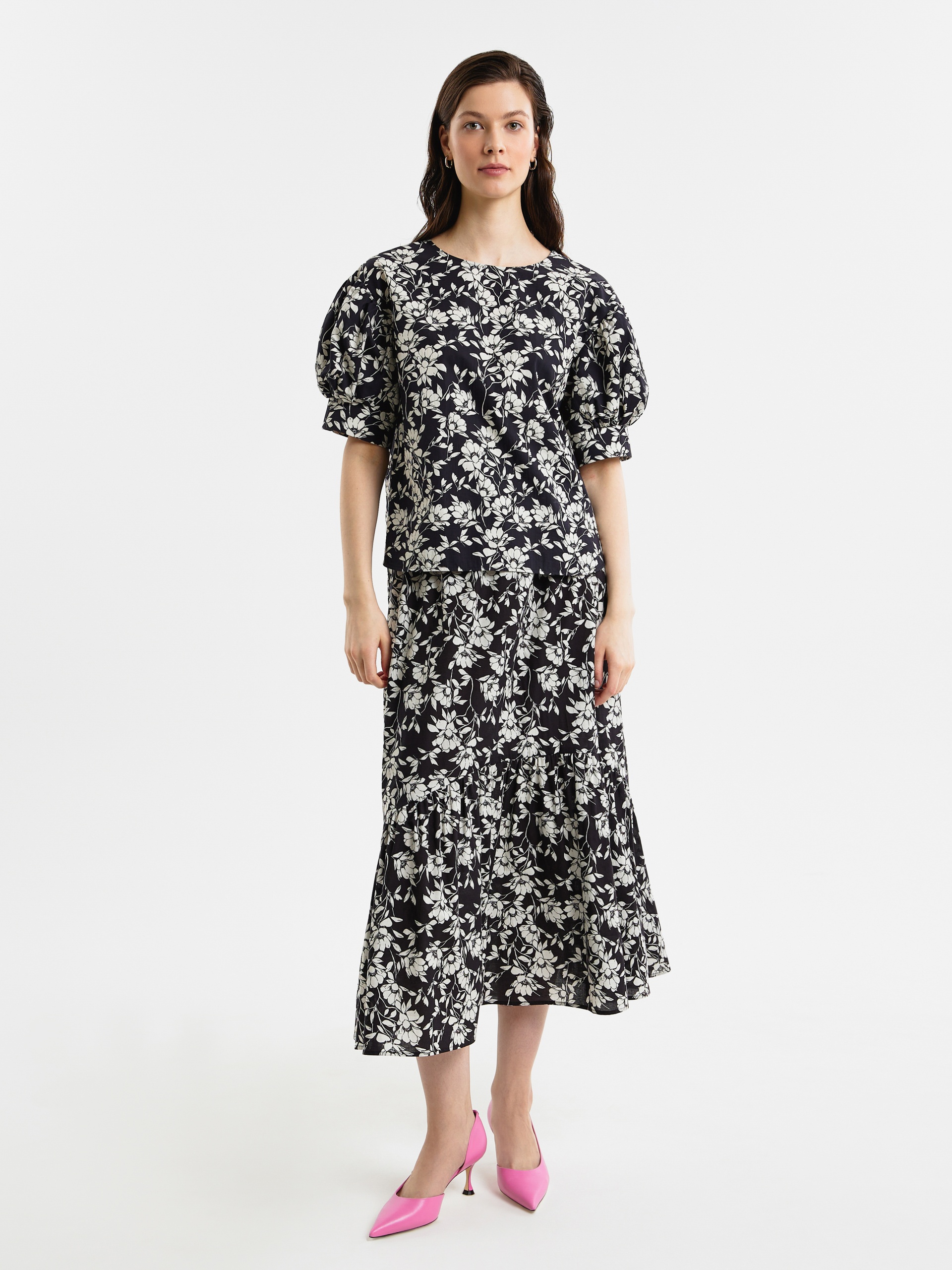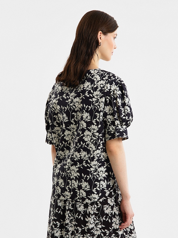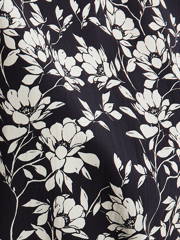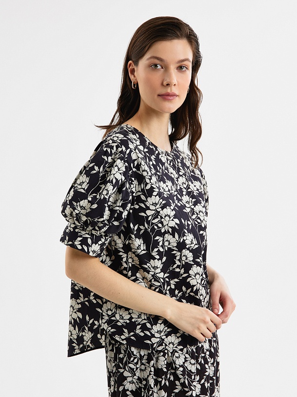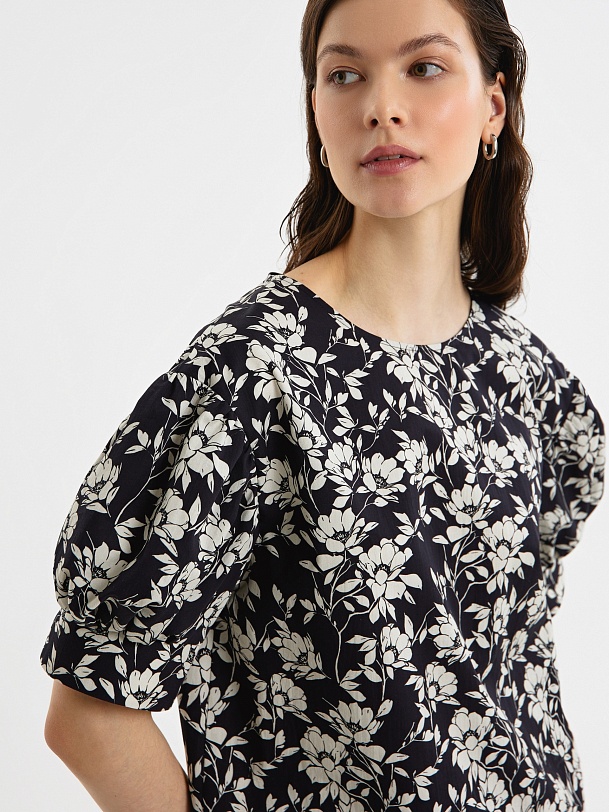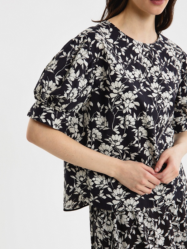 Свободная блуза из принтованной хлопковой ткани в черно-белом цветочном принте с круглой горловиной и спущенной линией плеча. Рукава фонарики на широком манжете без пуговиц. Низ блузки с закругленными краями и разной длины, по бокам небольшие разрезы.