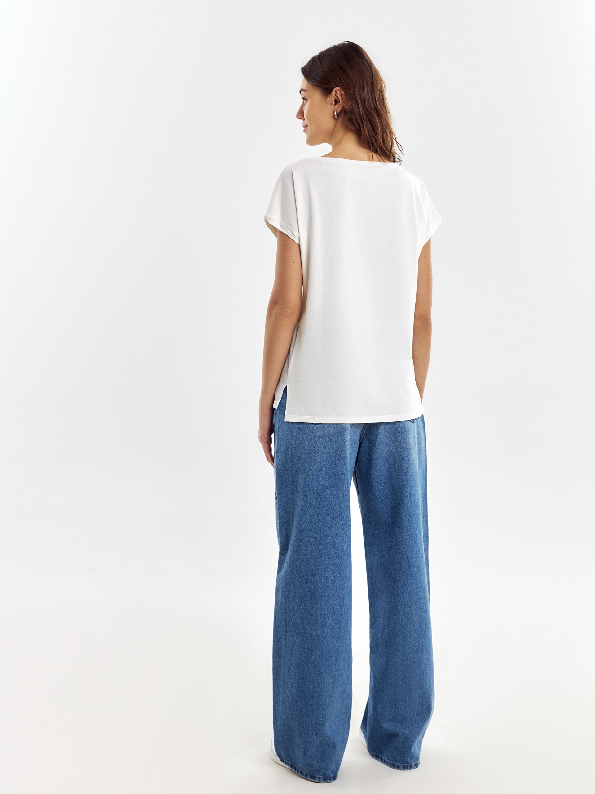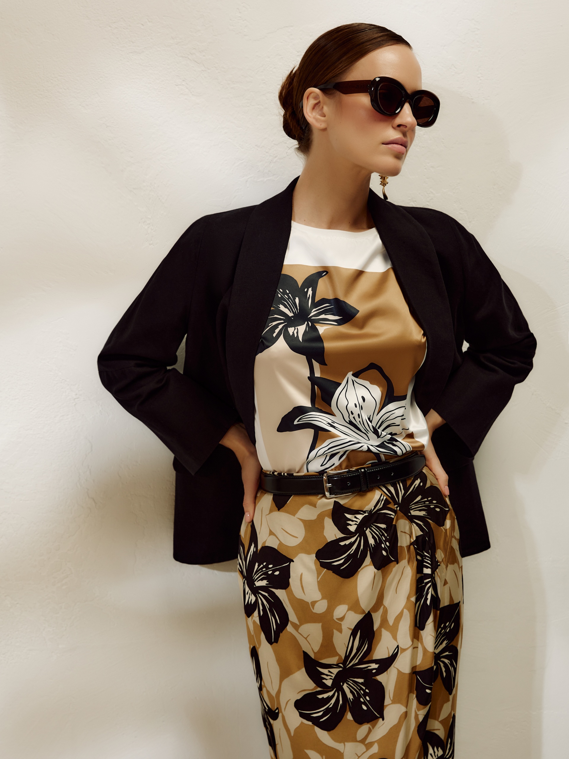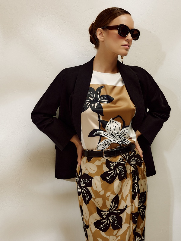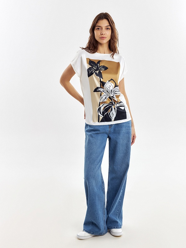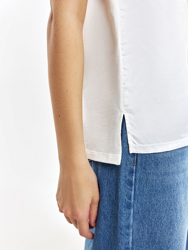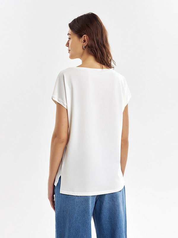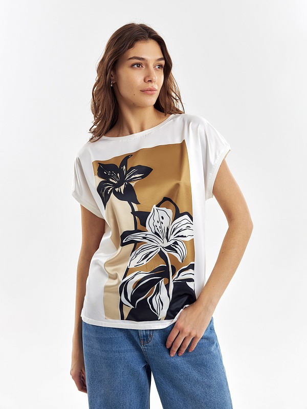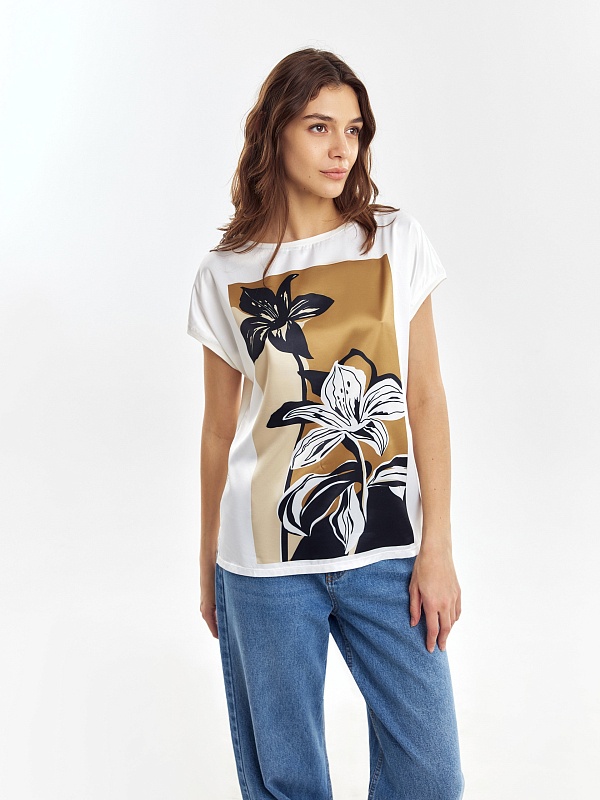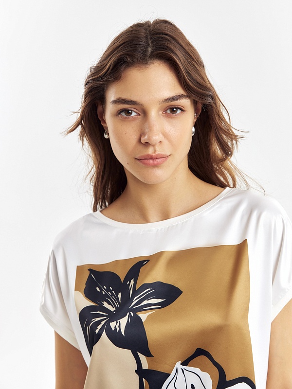 Блуза в стиле смарт-кэжуал, прямого силуэта. Вырез горловины-лодочка. Рукав кимоно. Полочка из атласной белой ткани с монопринтом. Спинка из трикотажного полотна.