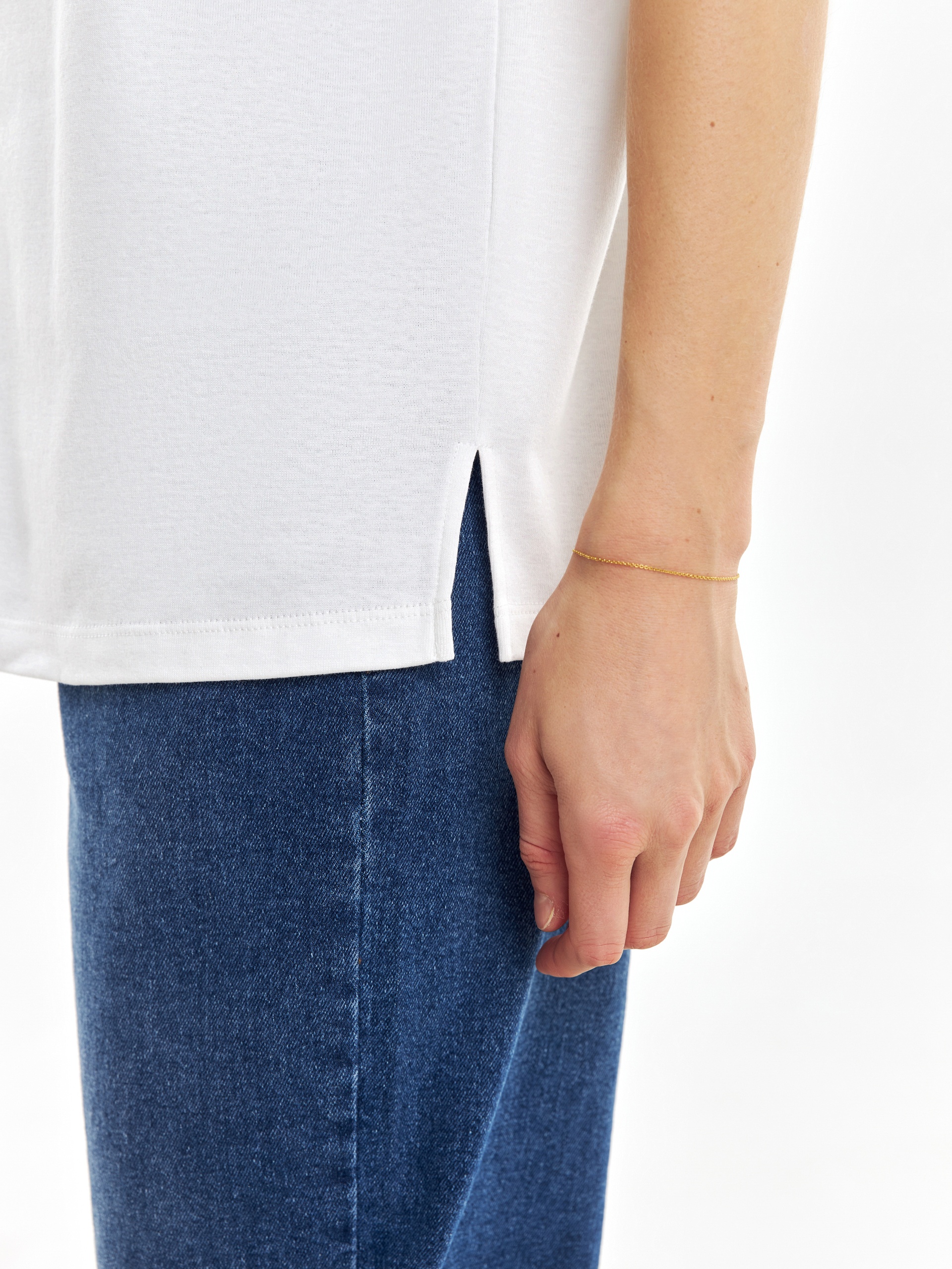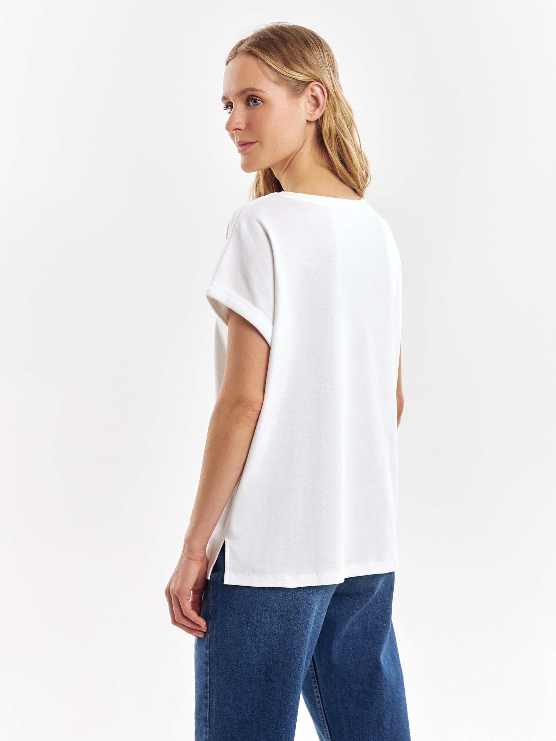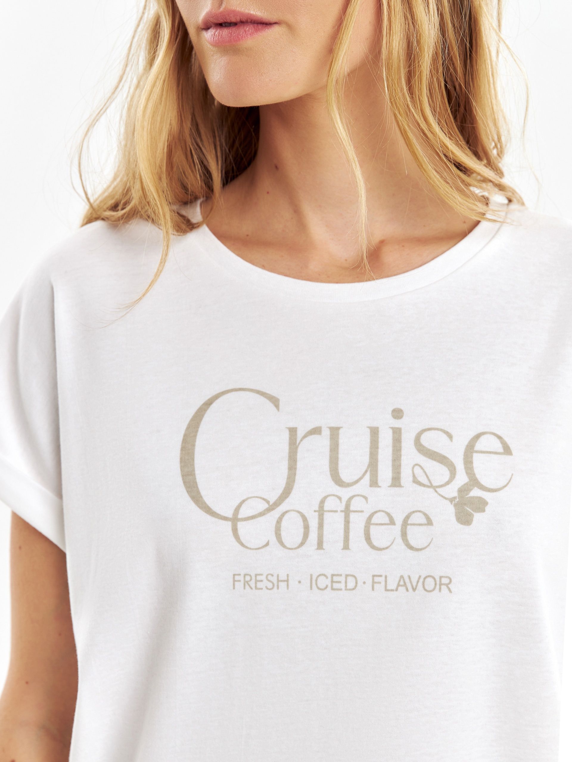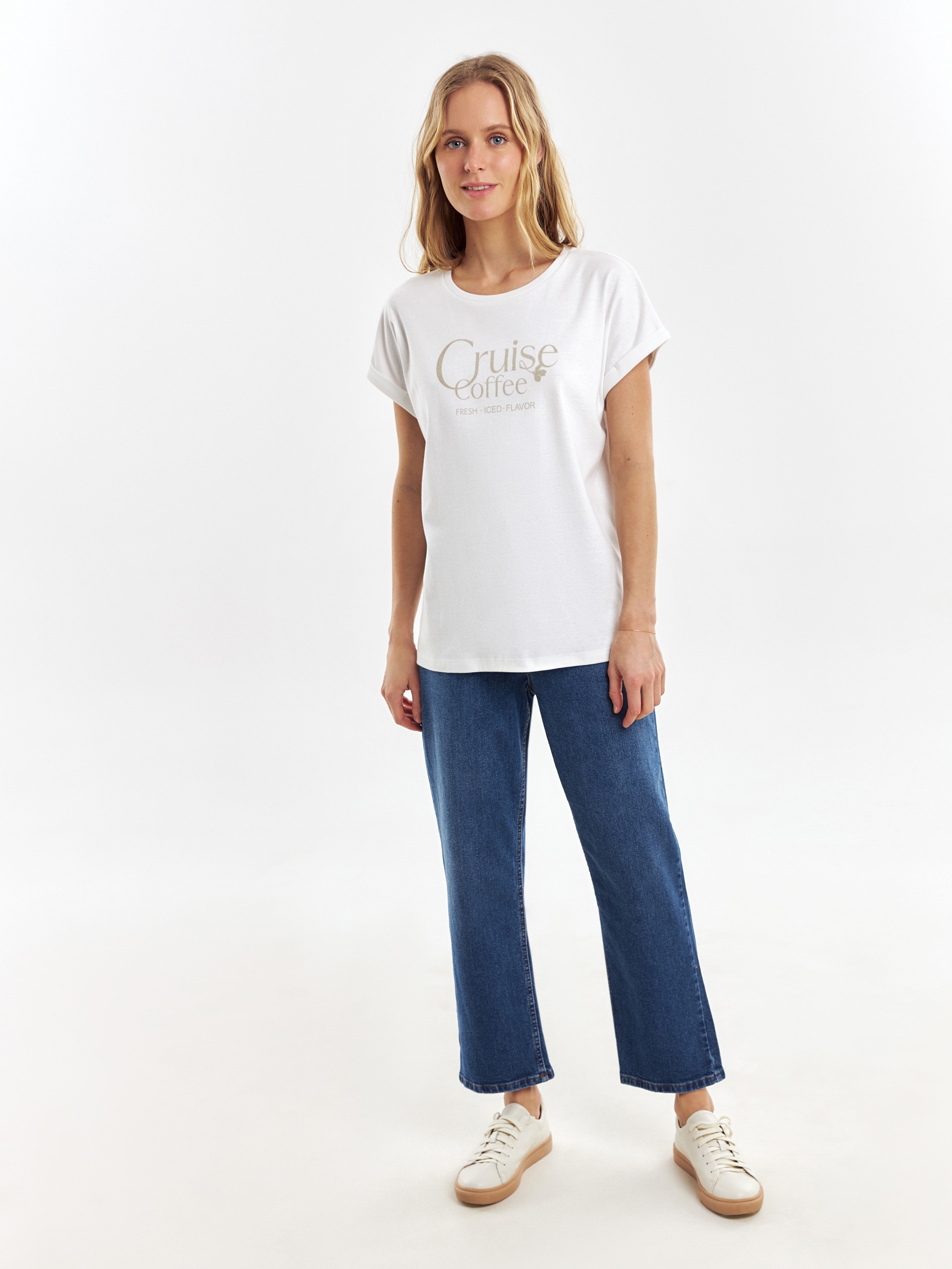 Футболка из премиального мерсеризированного хлопка, с разрезами по бокам, свободного кроя и с принтом на полочке. Мерсеризированный хлопок имеет шелковистый блеск и не деформируется после стирок, практически не мнется и не выцветает со временем.