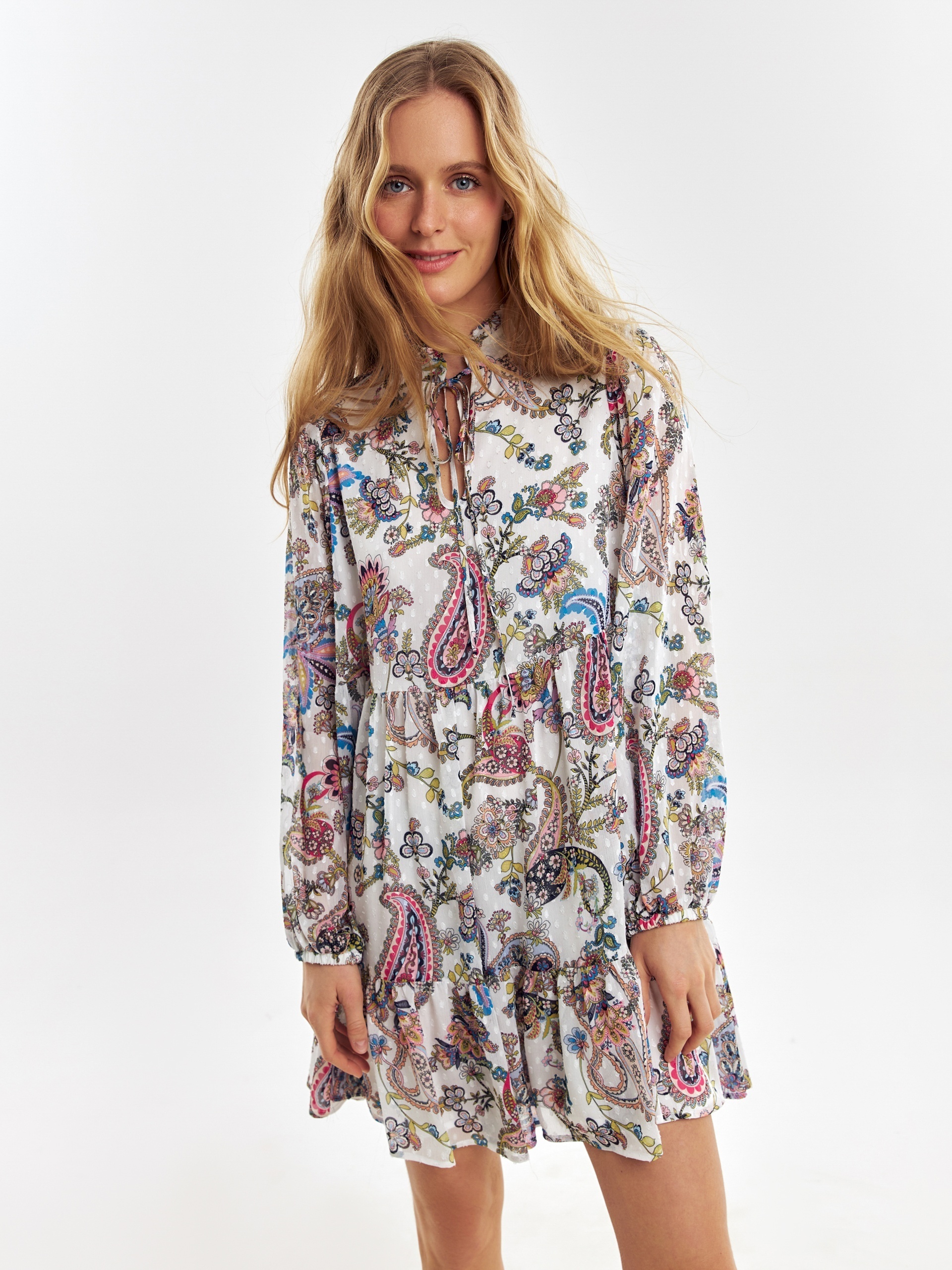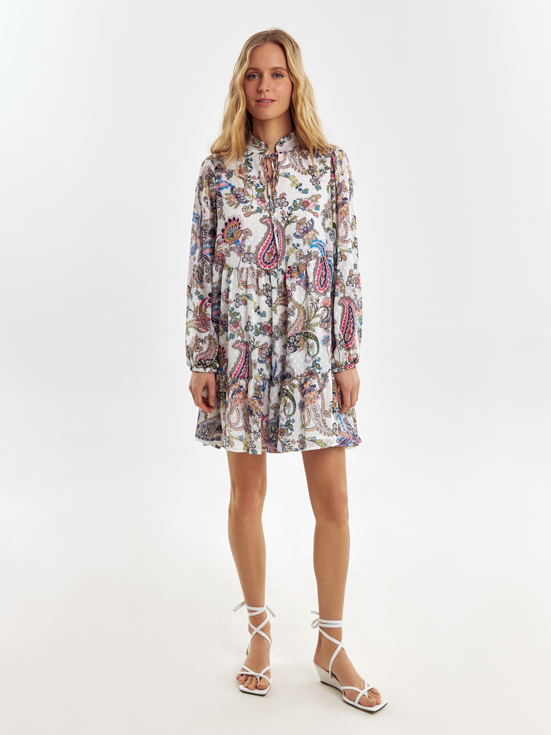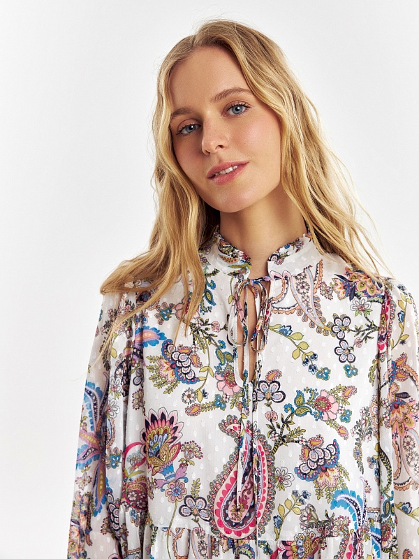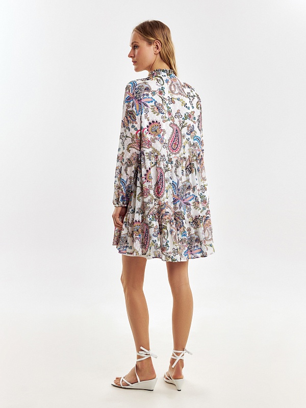 Свободное платье в романтическом стиле с этническими мотивами, длиной до колена. Платье отрезное по талии с двумя ярусами воланов. Горловина обработана стойкой со сборкой, вырез платья щелевидной формы с завязками из основной ткани. Романтичные рукава-буфы полной длины, резинка в манжете создает дополнительный объем.