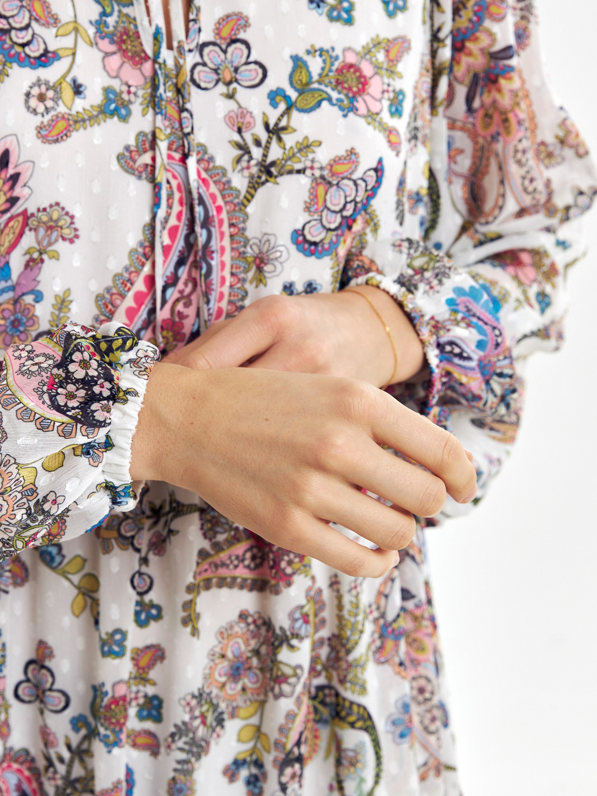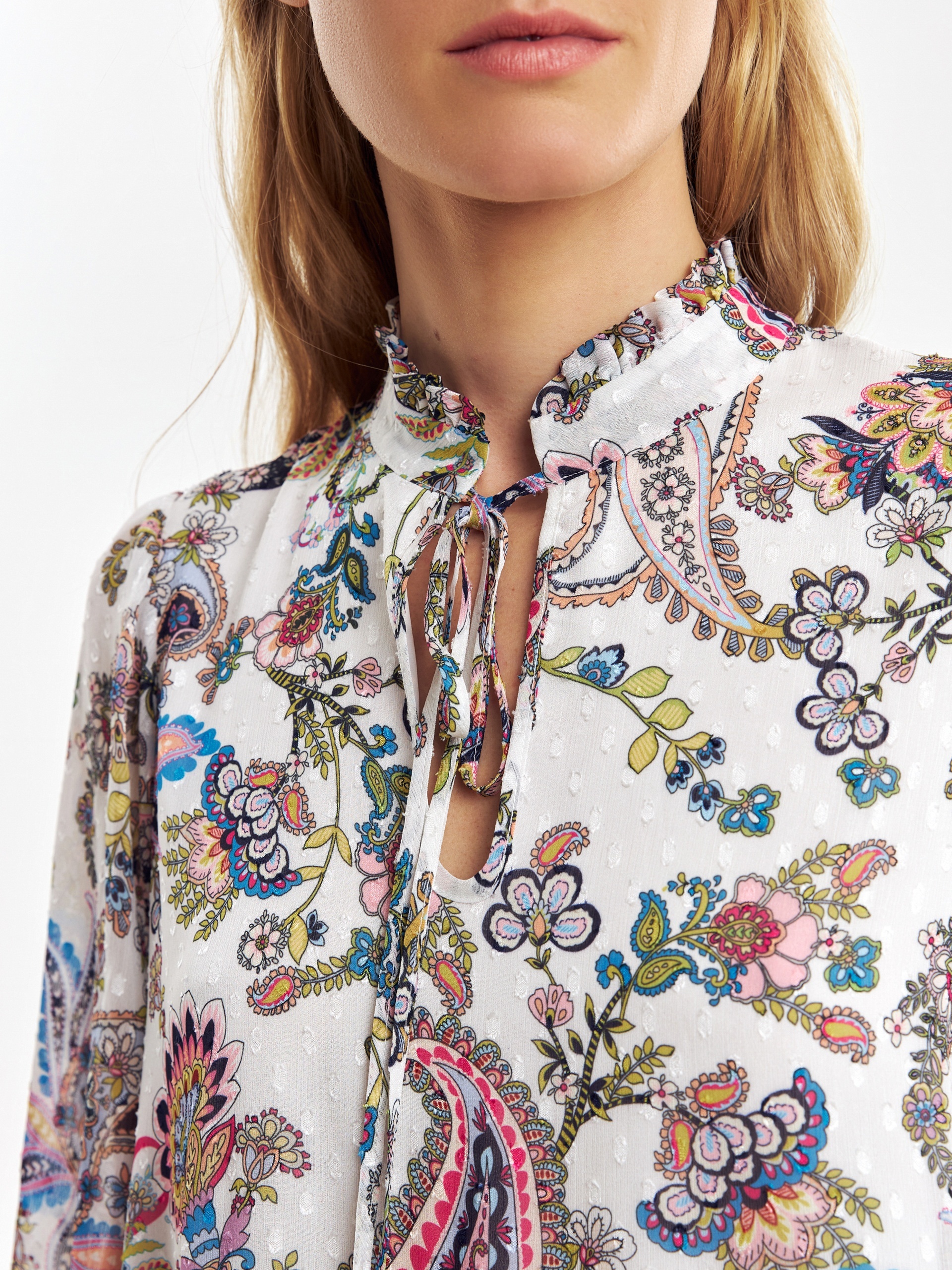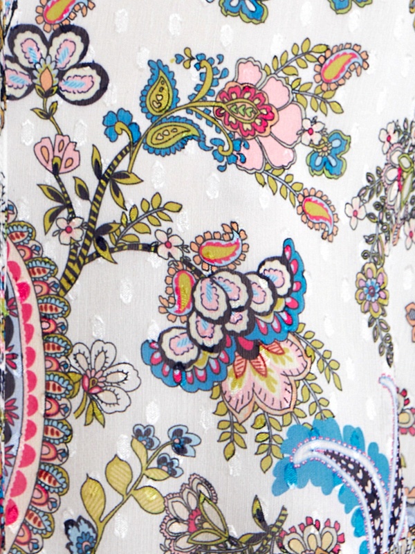 Свободное платье в романтическом стиле с этническими мотивами, длиной до колена. Платье отрезное по талии с двумя ярусами воланов. Горловина обработана стойкой со сборкой, вырез платья щелевидной формы с завязками из основной ткани. Романтичные рукава-буфы полной длины, резинка в манжете создает дополнительный объем.