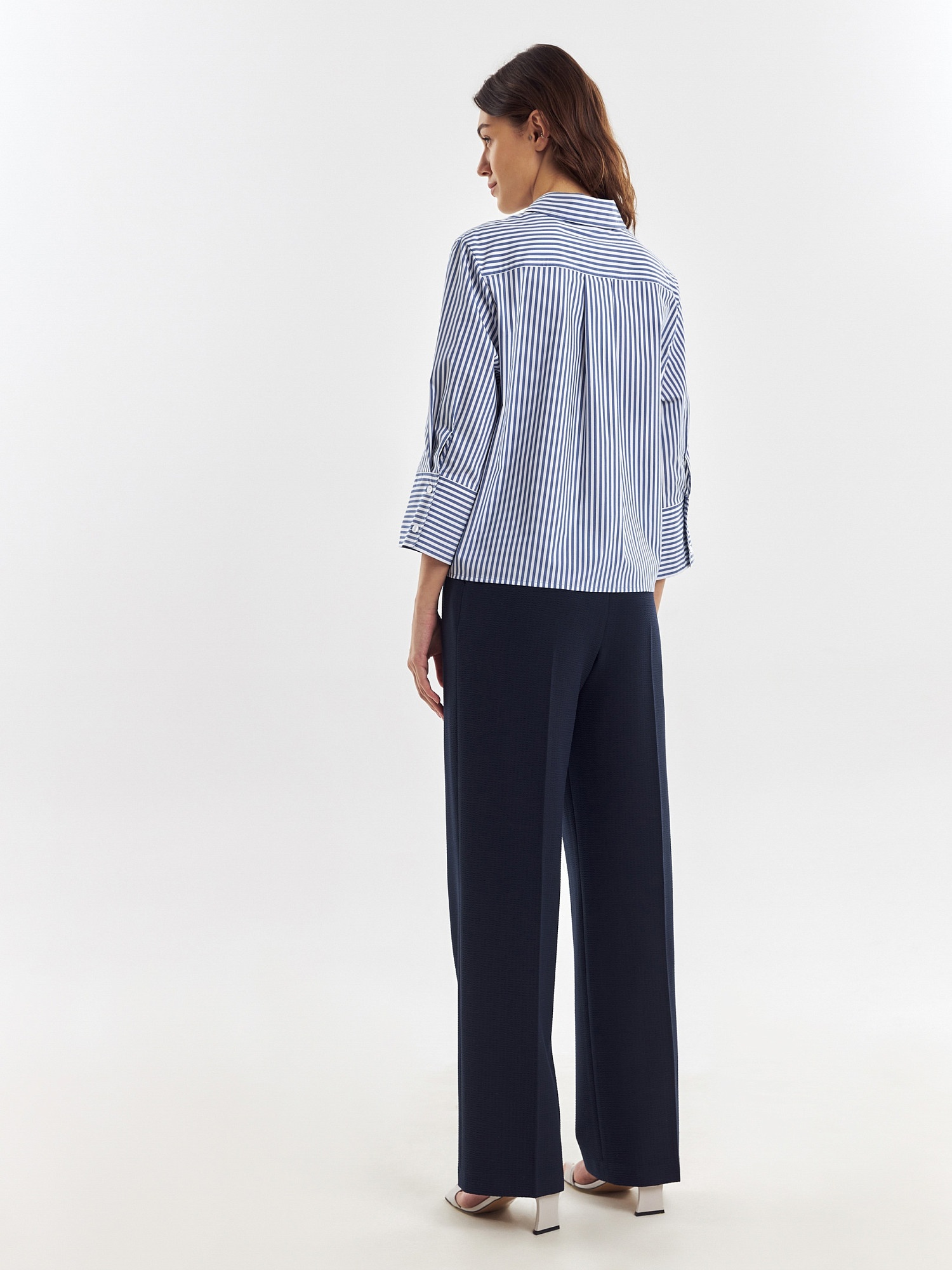Свободная прямая блуза в голубую полоску до линии бедер с прямым рукавом на широком манжете. Классический отложной воротник и планка с пуговицами. На спинке кокетка с бантовой складкой.