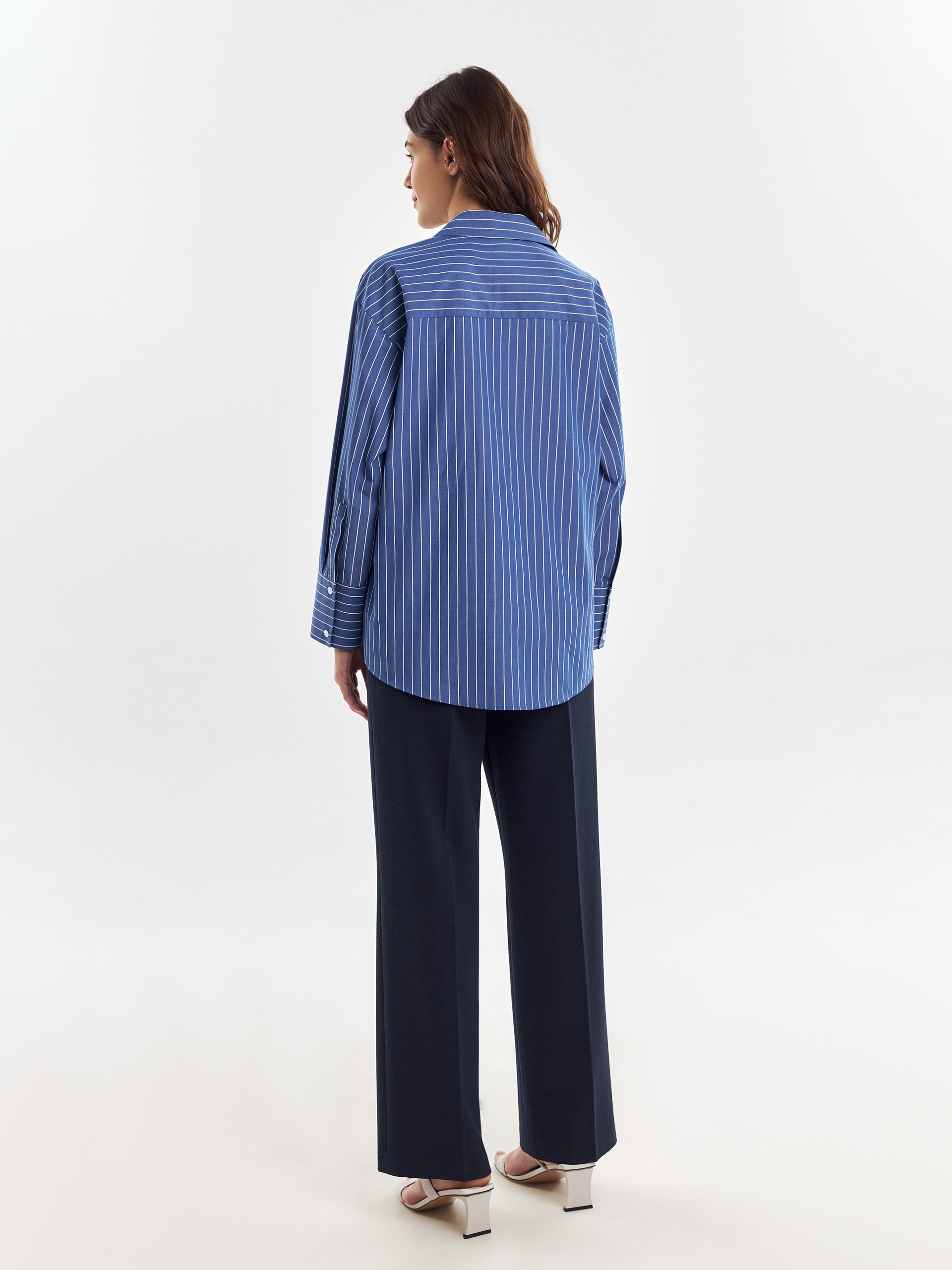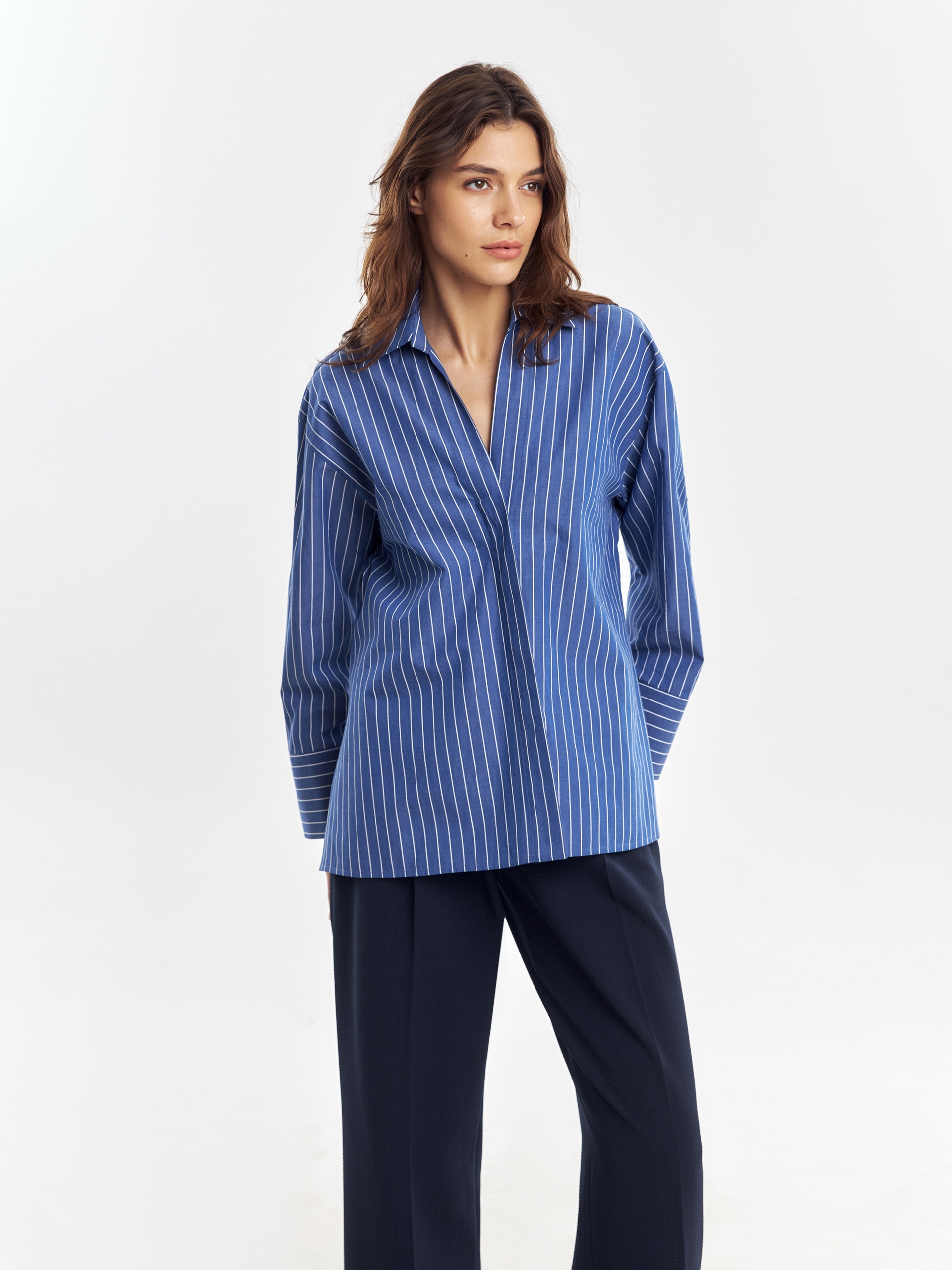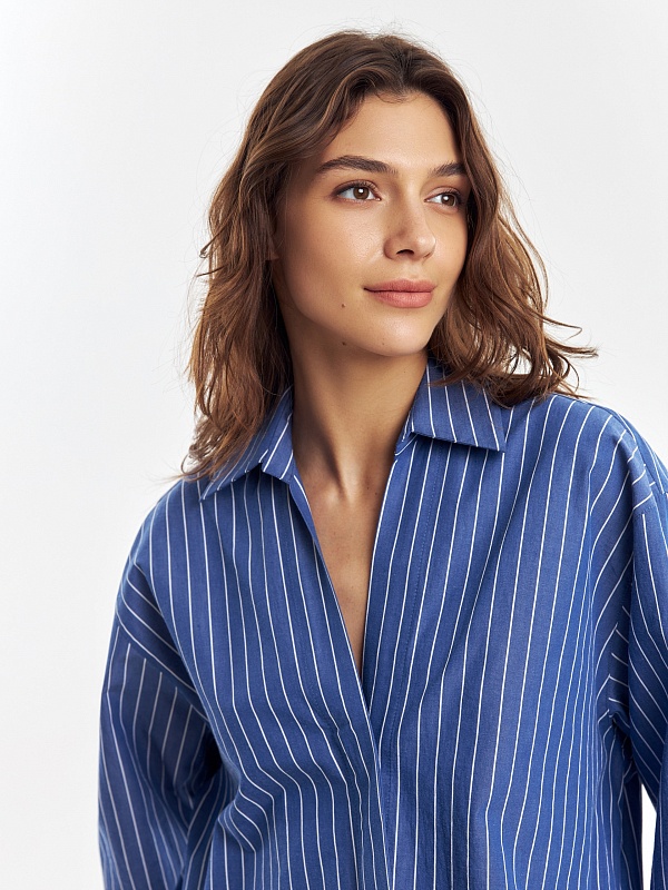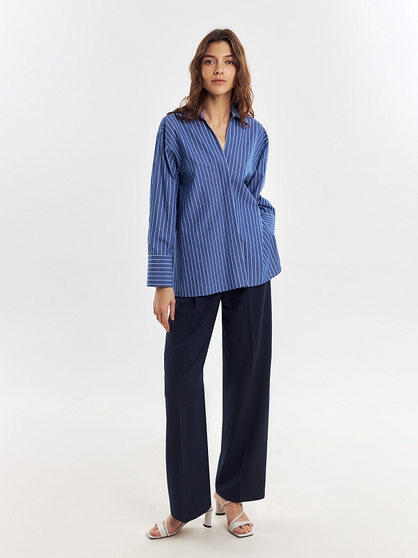 Свободная блуза с классическим отложным воротником из хлопковой ткани в тонкую молочную полоску. Рукава и манжеты широкие на пуговицах. На спинке кокетка.