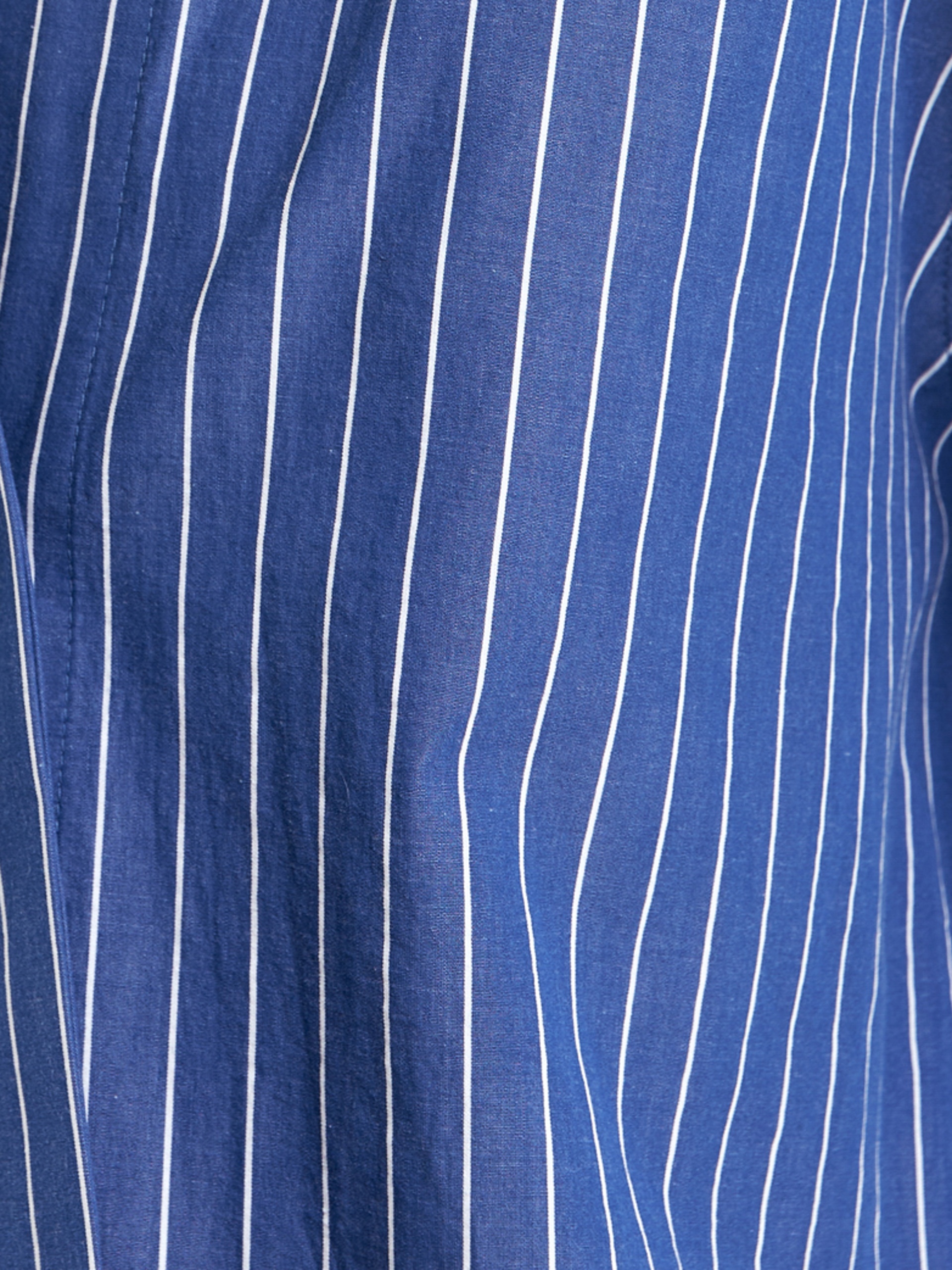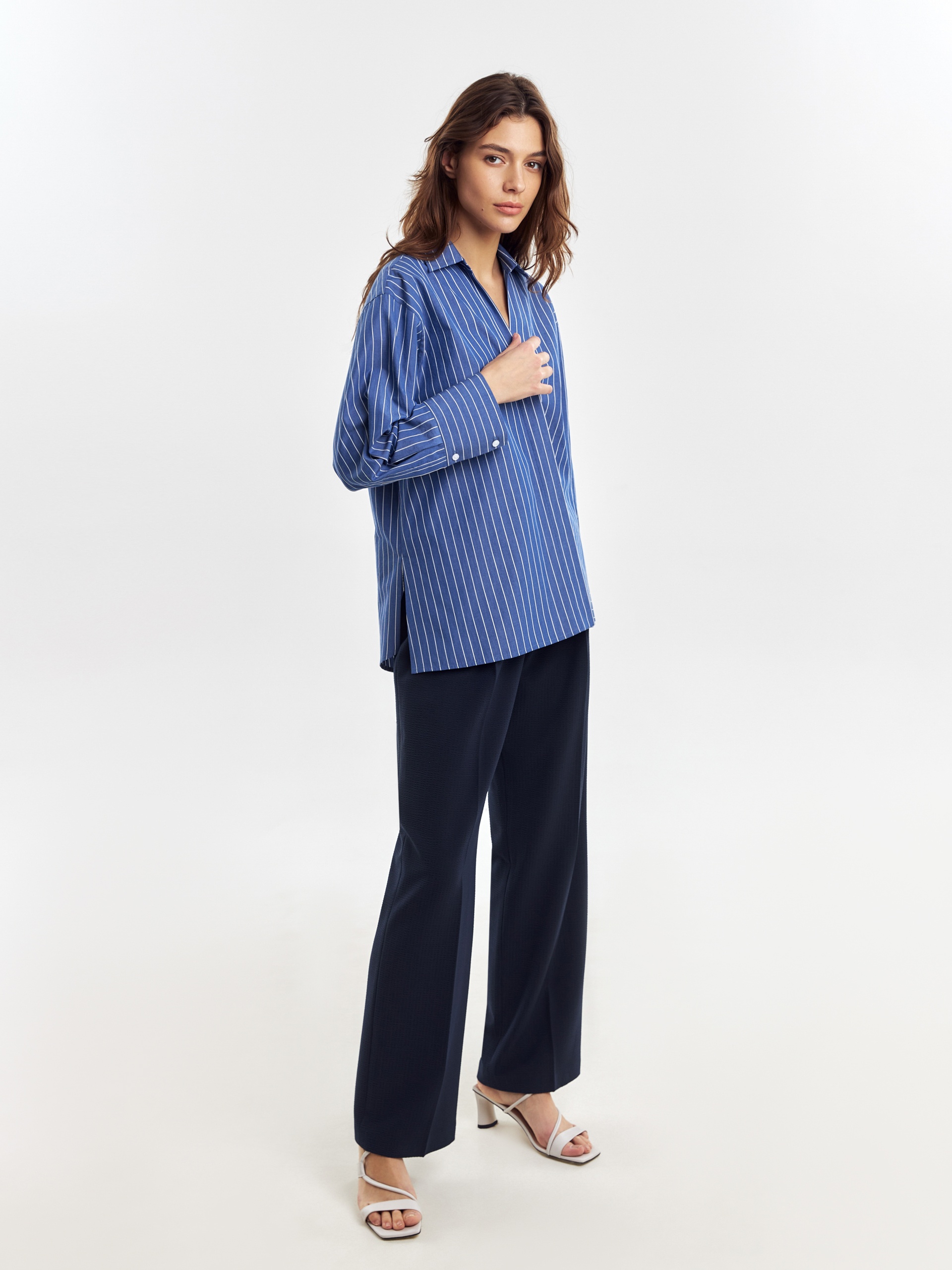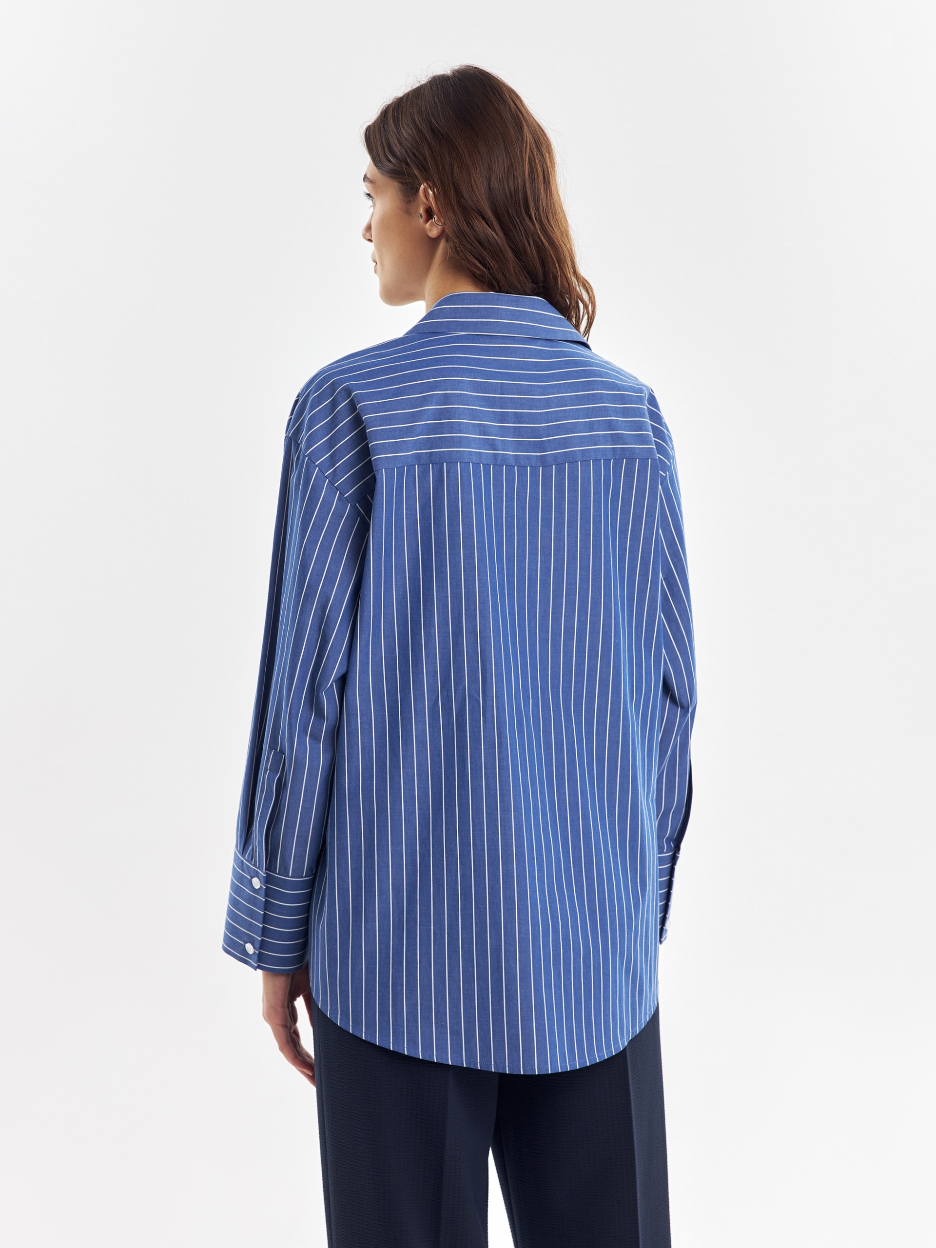 Свободная блуза с классическим отложным воротником из хлопковой ткани в тонкую молочную полоску. Рукава и манжеты широкие на пуговицах. На спинке кокетка.
