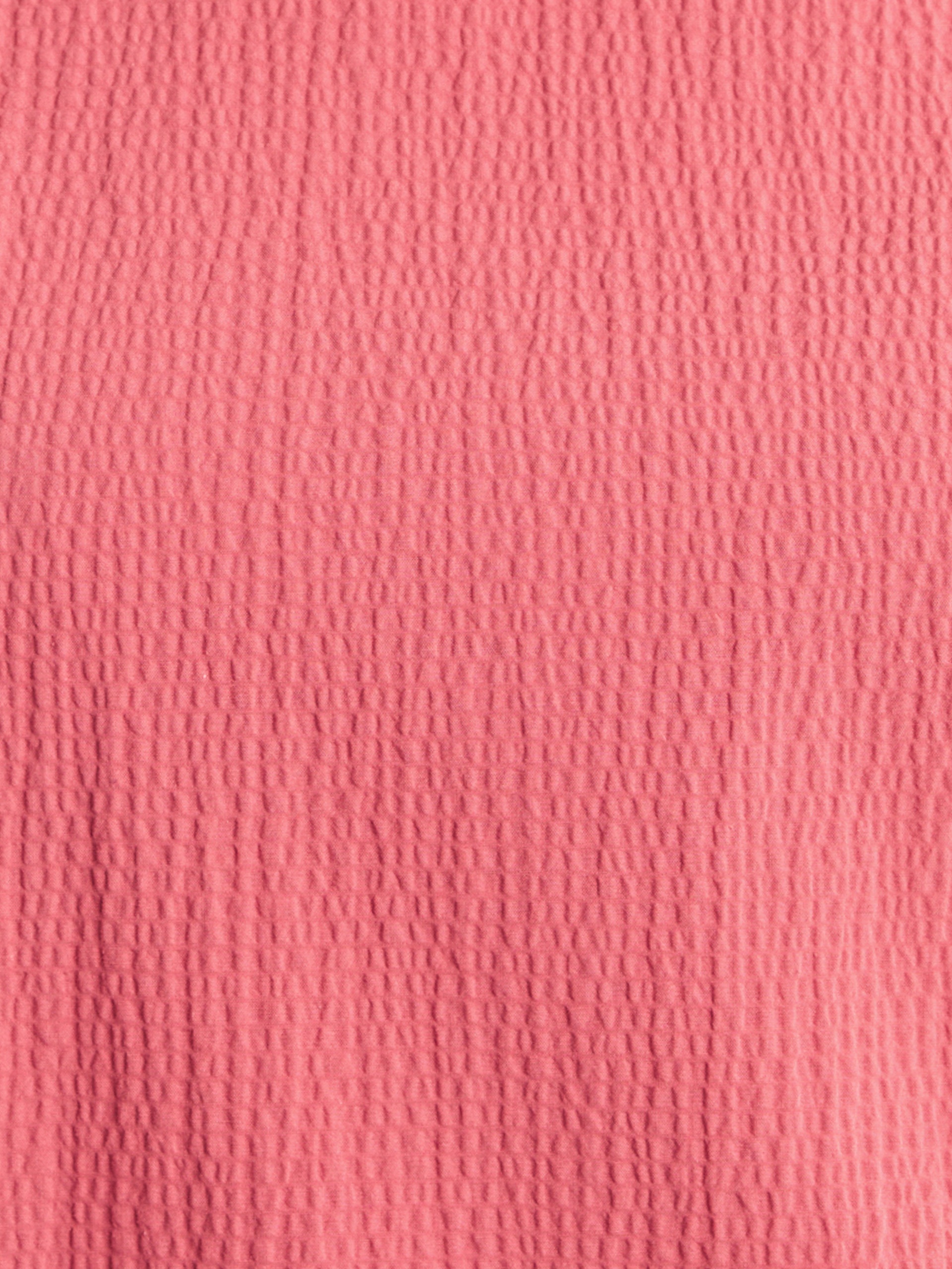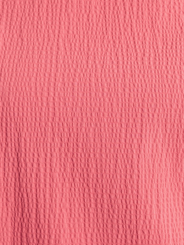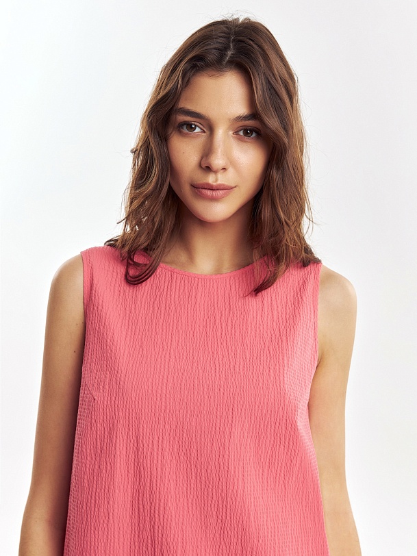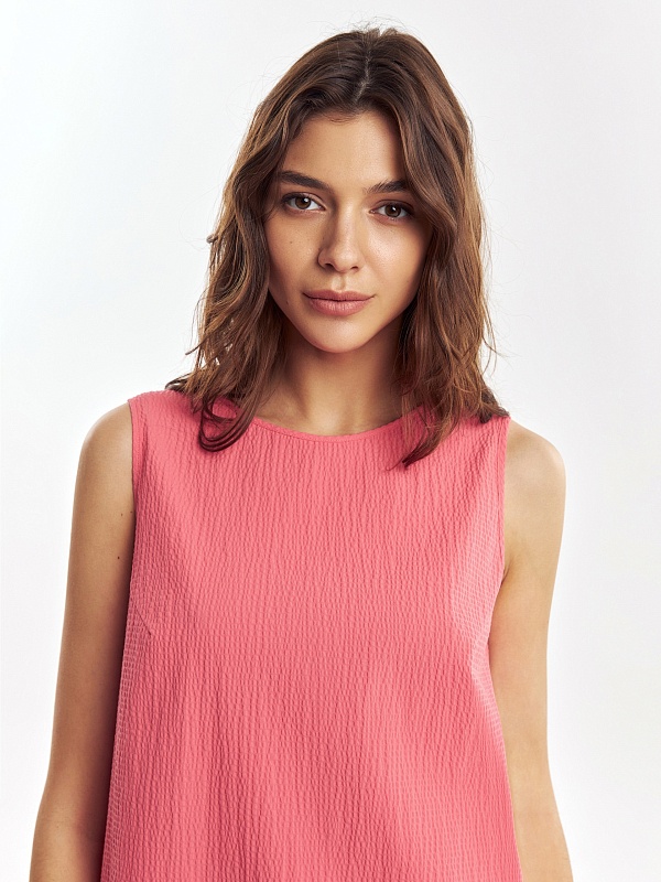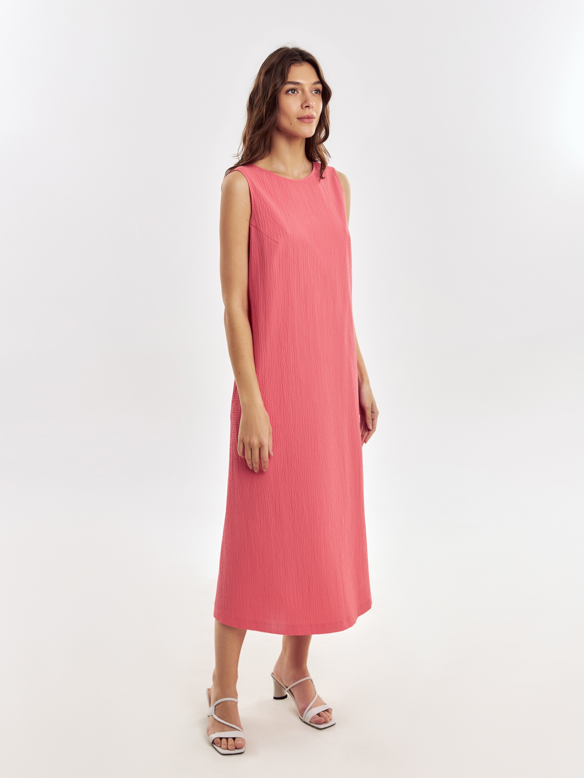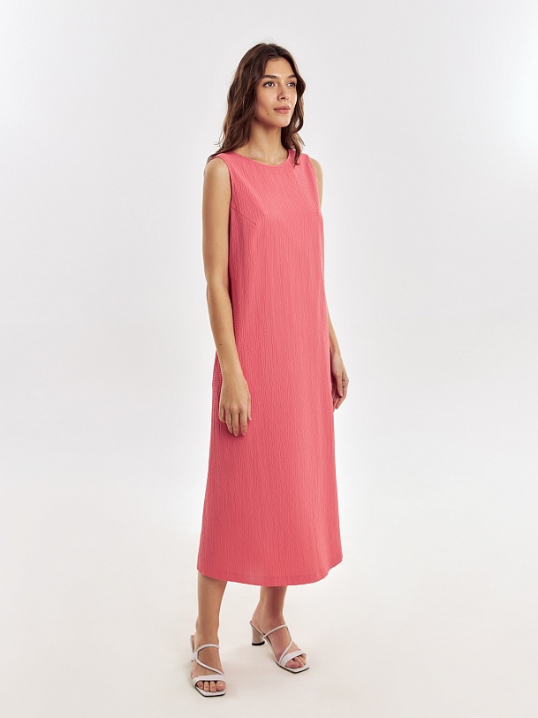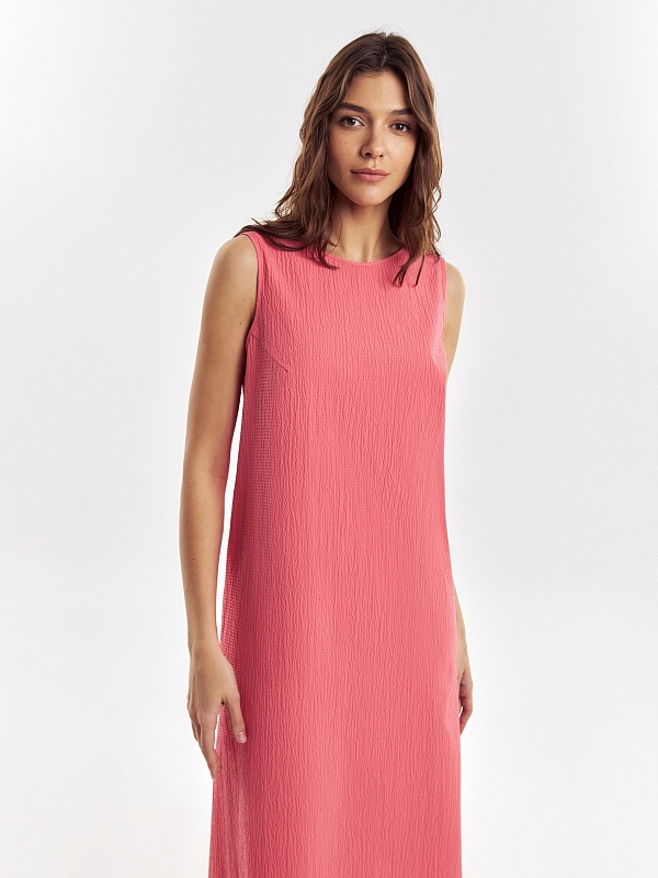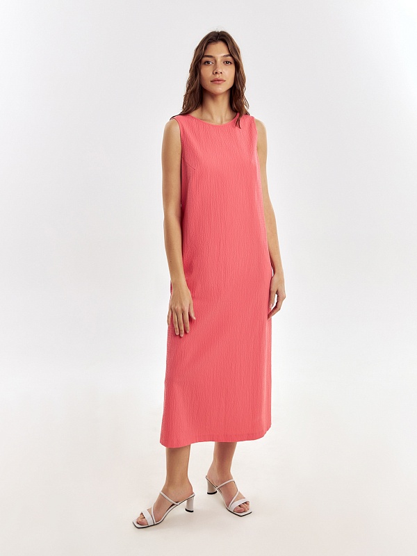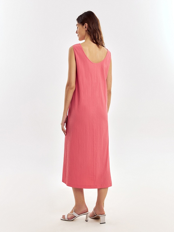 Свободное платье из фактурной хлопковой ткани кораллового цвета, силуэта трапеция с круглой горловиной и углубленным вырезом на спине. С карманами в швах.