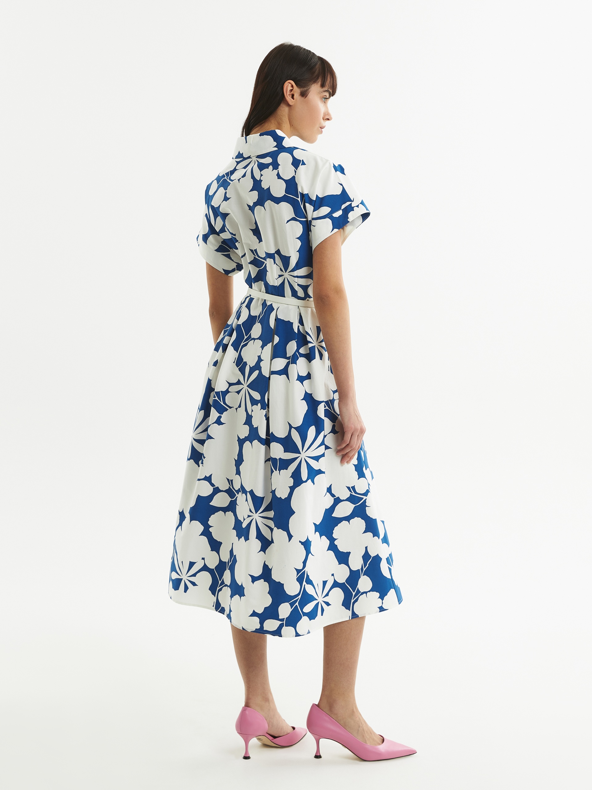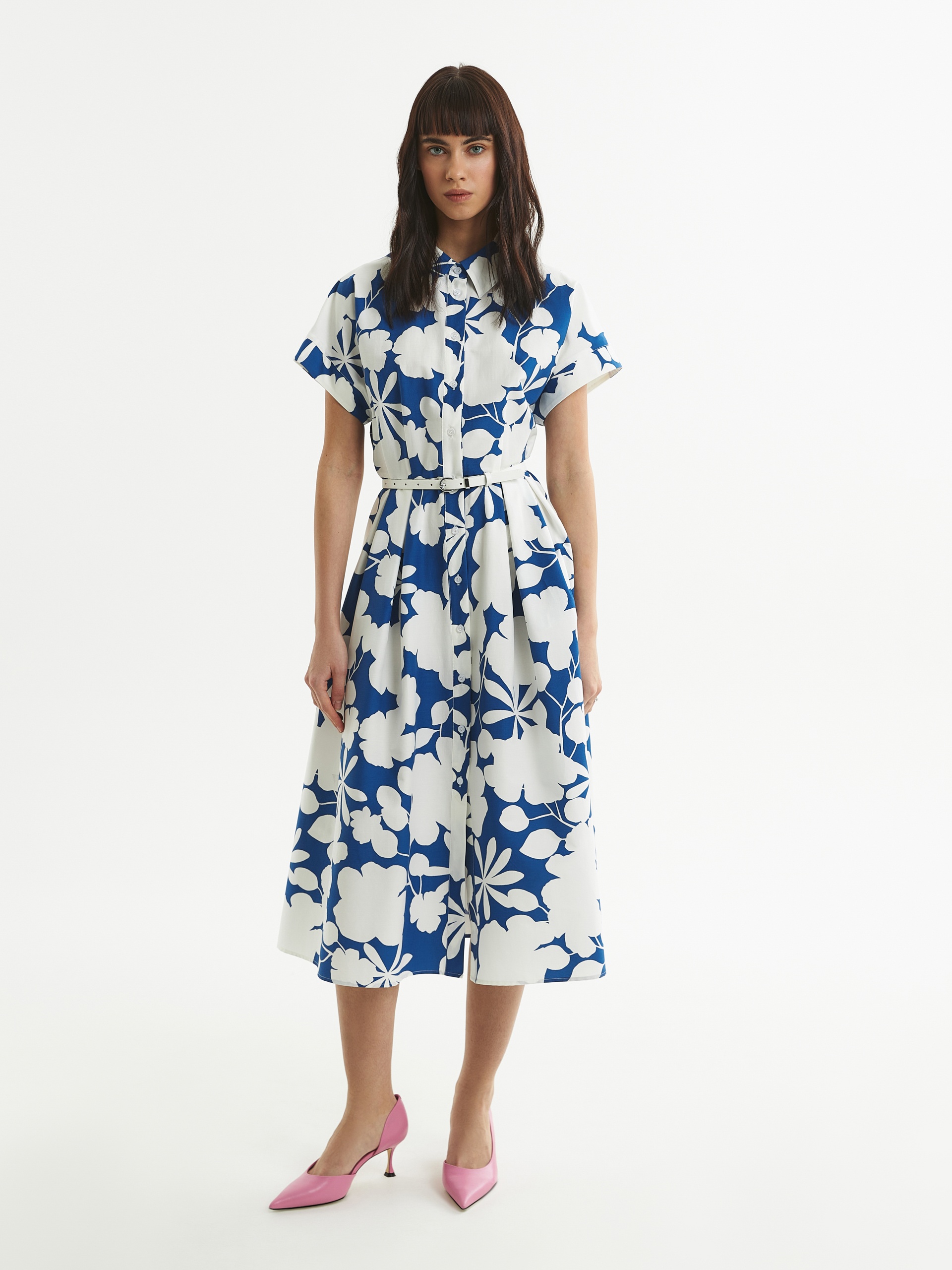 Женственное платье из хлопковой ткани с контрастным бело-синем цветочным принтом, приталенного силуэта с пышной юбкой со складками, расширенной к низу. Воротник классический отложной, рукав короткий кимоно, застежка спереди на пуговицы. В боковых швах рабочие карманы. В комплект входит тонкий белый ремень из экокожи.