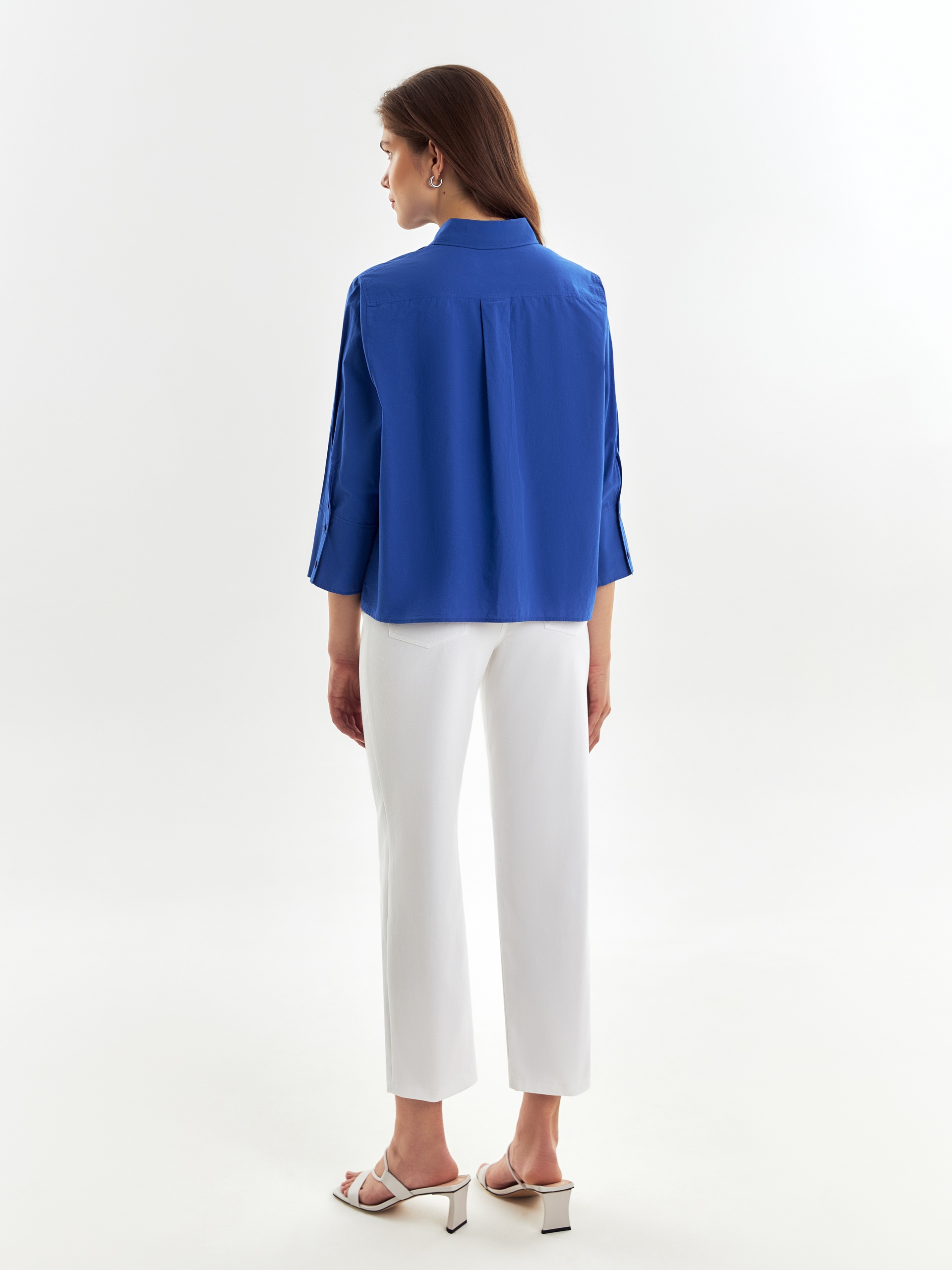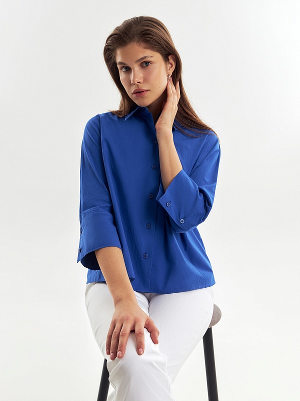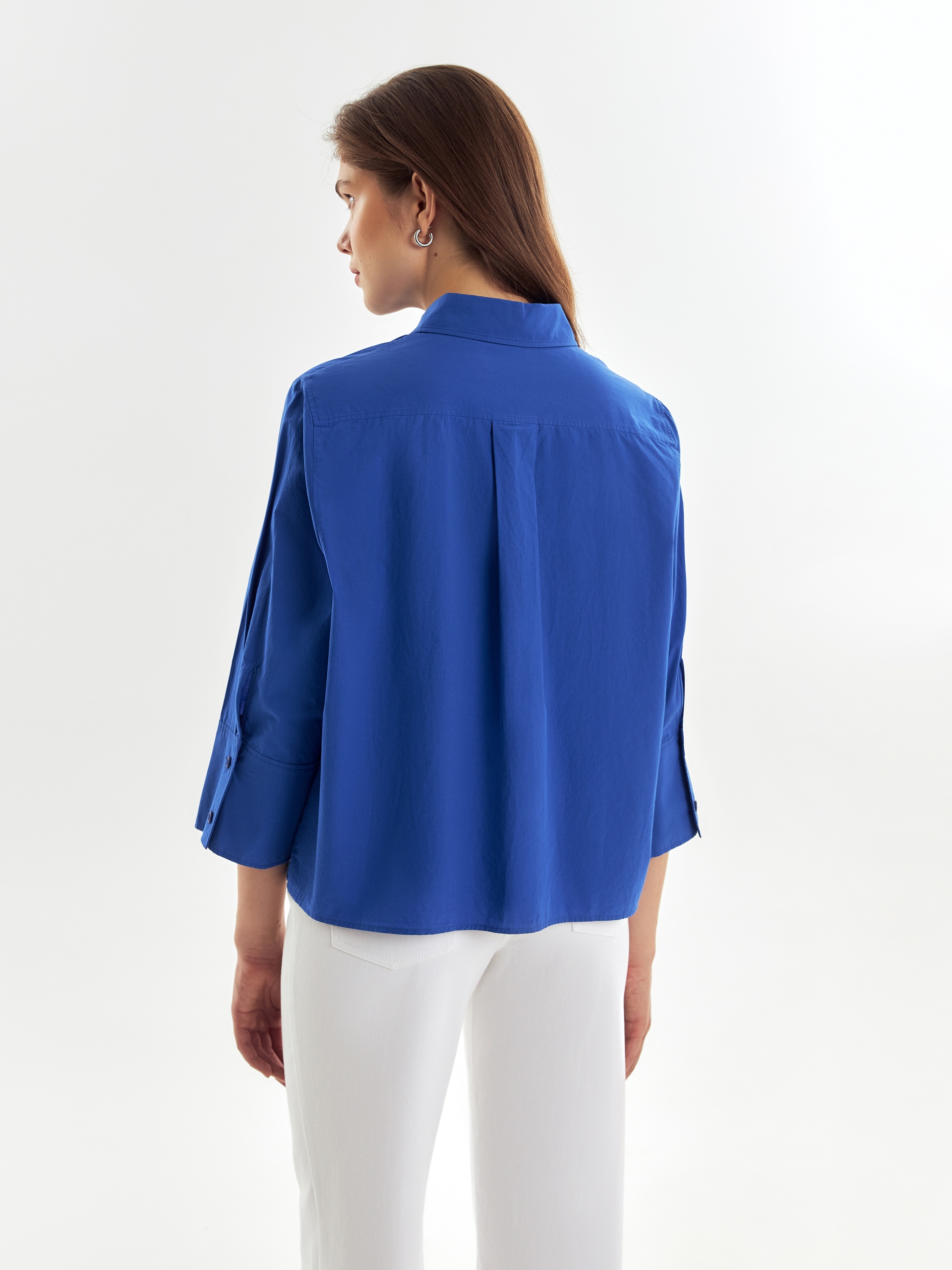 Прямая свободная чуть укороченная блуза из хлопковой ткани с классическим отложным воротником и планкой на пуговицы. Блуза с широким рубашечным рукавом 3/4. На спинке кокетка с бантовой складкой.