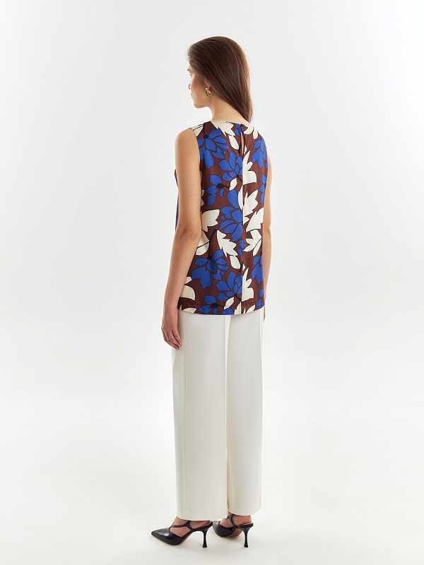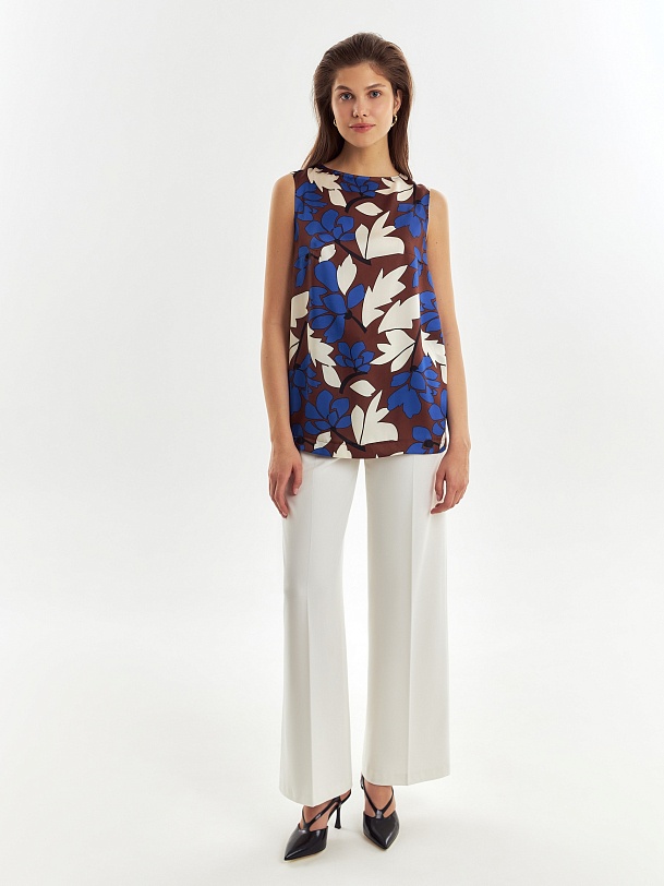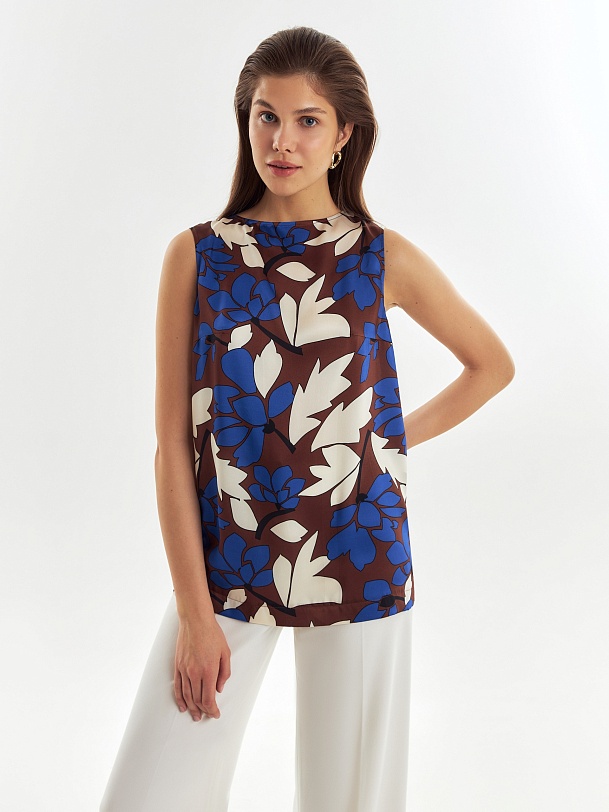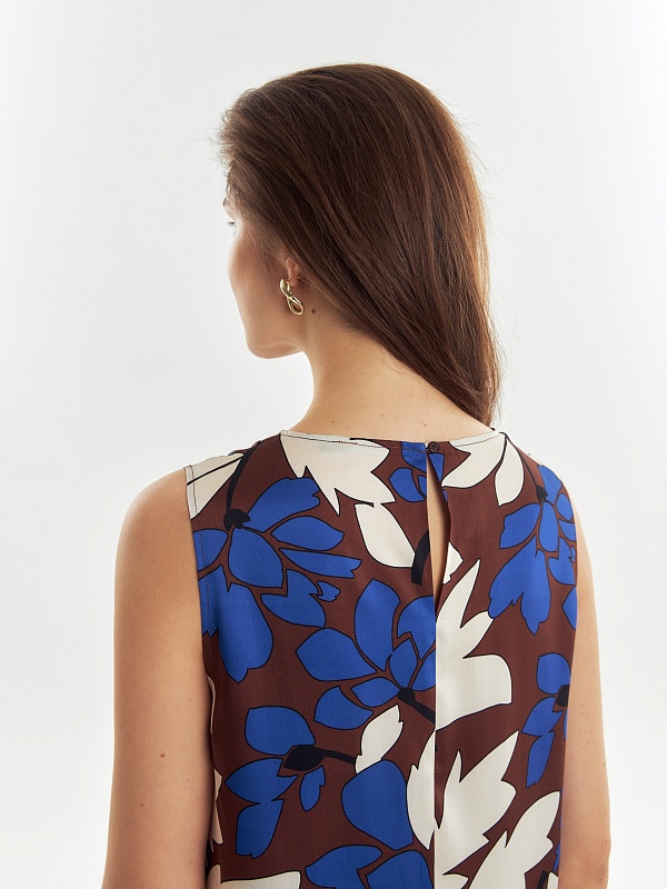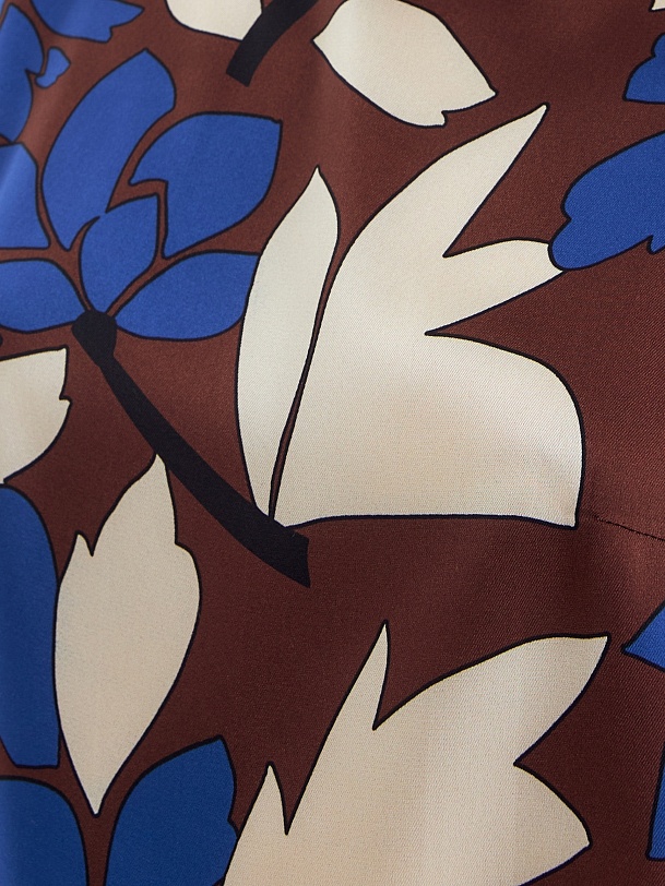 Свободная блуза расклешенная к низу с круглой горловиной. Блуза из плательной ткани с крупным цветочном принтом.