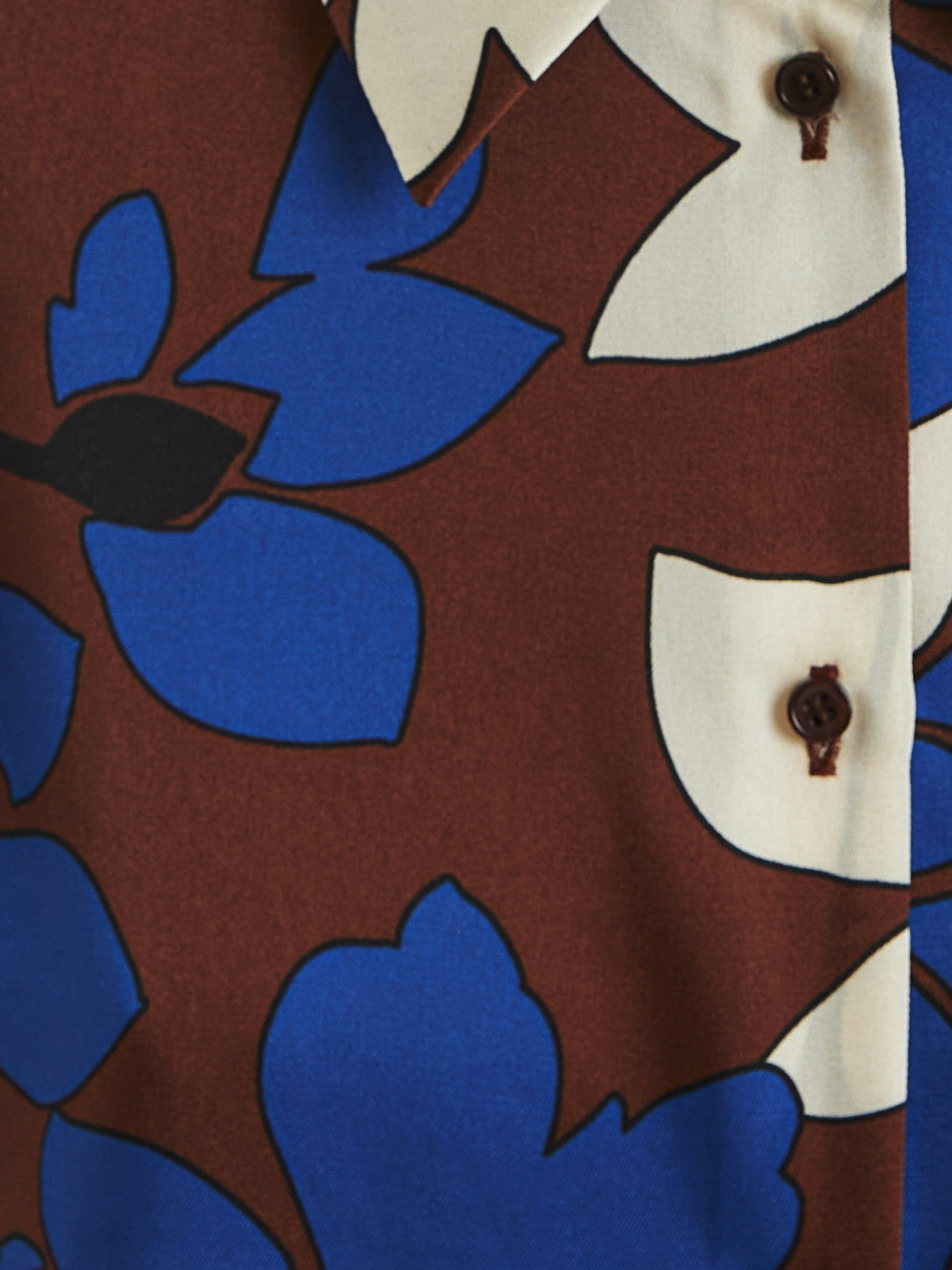 Блуза из плательной ткани с крупным цветочным притом, прямого силуэта с укороченным рукавом кимоно, классическим отложным воротником и застежкой на пуговицы. По низу по бокам небольшие разрезы.