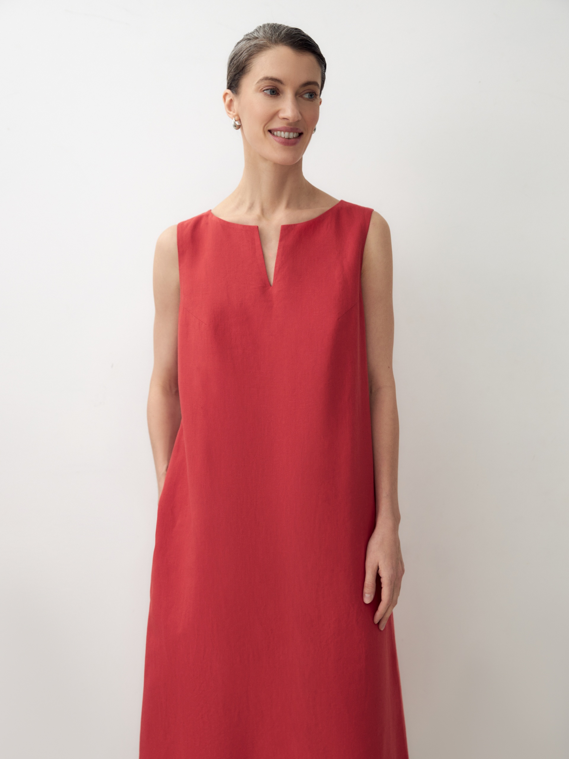 Красивый насыщенный цвет, ткань приятная - смесь хлопка с льном ощущается. На рост 170 село ниже колена, свободный крой. Не люблю сильно облегающие вещи, так что мне подошло. Для повседневной носки или отдыха вполне достойно.