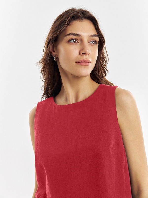 Стильная прямая блуза из льняной ткани, выполнена в цвете красный апельсин. Спереди 2 небольших разреза из рельефов. Горловина и пройма на обтачках с широкой отстрочкой. На спинке капелька с пуговицей.
