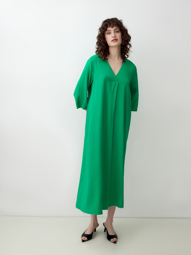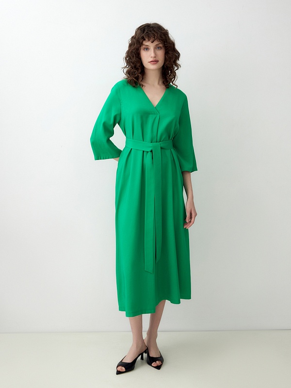 Прямое платье миди с V-образным вырезом и складкой по переду. Платье выполнено из вискозной ткани ярко-зеленого цвета. Прямые рукава. В комплект входит пояс из основной ткани.