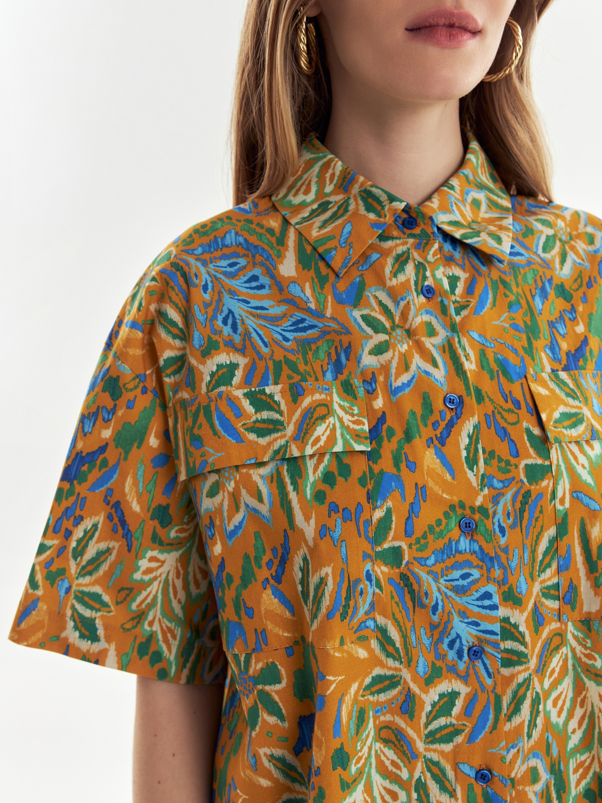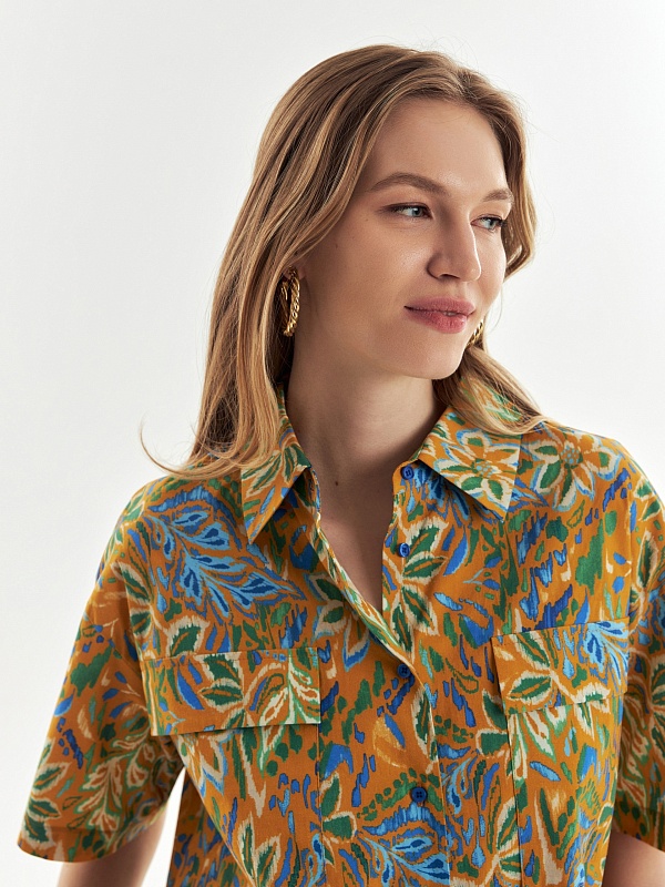 Свободная хлопковая блуза в принте идеально впишется в ваш весенний гардероб. Короткий и широкий рукав позволит активно проводить время в городе. Отложной воротник, застежка на пуговицы. На полочке накладные карманы с клапанами. На спинке кокетка с бантовой складкой. Спинка длине полочки, у блузы есть разрезы по бокам.