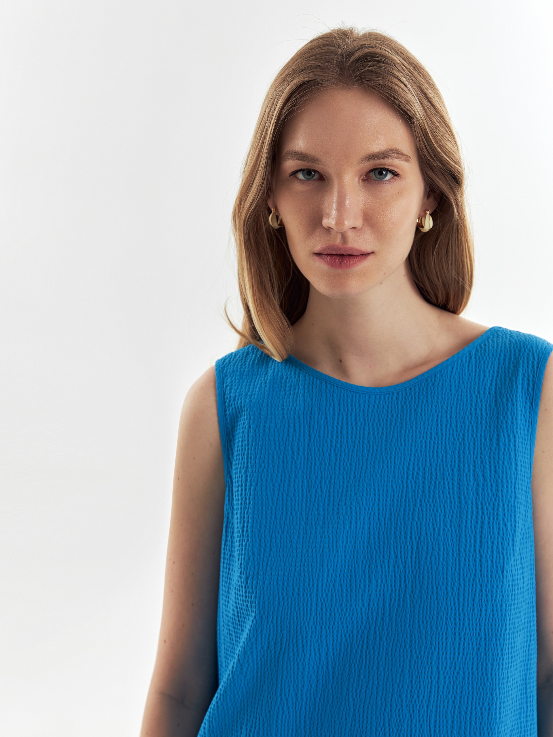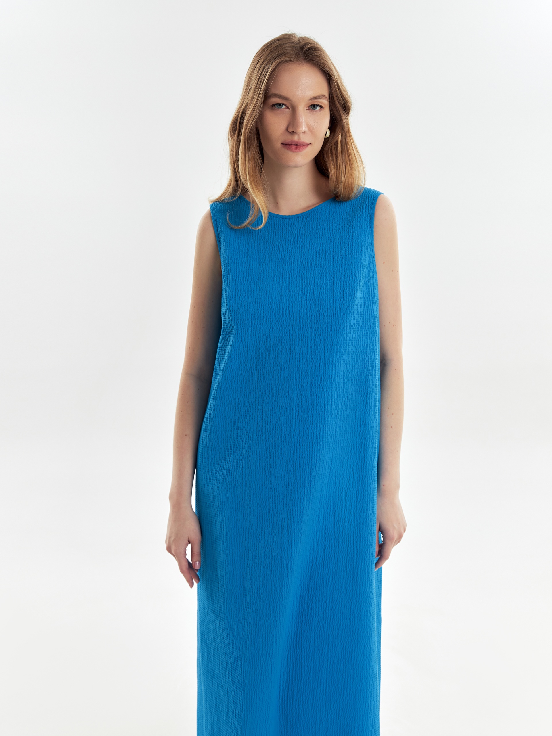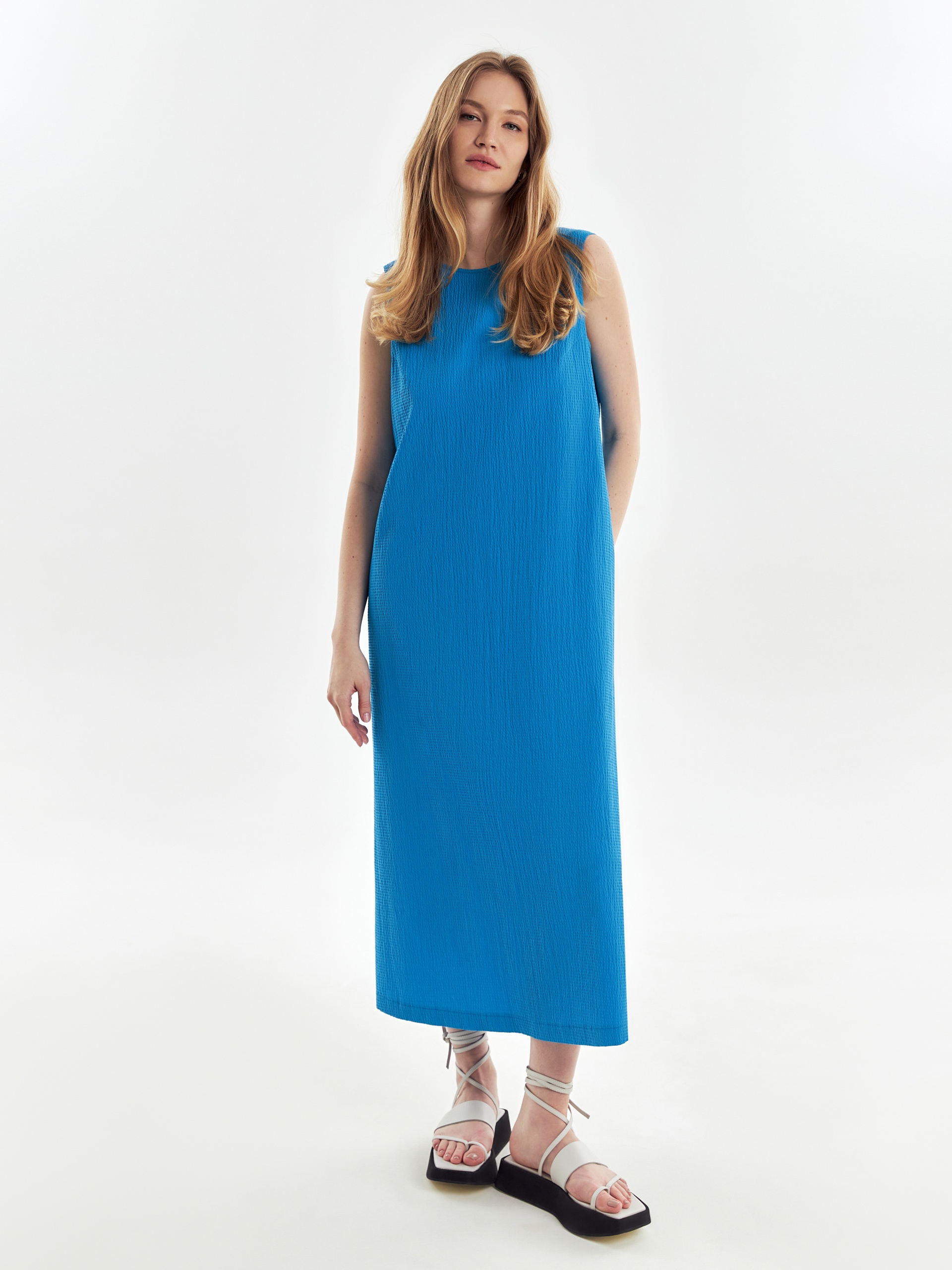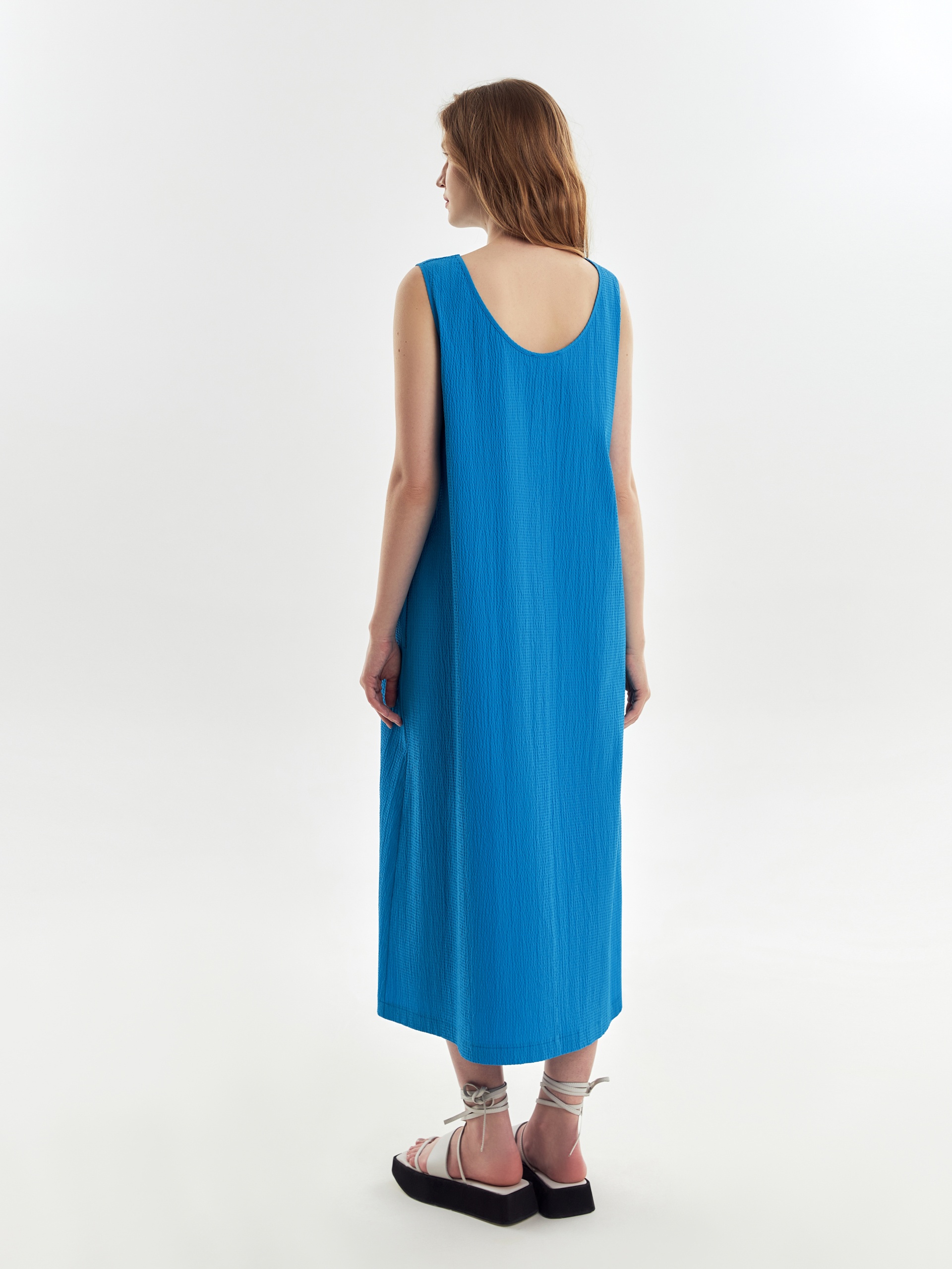 Свободное платье из фактурной хлопковой ткани в лазурном цвете, силуэта колокол с круглой горловиной и углубленным вырезом на спине. С карманами в швах.