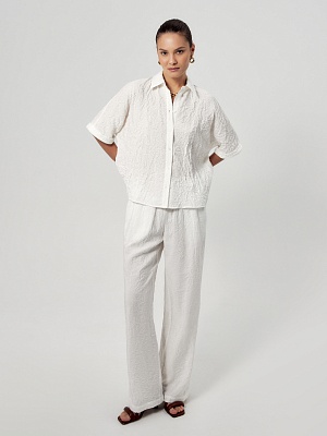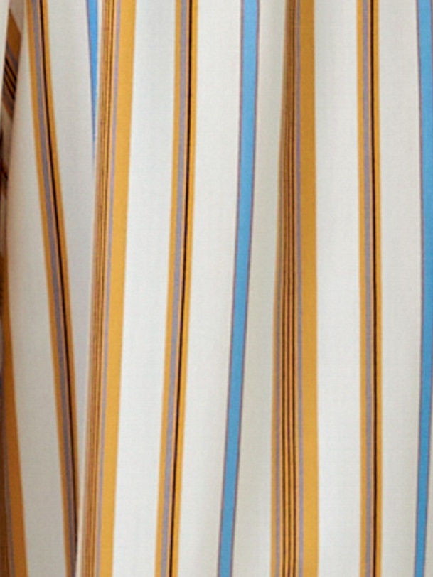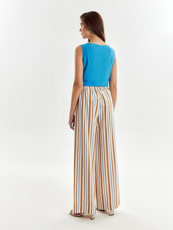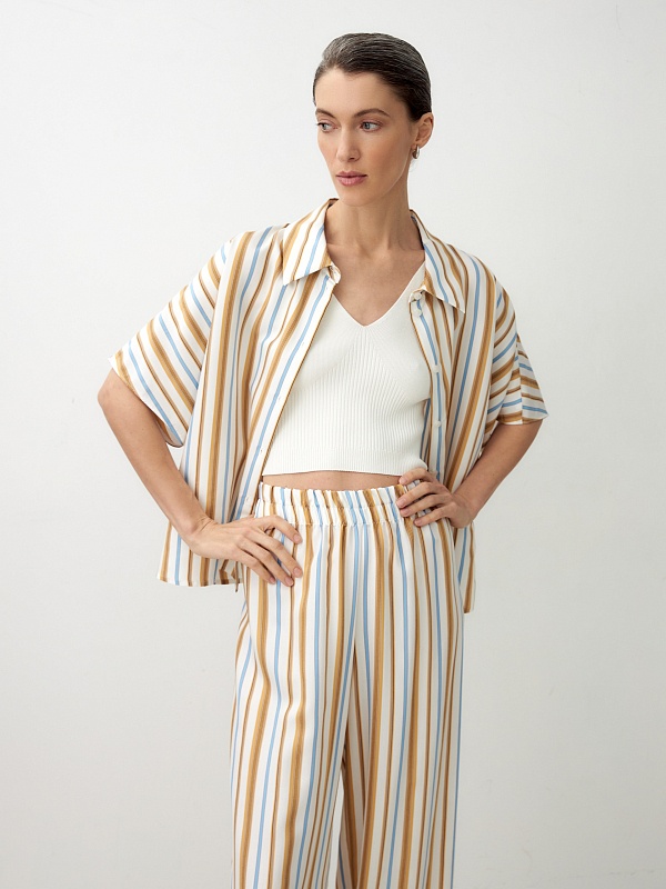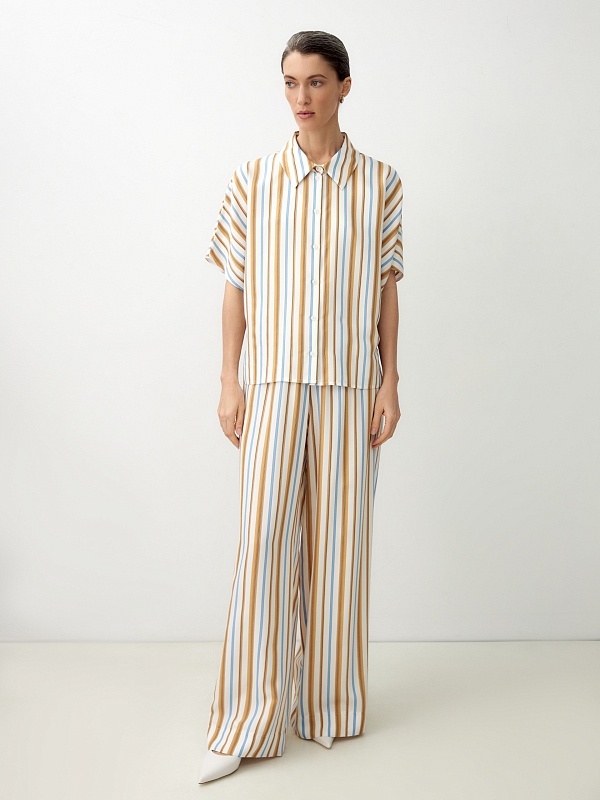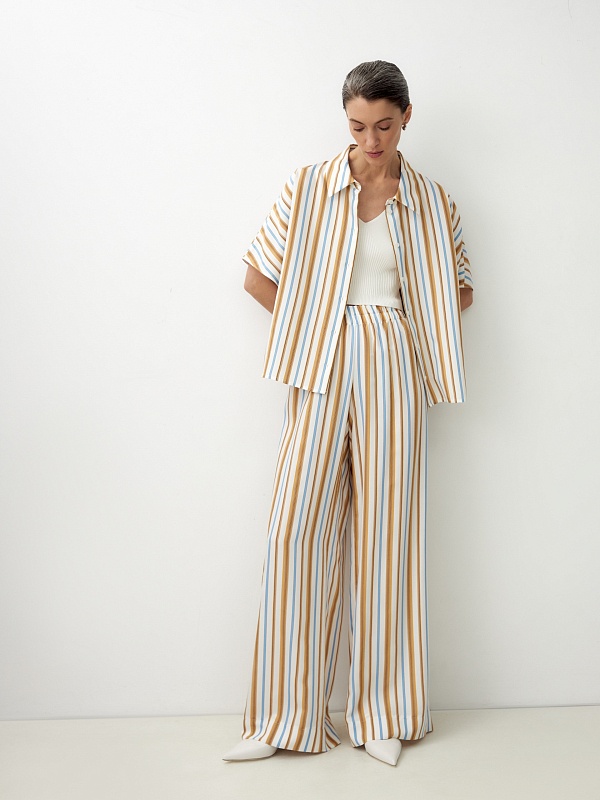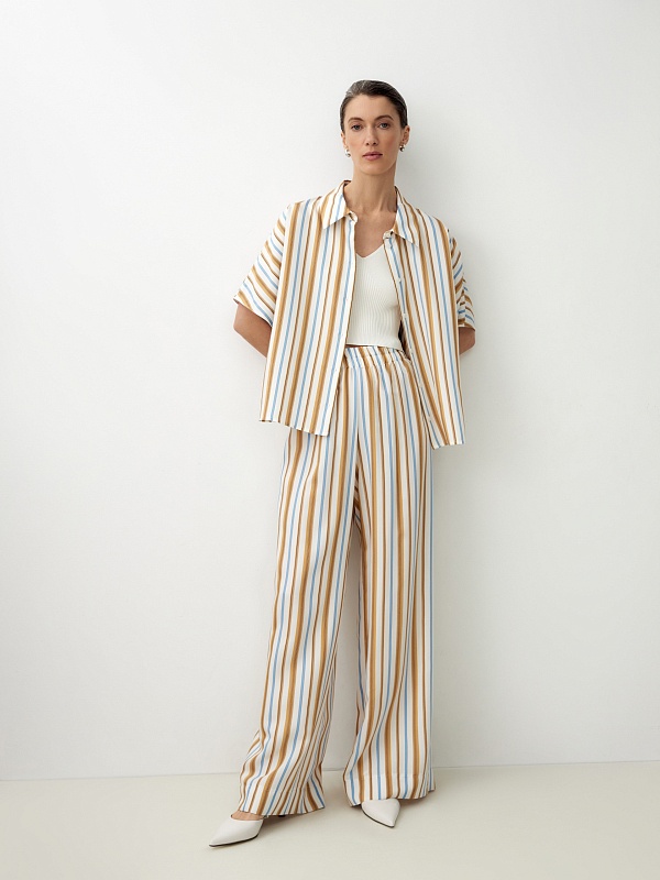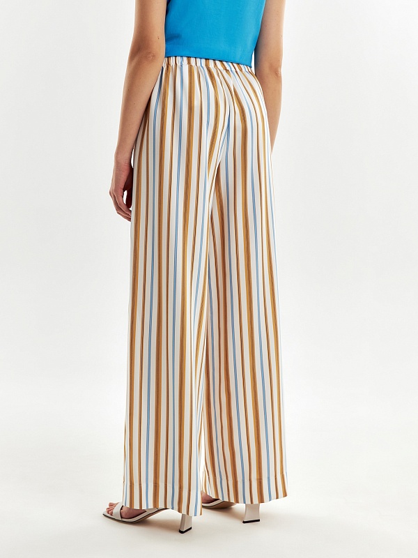 Широкие брюки на резинке из вискозной ткани в разноцветную полоску со сборкой по талии. В боковых швах потайные карманы.