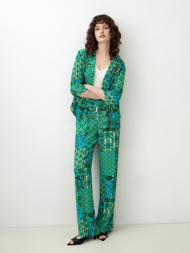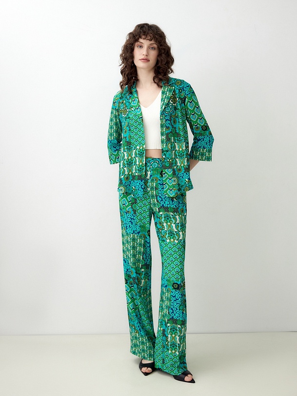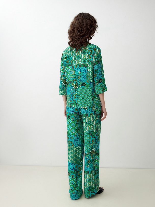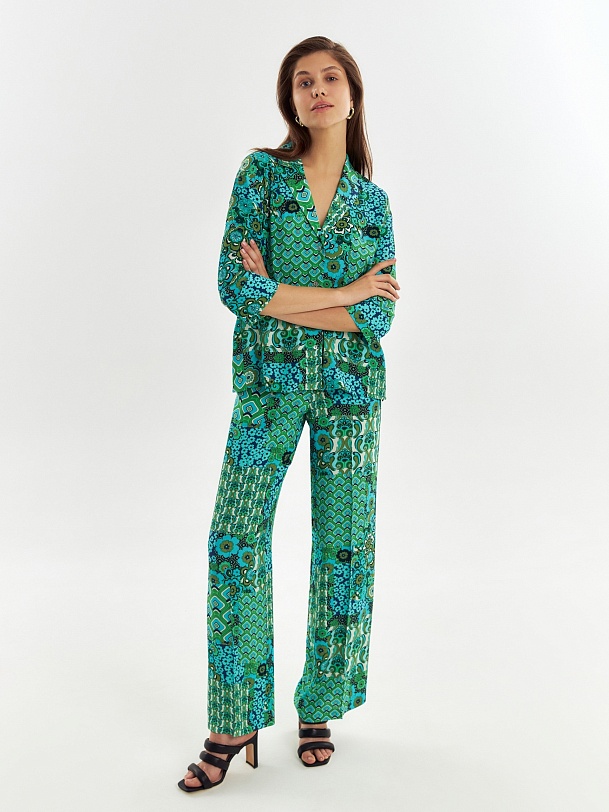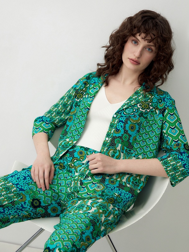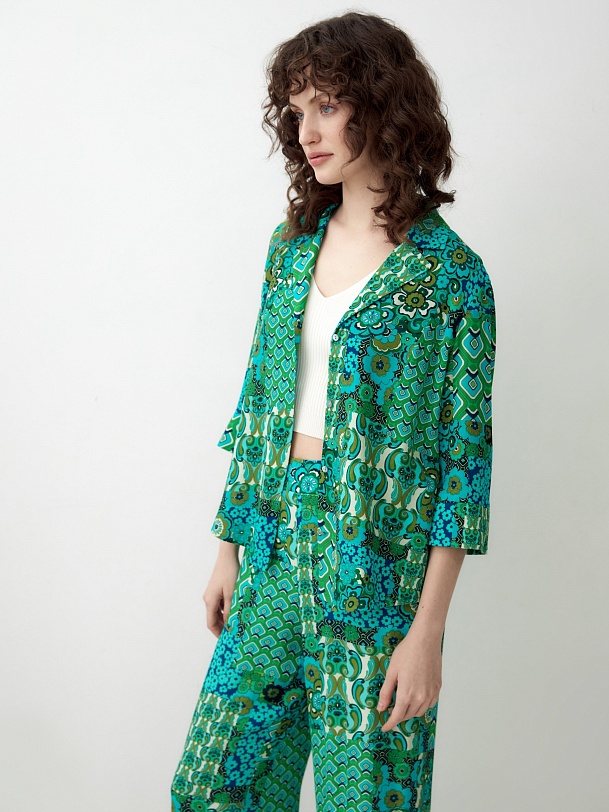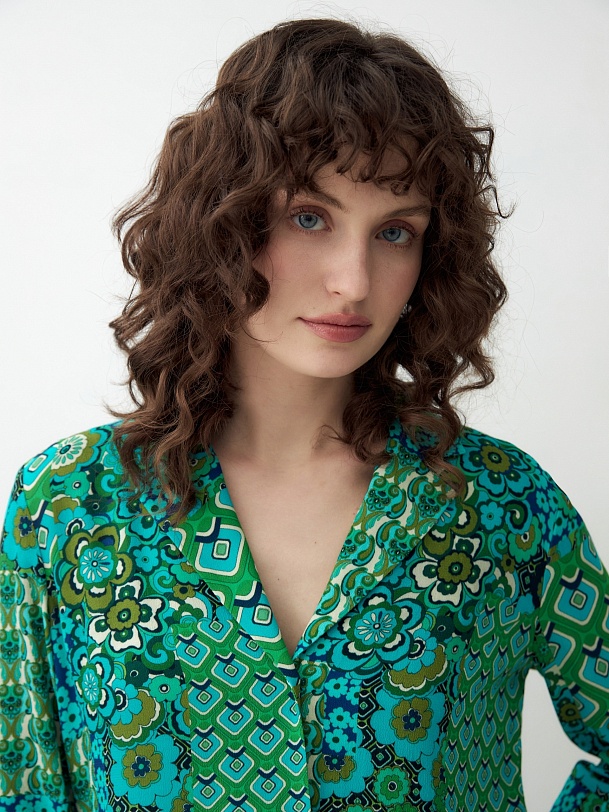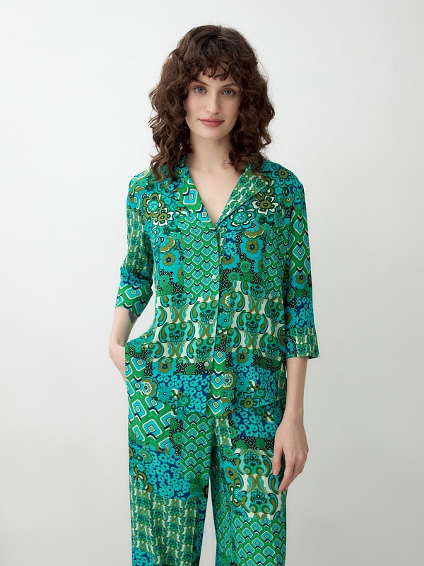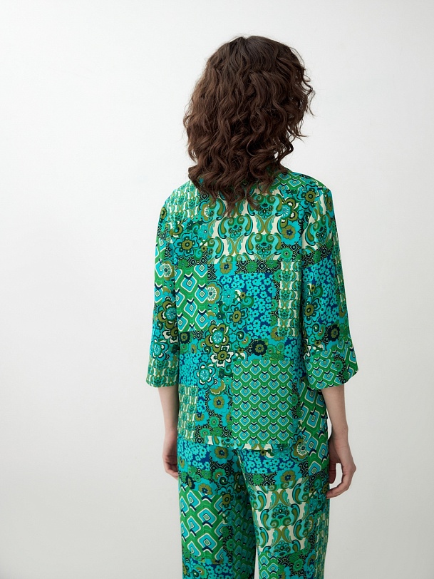Прямая блуза с английским воротником на пуговицах, со спущенной линией плеча, рукава 3/4 на широком манжете без пуговиц. Блуза выполнена из вискозной ткани в ярком принте.