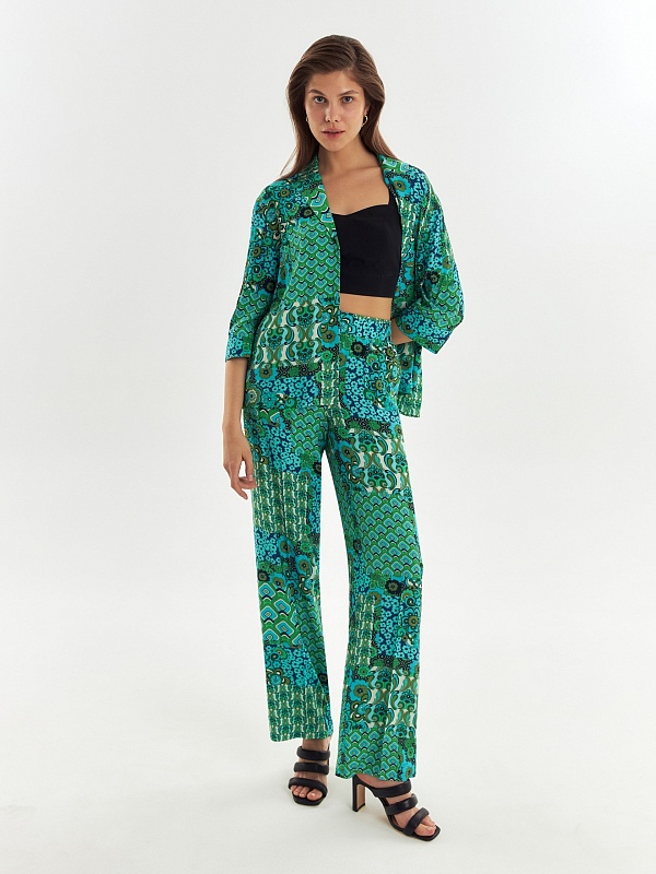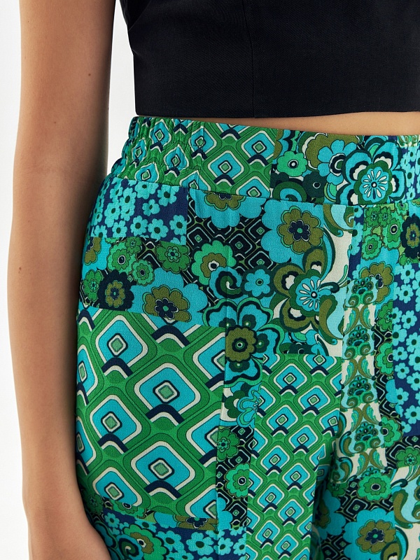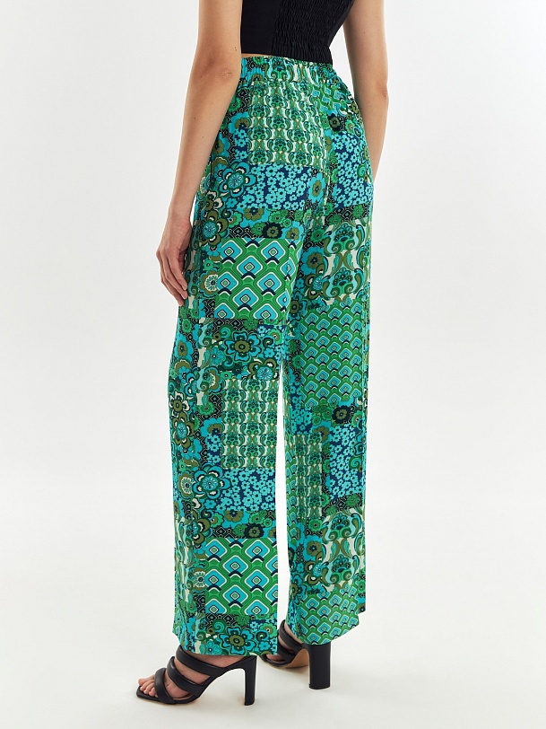 Прямые брюки из вискозной ткани в ярком принте на резинке. Карманы в боковых швах. В комплекте с блузой составит идеальный пижамный комплект.