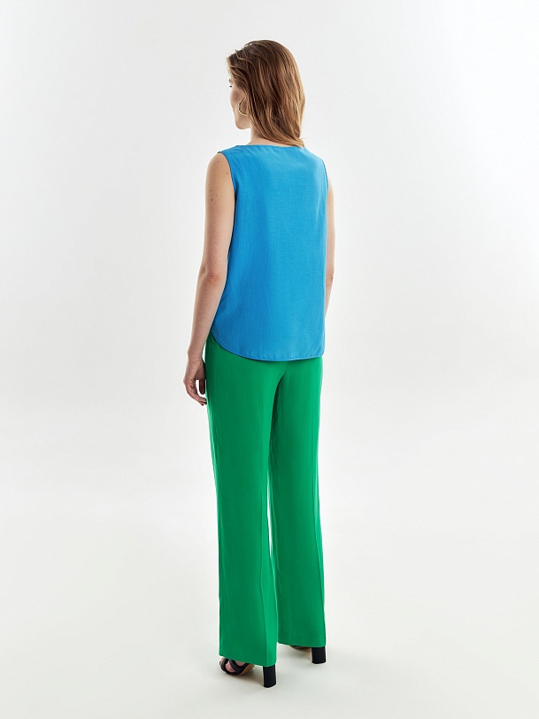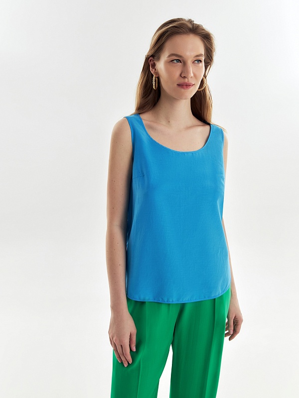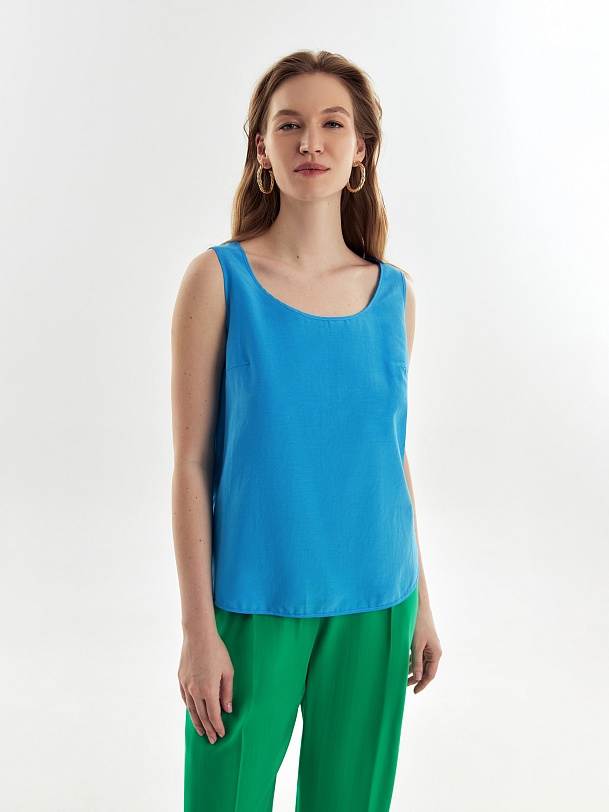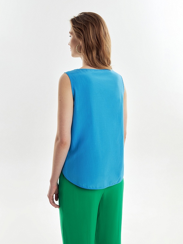 Свободная блуза на широких лямках с глубоким овальным вырезом из блузочной ткани небесно-голубого цвета.