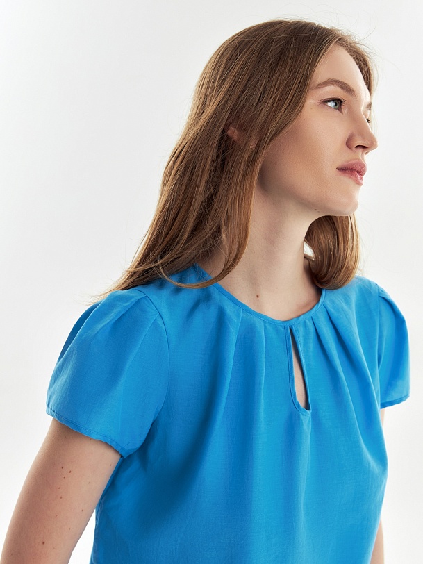 Романтичная блузка из блузочной ткани небесно-голубого цвета. Блуза с круглым вырезом и "каплей" на полочке с декоративным элементом, по переду горловина оформлена складками. Втачной рукав-крылышко немного прикрывает плечо. Блуза является хорошим базовым вариантом для повседневного гардероба.