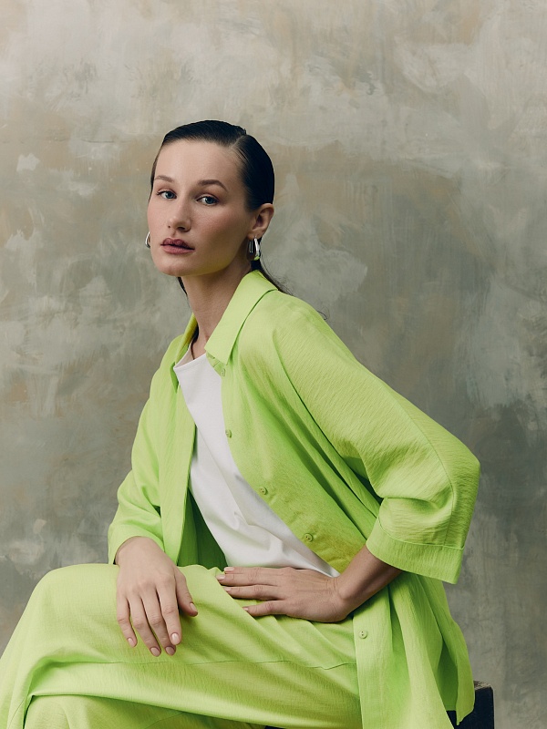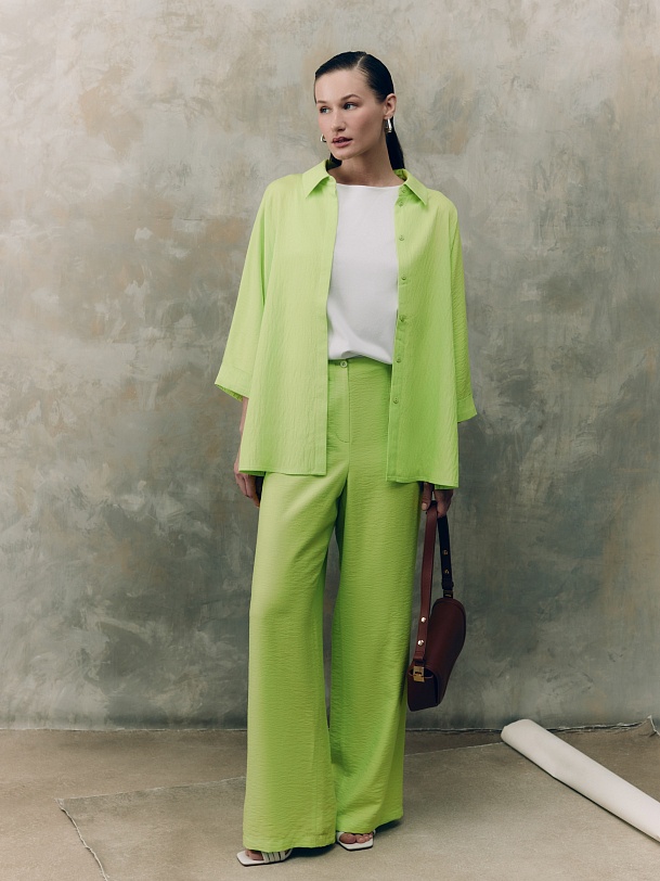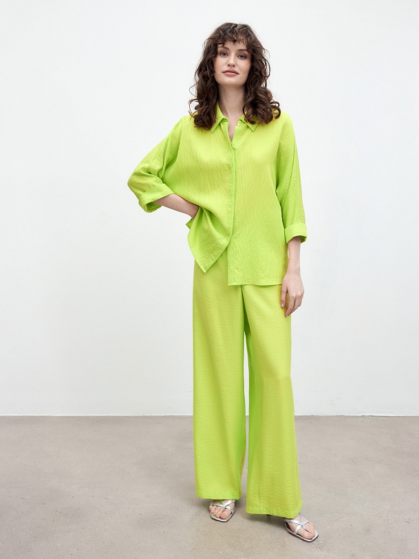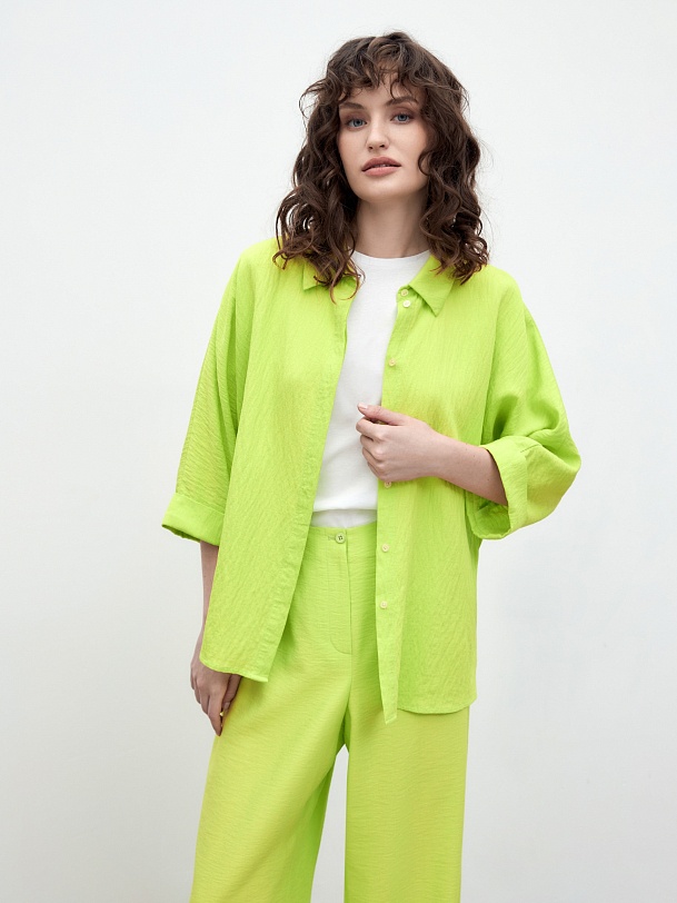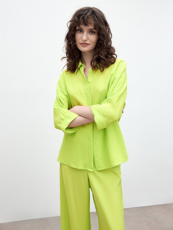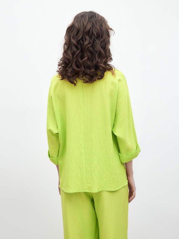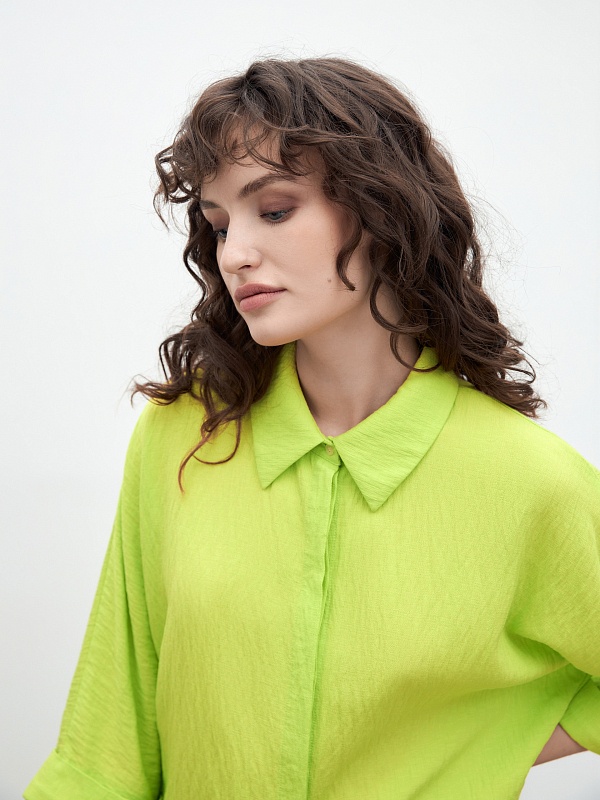 Свободная блуза прямого силуэта с классическим отложным воротником и потайной планкой с цельнокроенным рукавом на прямом манжете. Блуза выполнена из плательной вискозной ткани яркого трендового салатового цвета.