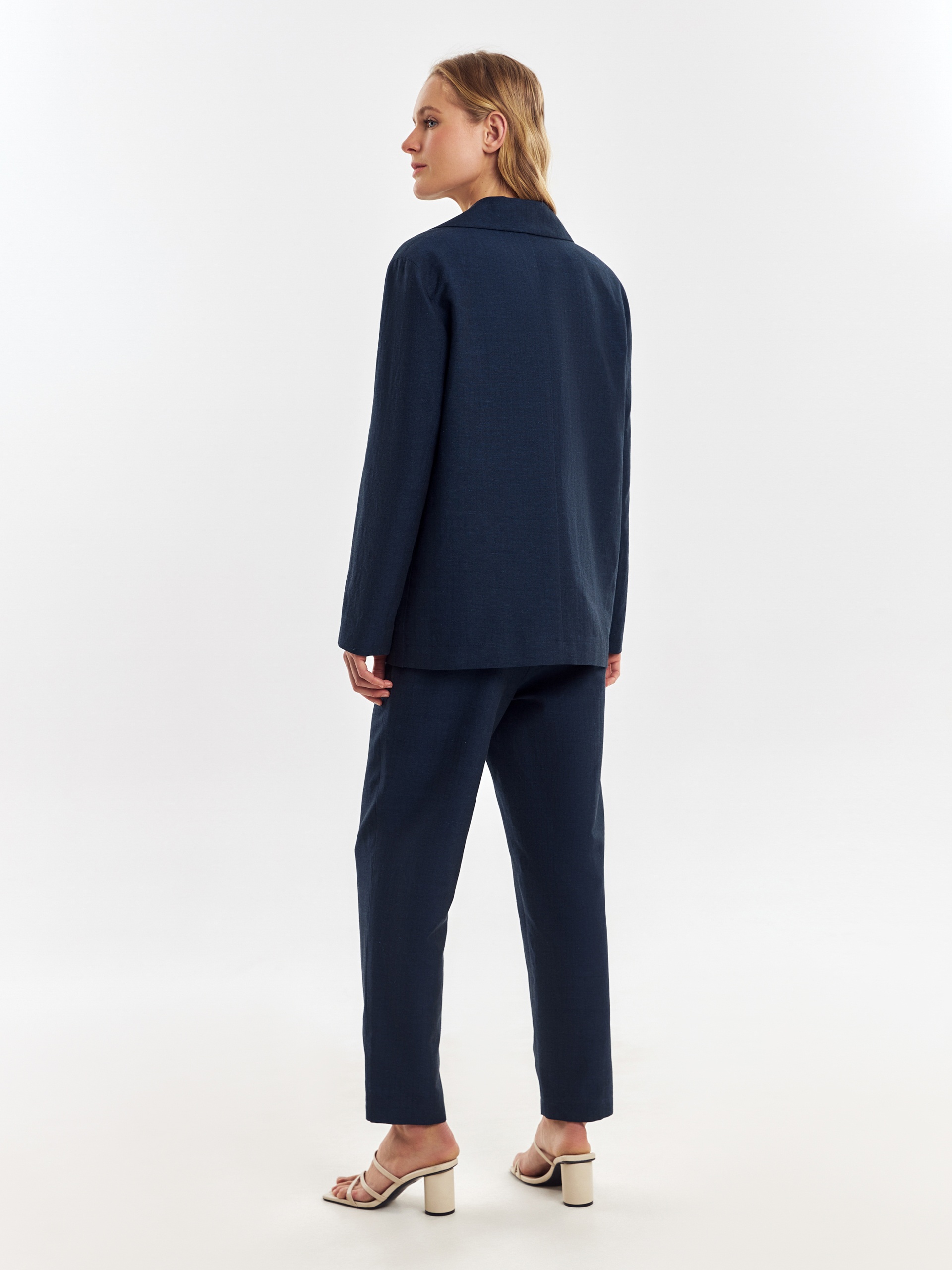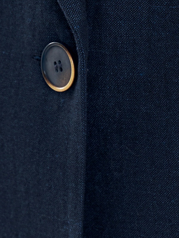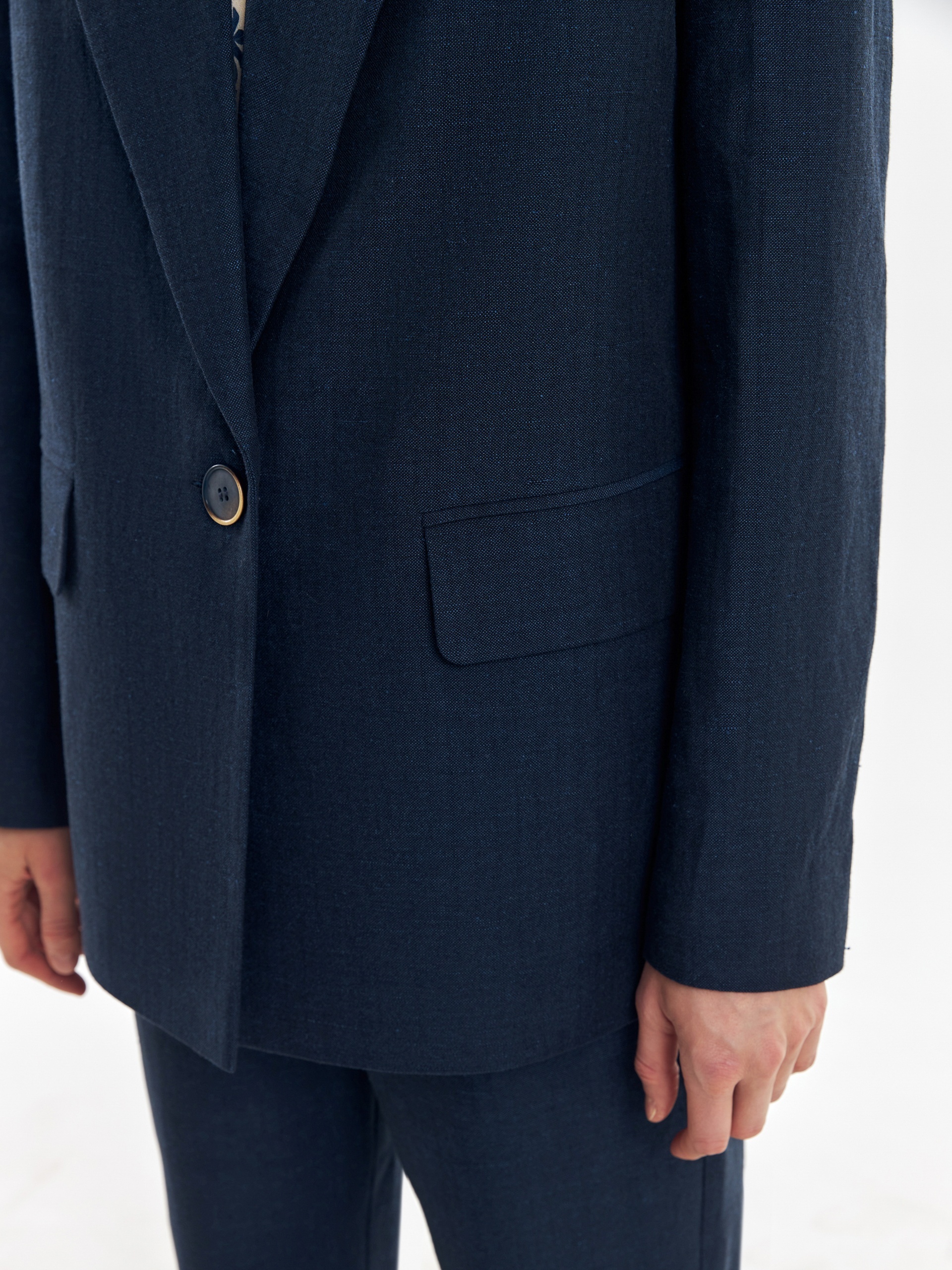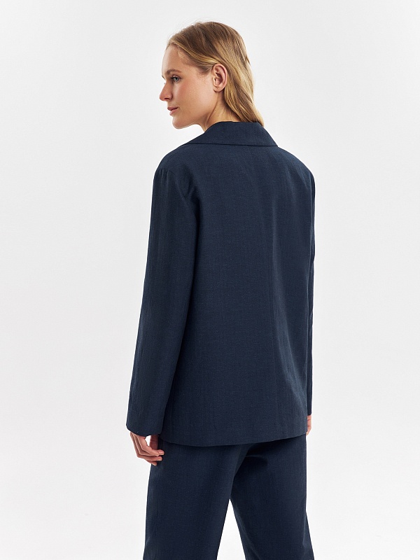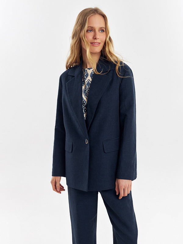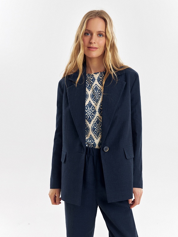 Однобортный жакет из смесовой ткани в темно-синем цвете. Жакет с классическими лацканами на одной пуговице с прорезными карманами с клапанами. Жакет удлиненный, на подкладке только полочка.