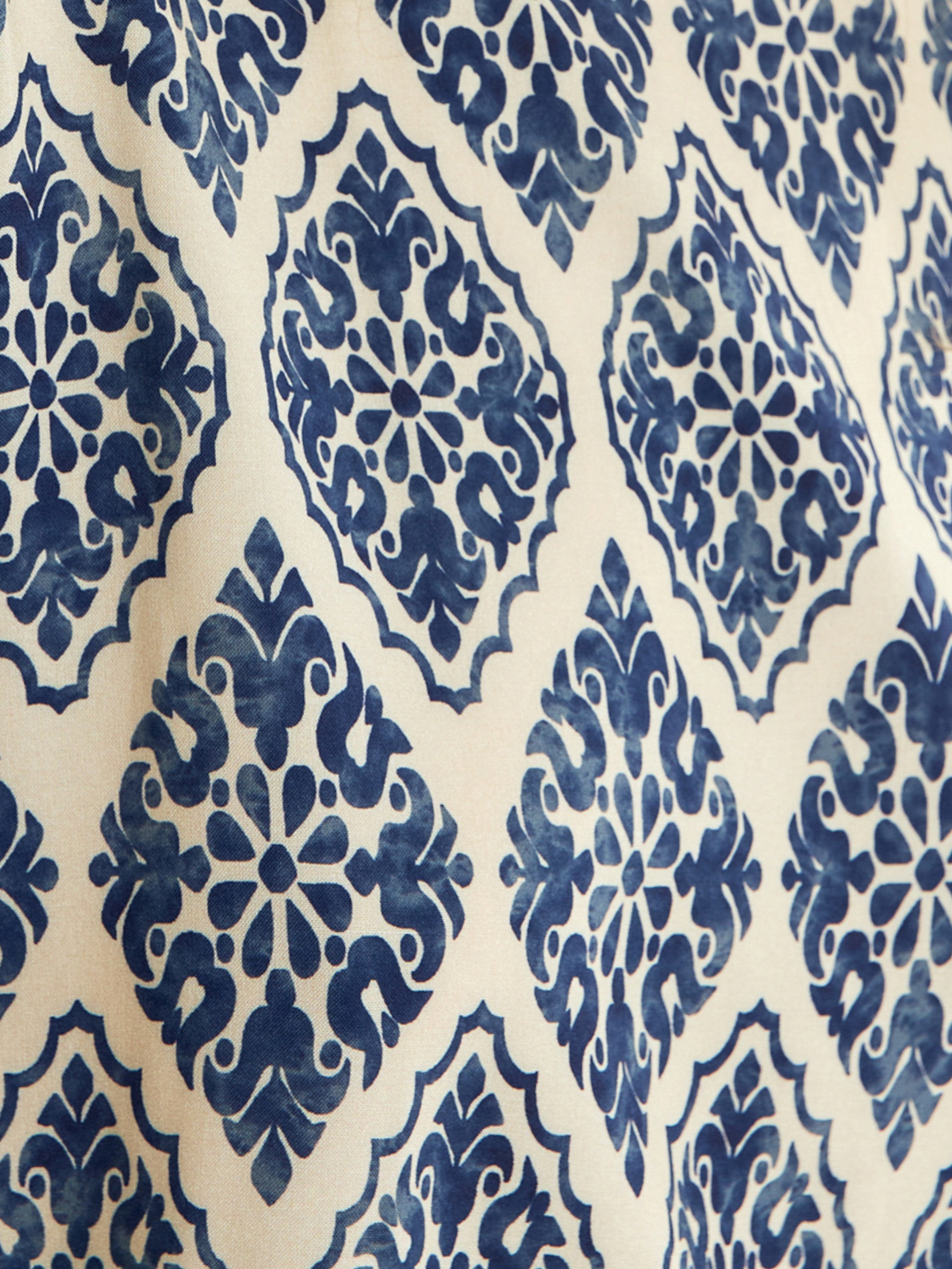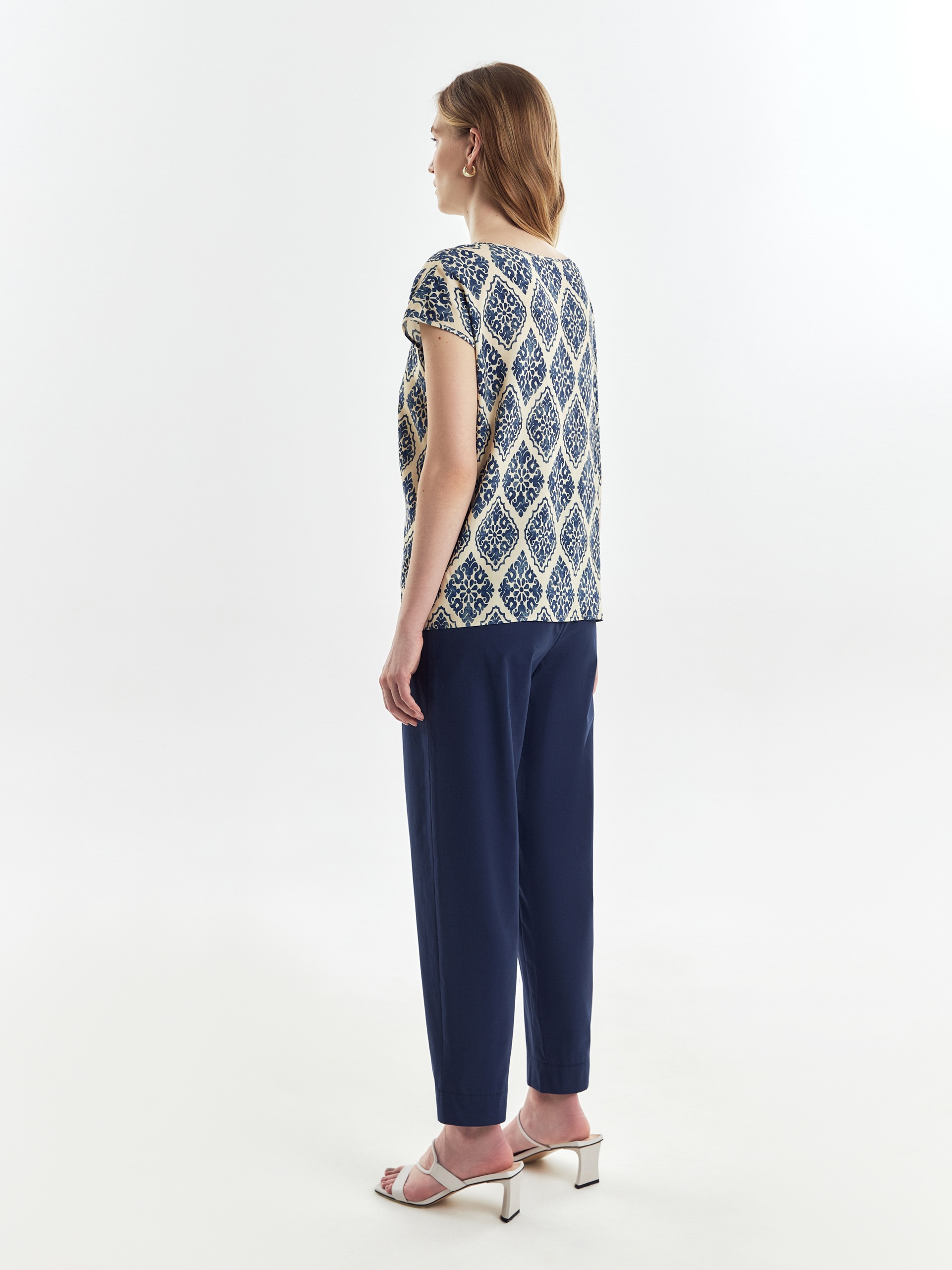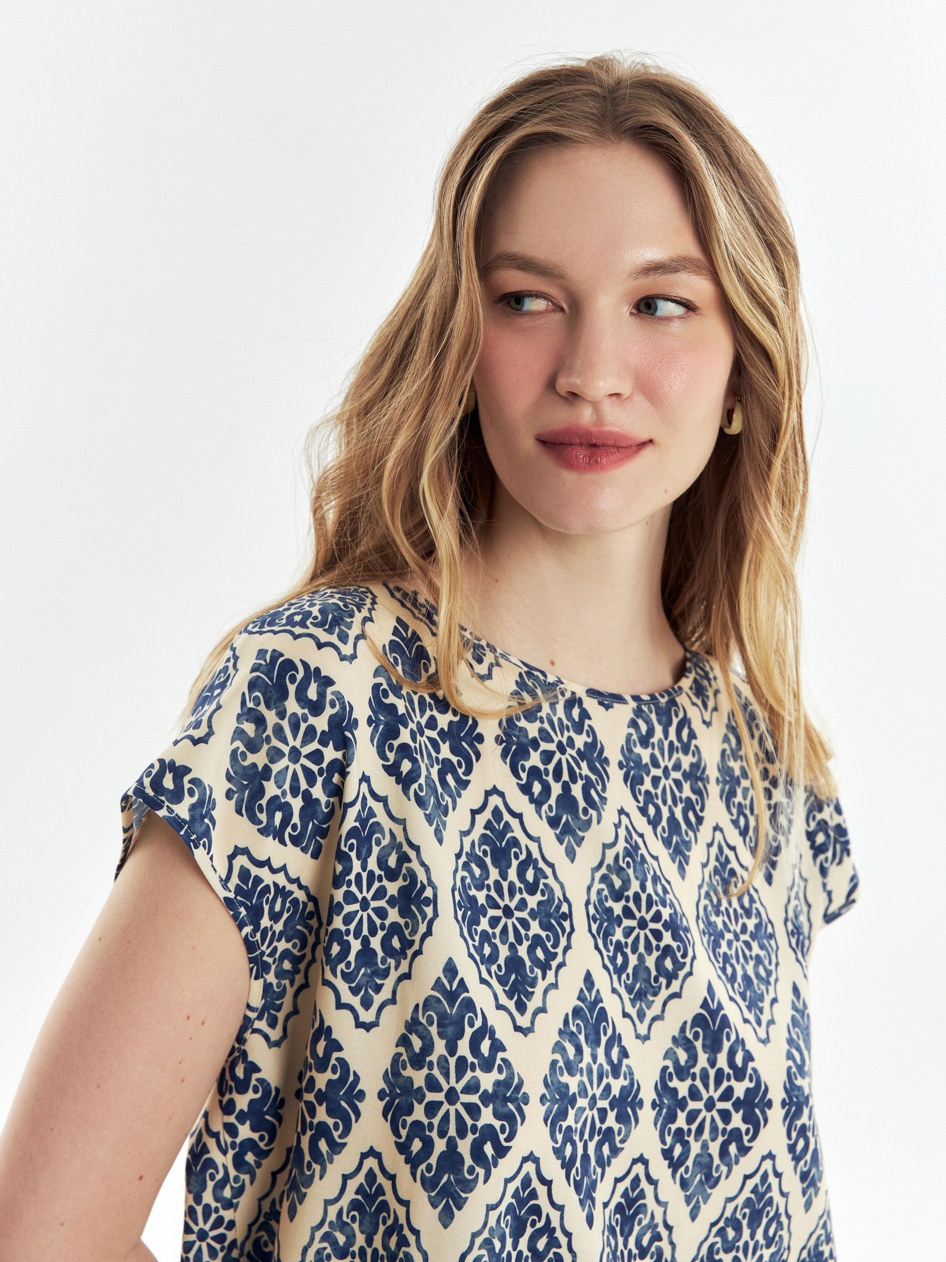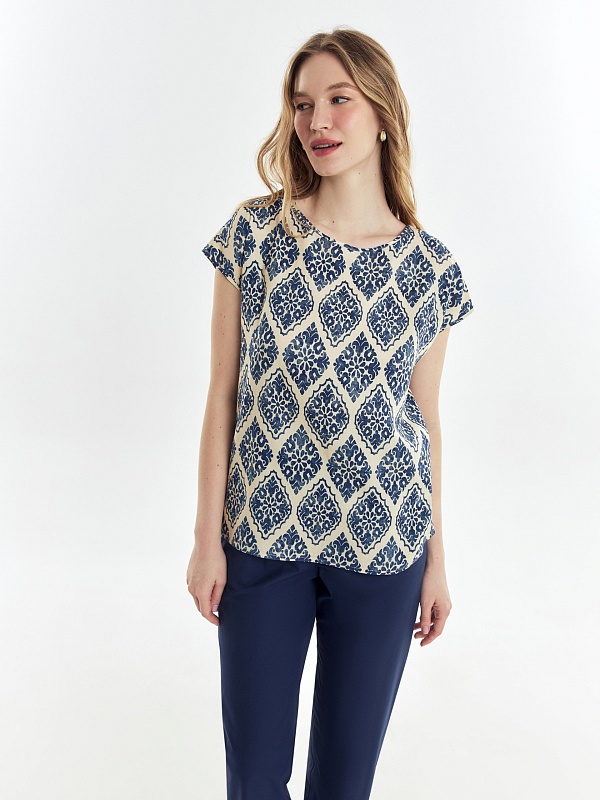 Классическая прямая блуза из вискозной ткани с восточном принтом, горловиной лодочкой и разрезами по боковым швам.