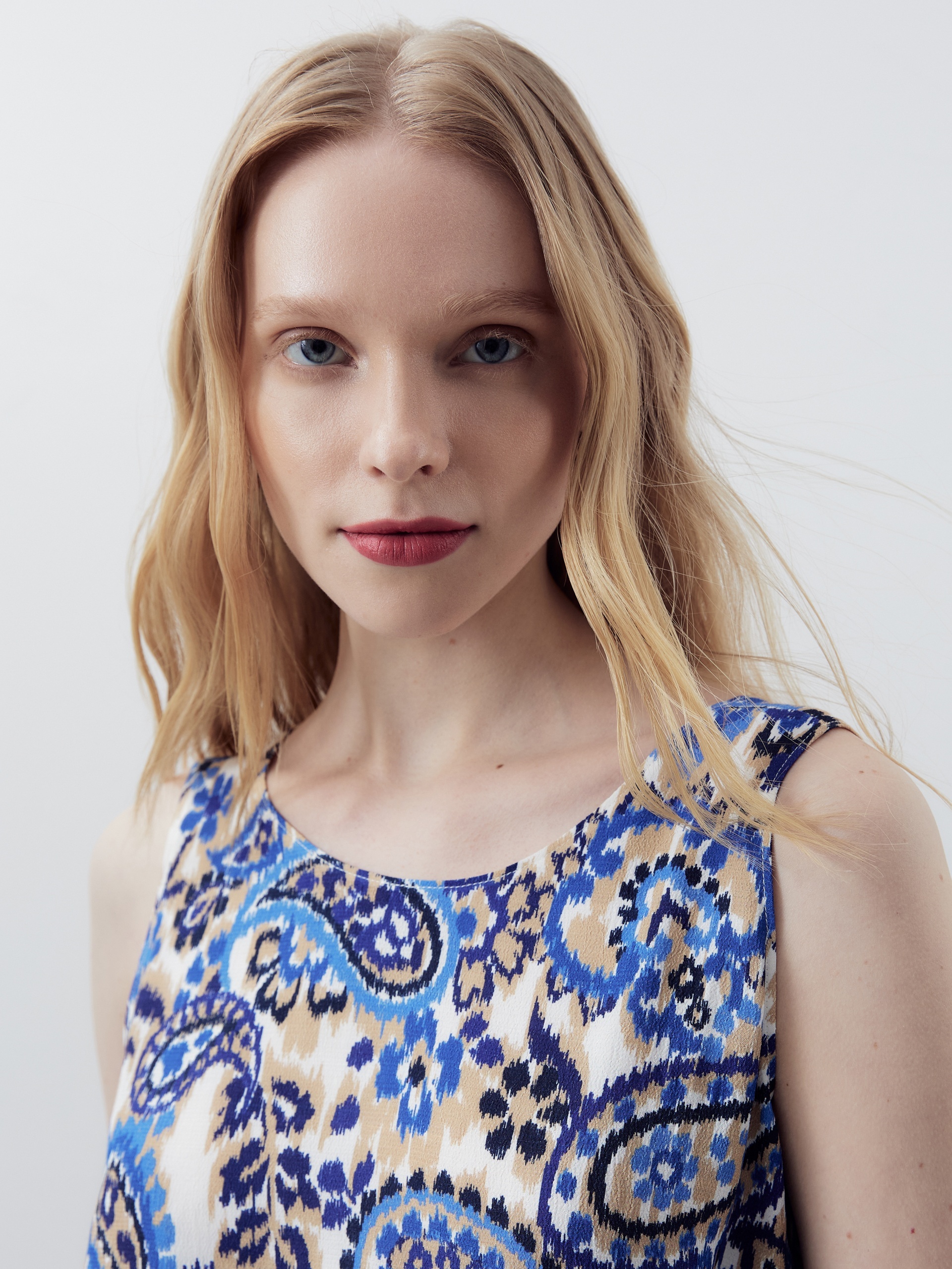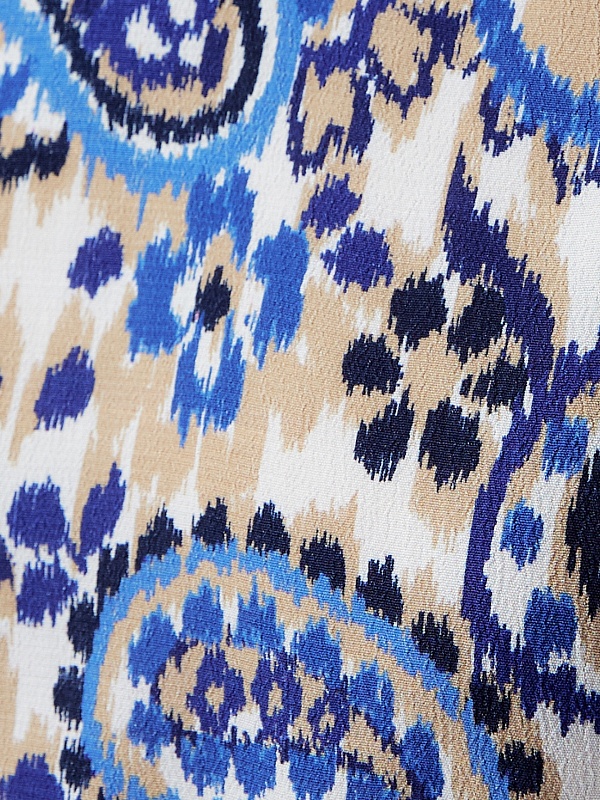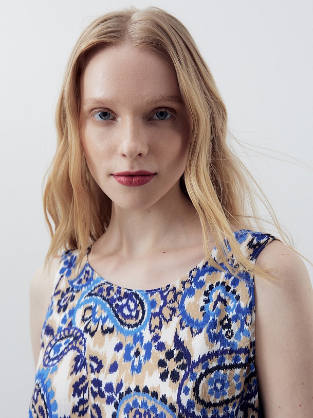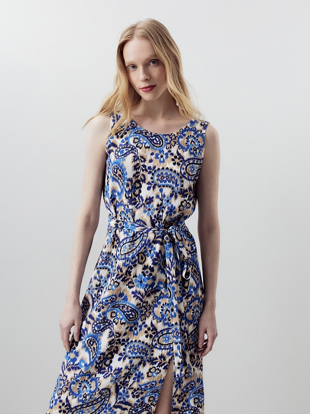 Прямое платье миди с круглой горловиной и углубленным вырезом спинки. Платье выполнено из вискозной ткани с этническим принтом. Спереди высокий разрез. В комплект входит пояс из основной ткани.