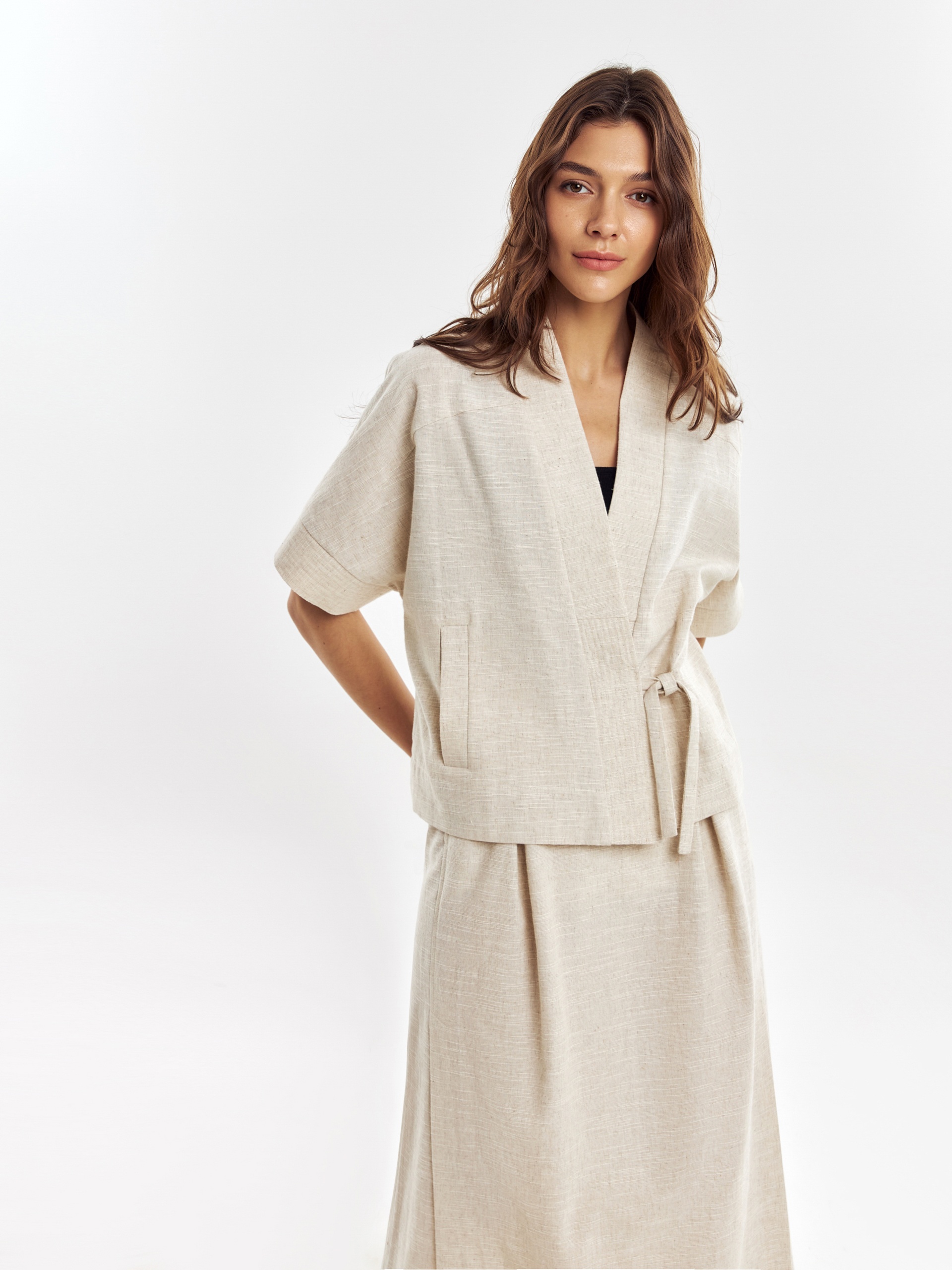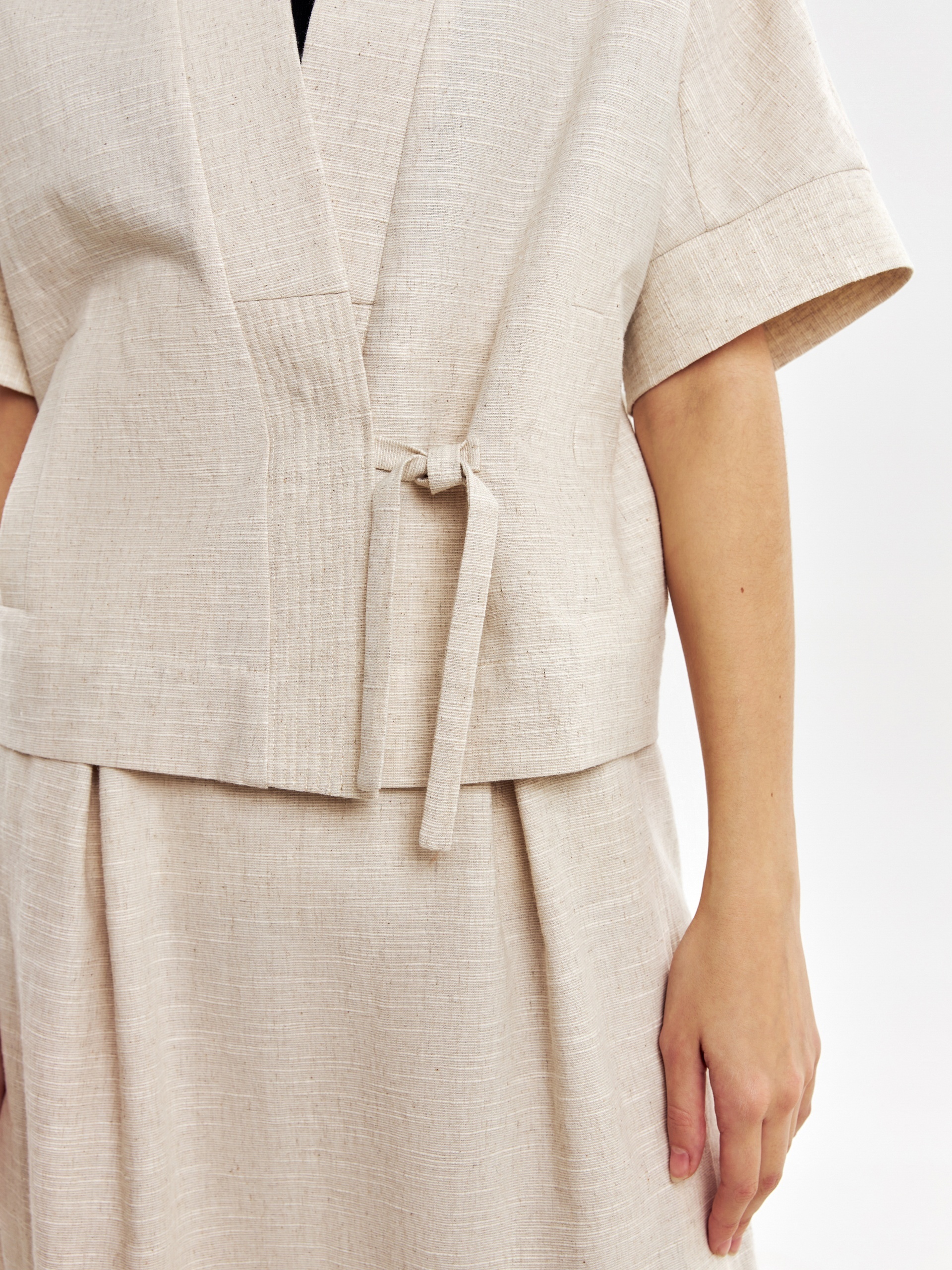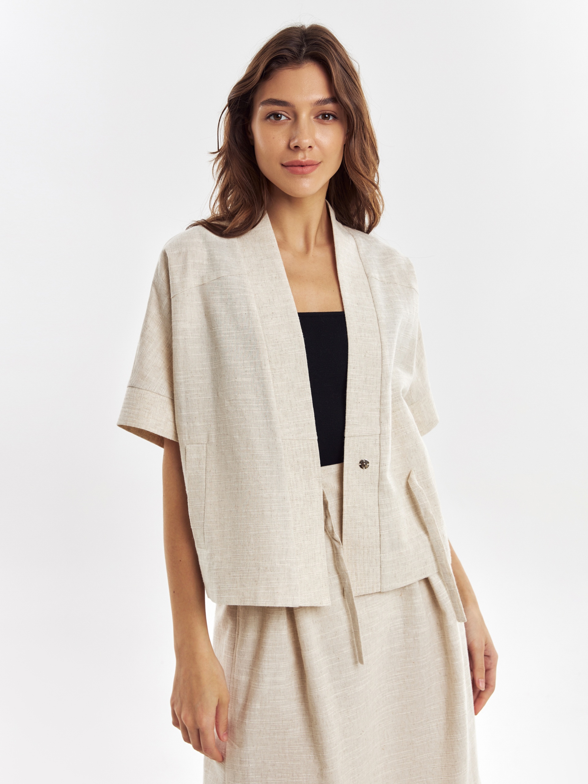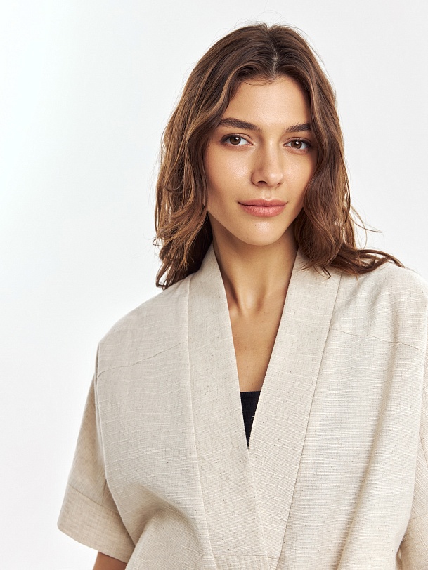 Прямой укороченный жакет на запах с завязками, с цельнокроеным рукавом кимоно на манжете с отстрочками. Жакет с воротником шалькой. Наклонные прорезные карманы листочки на полочке. Жакет выполнен из смесовой ткани хлопок-лен, имеет выраженную текстуру ткани.