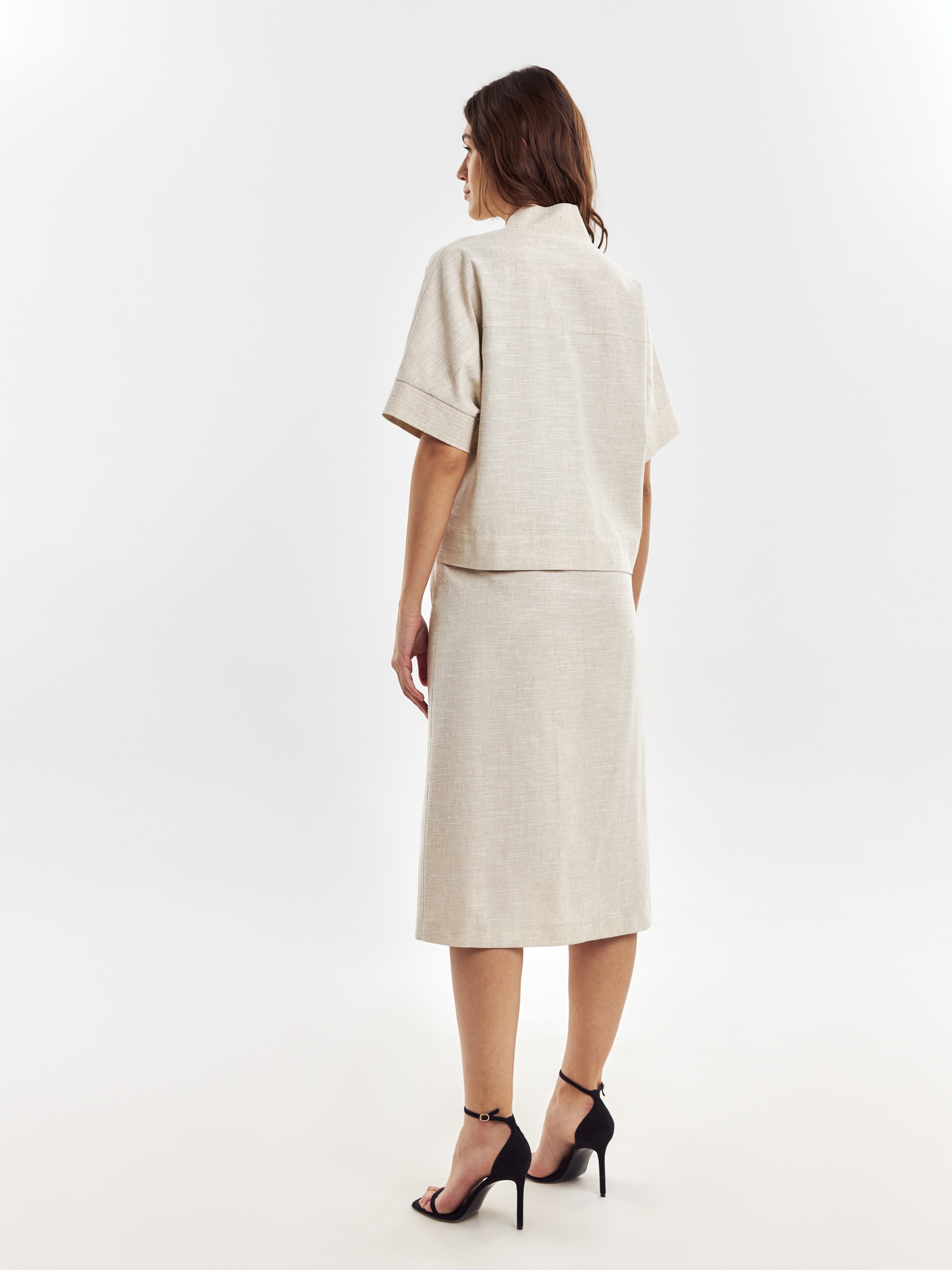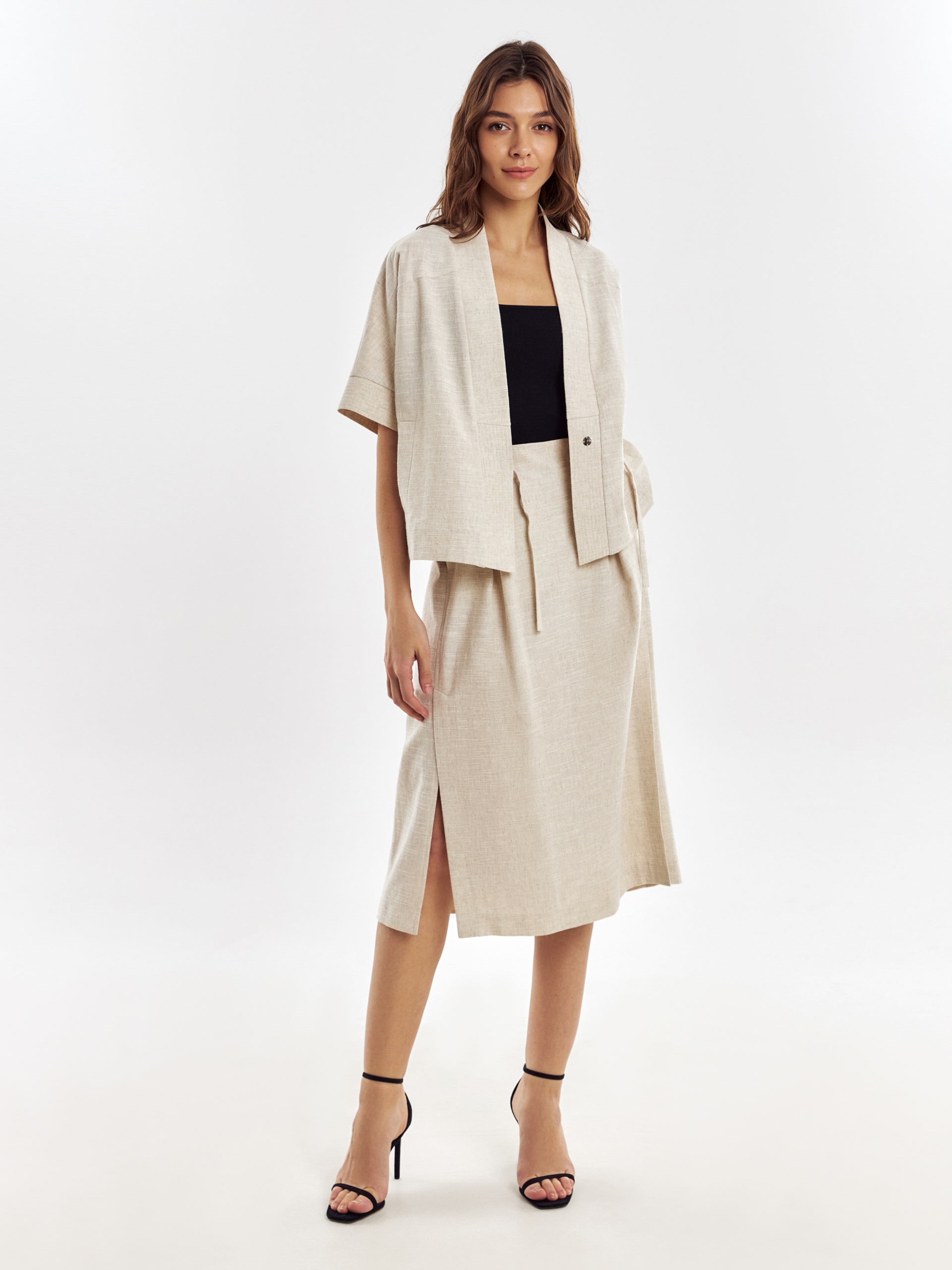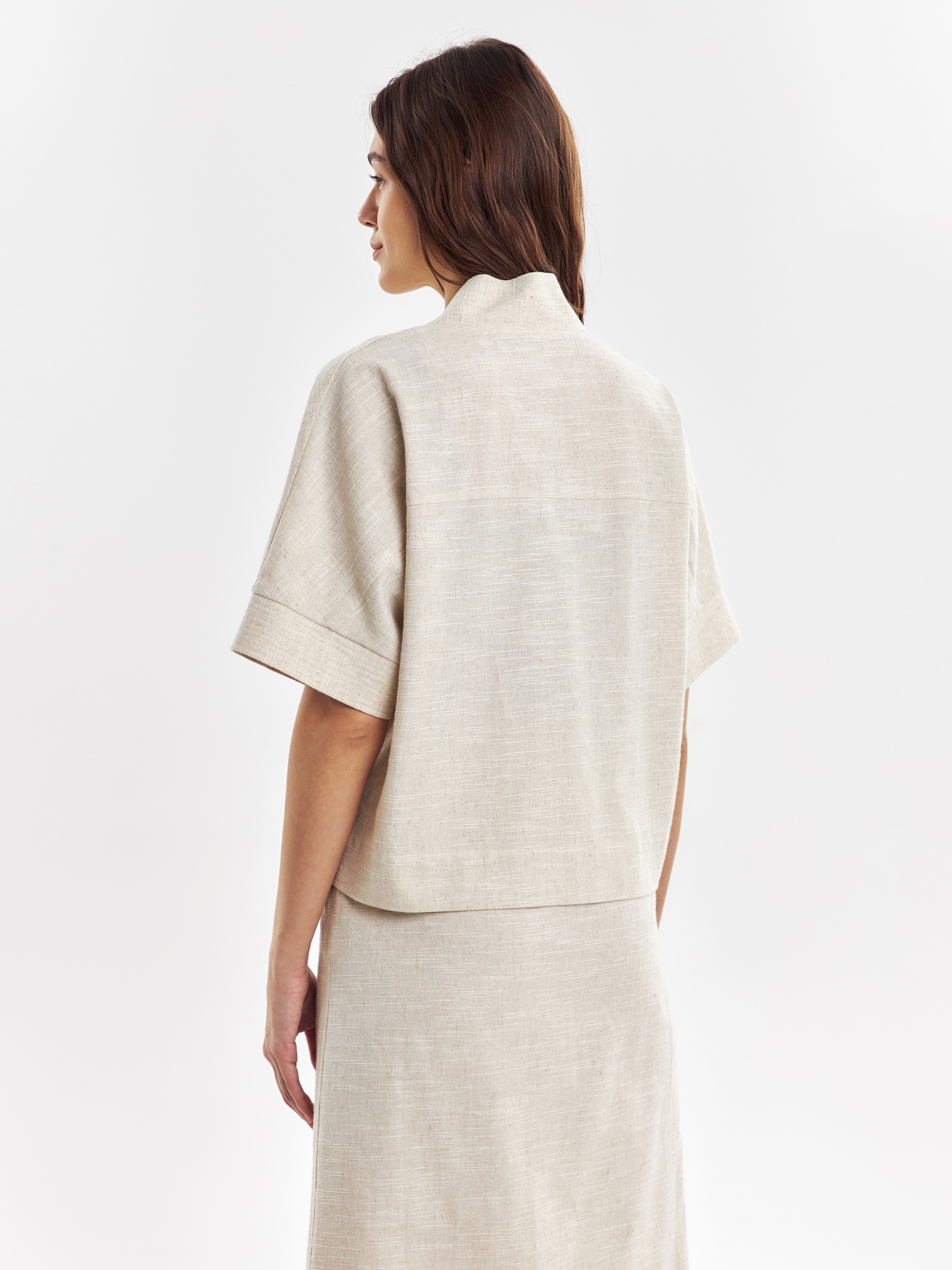 Прямой укороченный жакет на запах с завязками, с цельнокроеным рукавом кимоно на манжете с отстрочками. Жакет с воротником шалькой. Наклонные прорезные карманы листочки на полочке. Жакет выполнен из смесовой ткани хлопок-лен, имеет выраженную текстуру ткани.