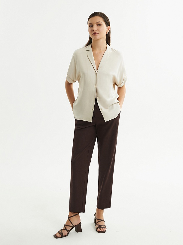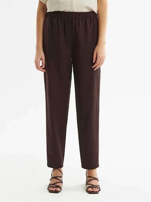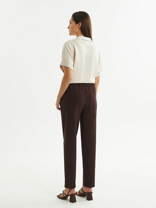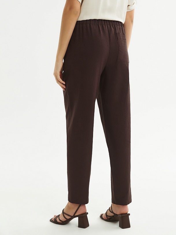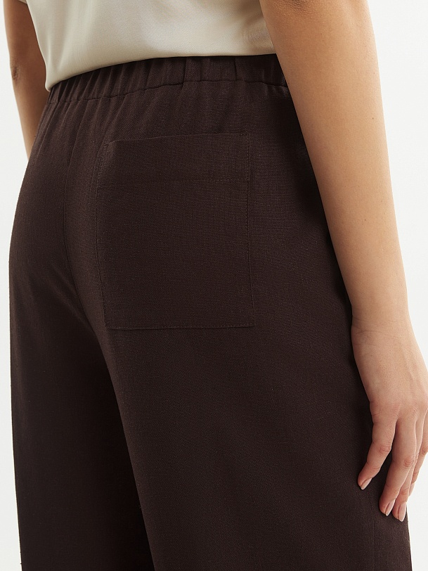 Прямые брюки из льняной ткани в благородном шоколадном цвете на притачном поясе с резинкой и имитацией гульфика. Рабочие карманы в боковых швах и один накладной карман на спинке. Модель идеально подходит для создания ансамбля с жакетом из аналогичной ткани.