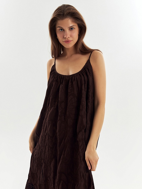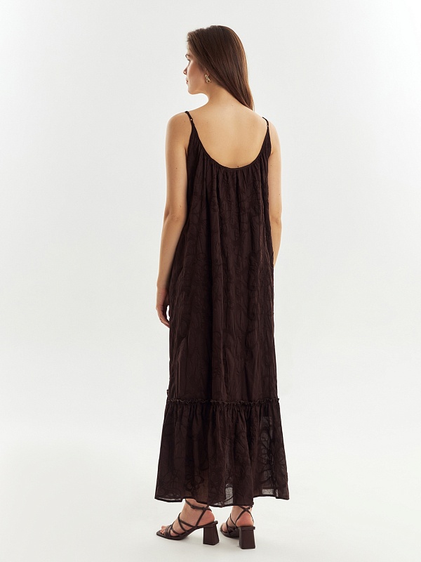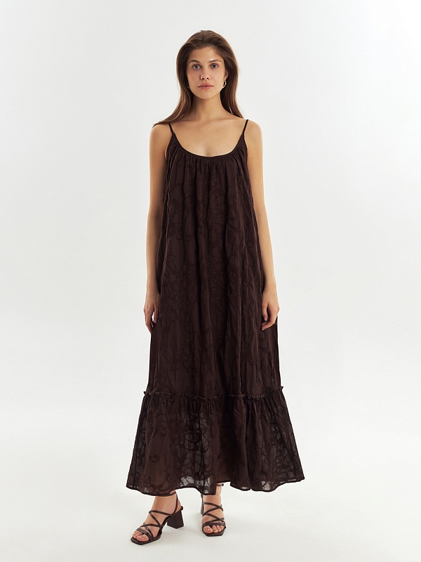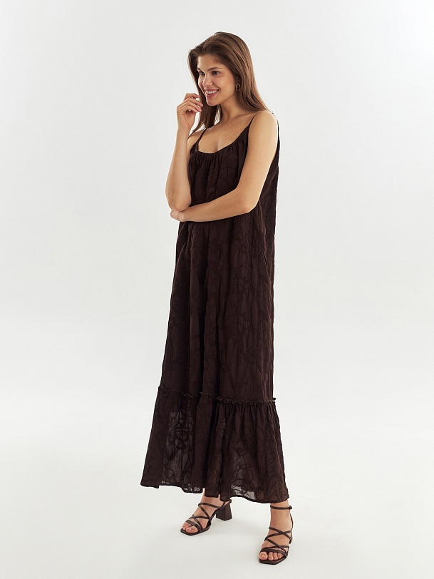 Сарафан в пол на тонких бретелях, силуэта трапеция с воланом и рюшей. По горловине сборка, вырез на спинке углубленный. Платье на подкладке.