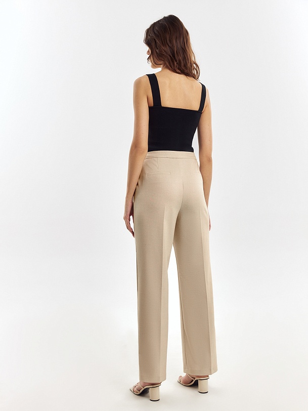 Классические прямые брюки со стрелками из костюмной ткани на притачном поясе. Застежка спереди на молнию, крючок и пуговицу.
