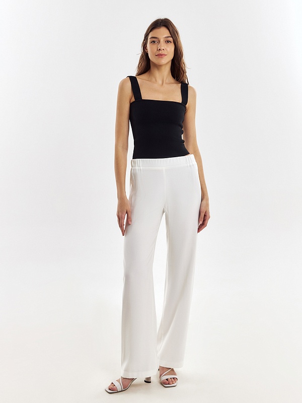 Прямые брюки без бокового шва на резинке по спинке и бокам. Брюки выполнены из вискозной ткани молочного цвета.