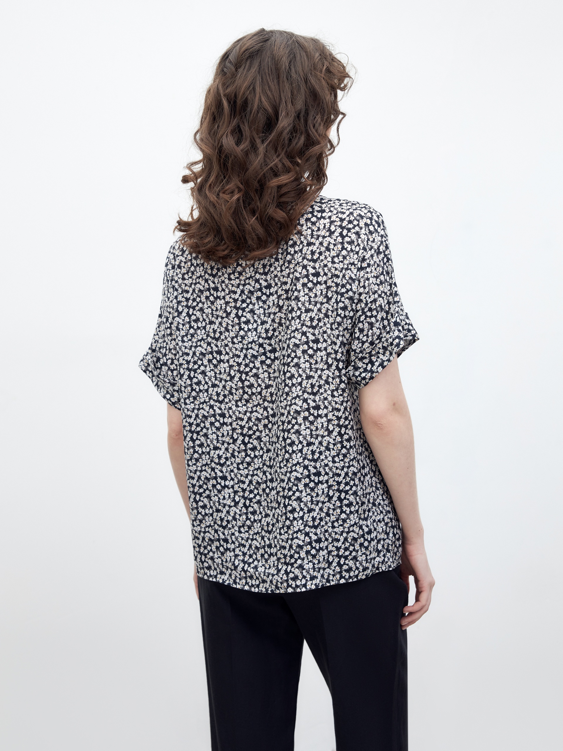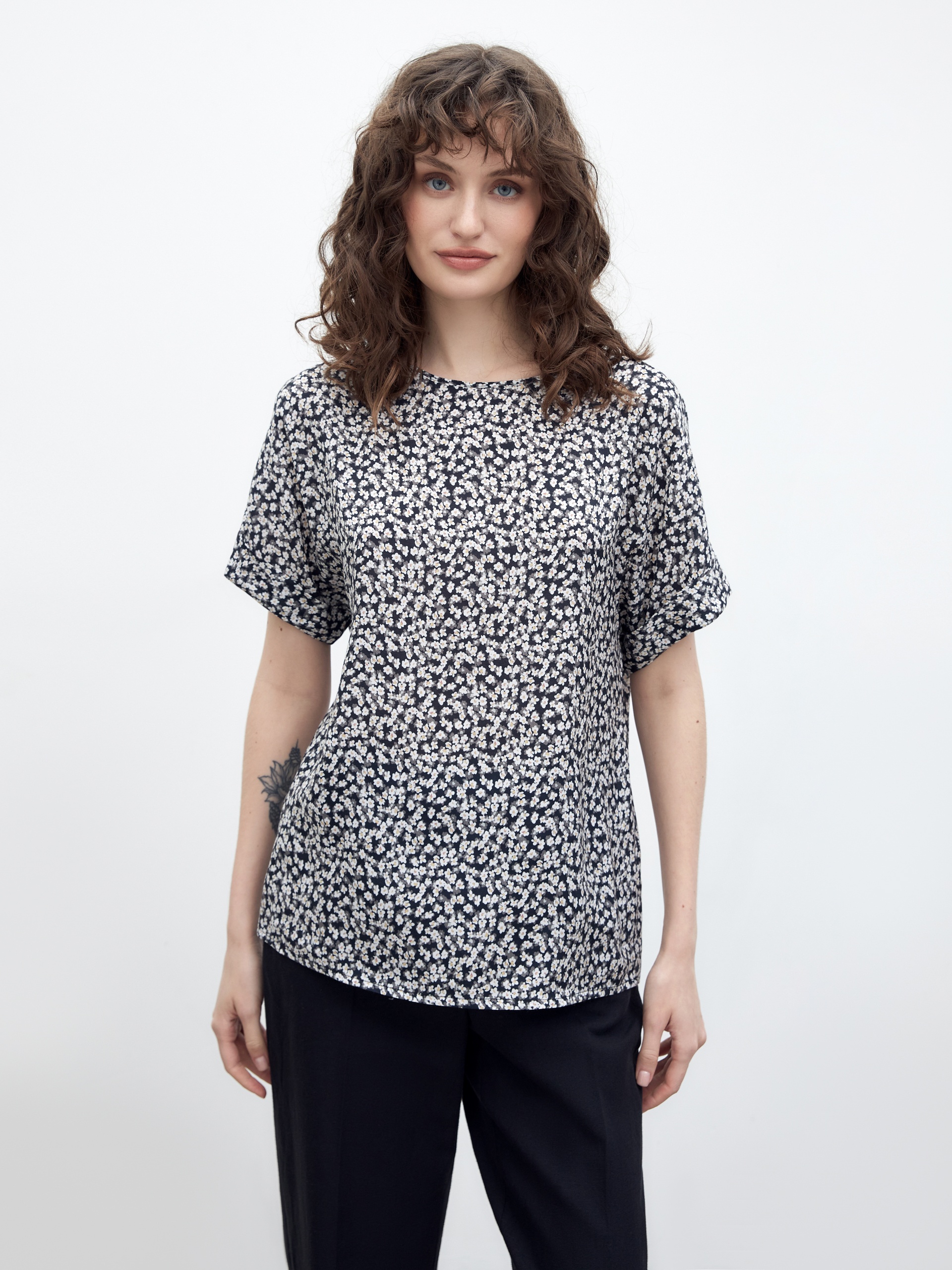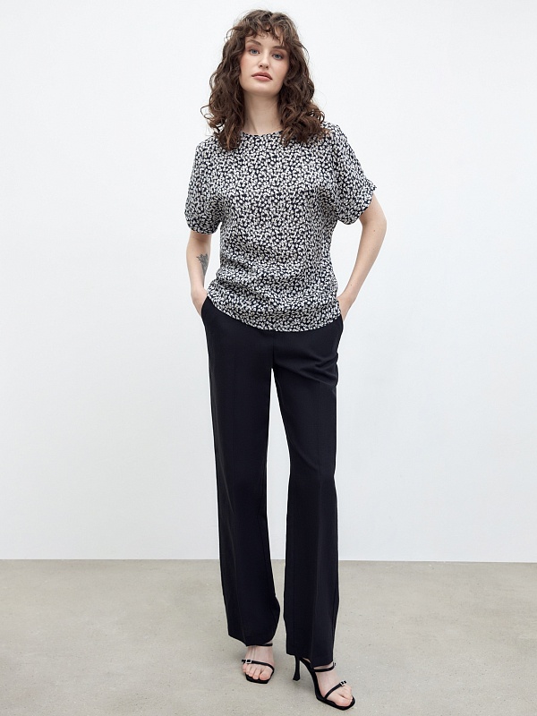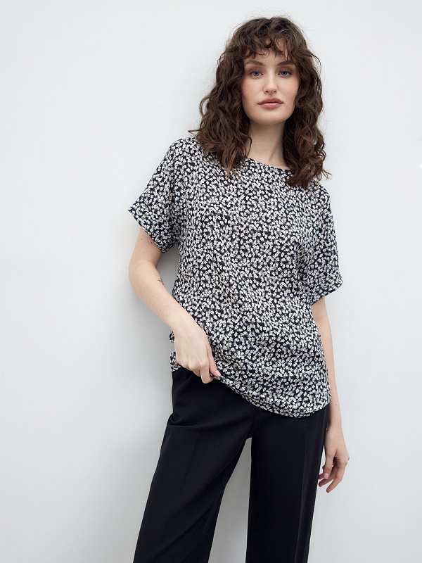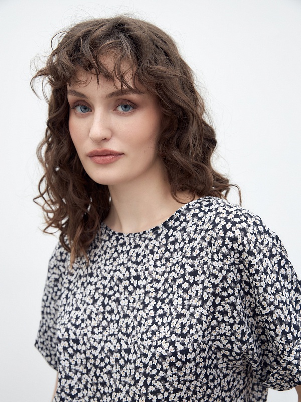 Женственная блуза из мягкой вискозы в принте, прямого свободного силуэта, с горловиной лодочка и коротким рукавом кимоно. Идеальная блуза для создания расслабленных повседневных образов.