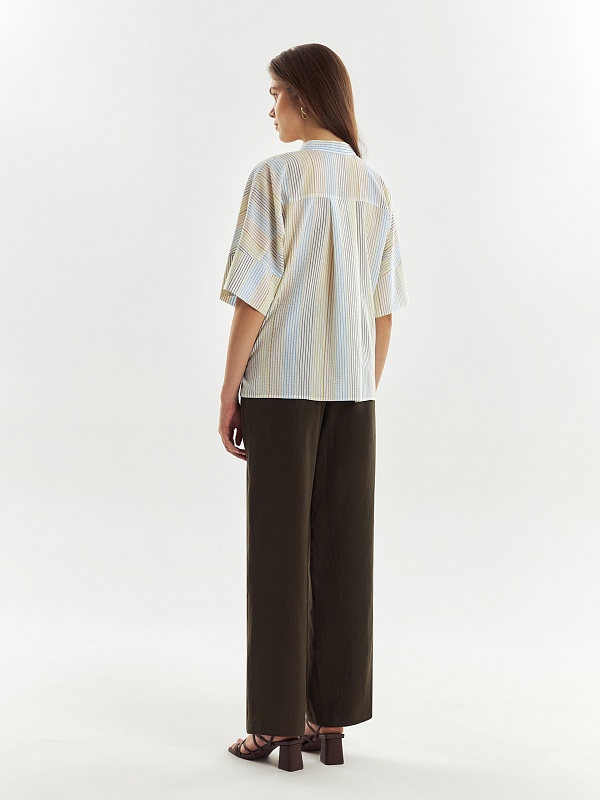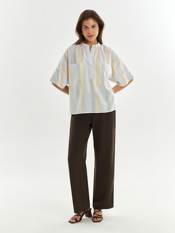 Прямая свободная блуза со стойкой и пуговицей, планкой c V-образным вырезом. Блуза с цельнокроеным рукавом кимоно с широким манжетом. На спинке кокетка со складками. На полочке накладные карманы.