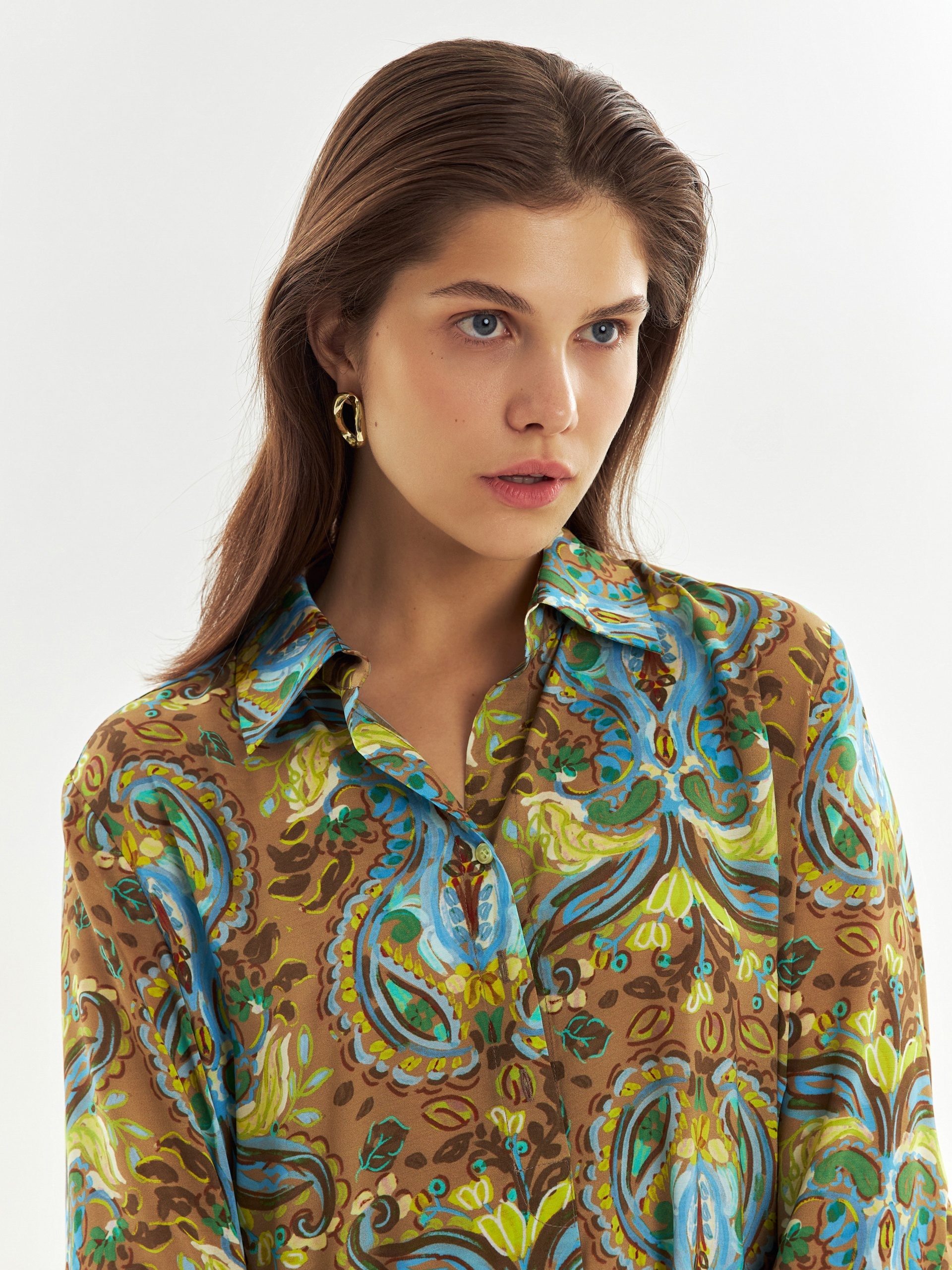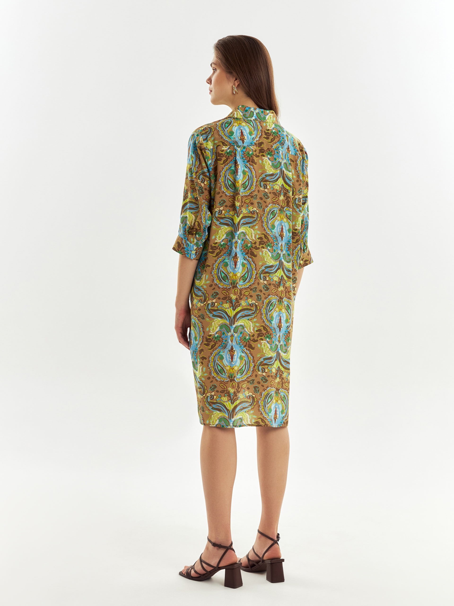 Прямое платье блузочного силуэта с отложным воротником и застежкой планкой на пуговицы. Платье выполнено их хлопковой ткани с добавлением района в ярком акцентном принте. Классический втачной рукав на манжете 3/4 длины. Платье с разрезами по бокам, в комплект входит тонкий длинный пояс.