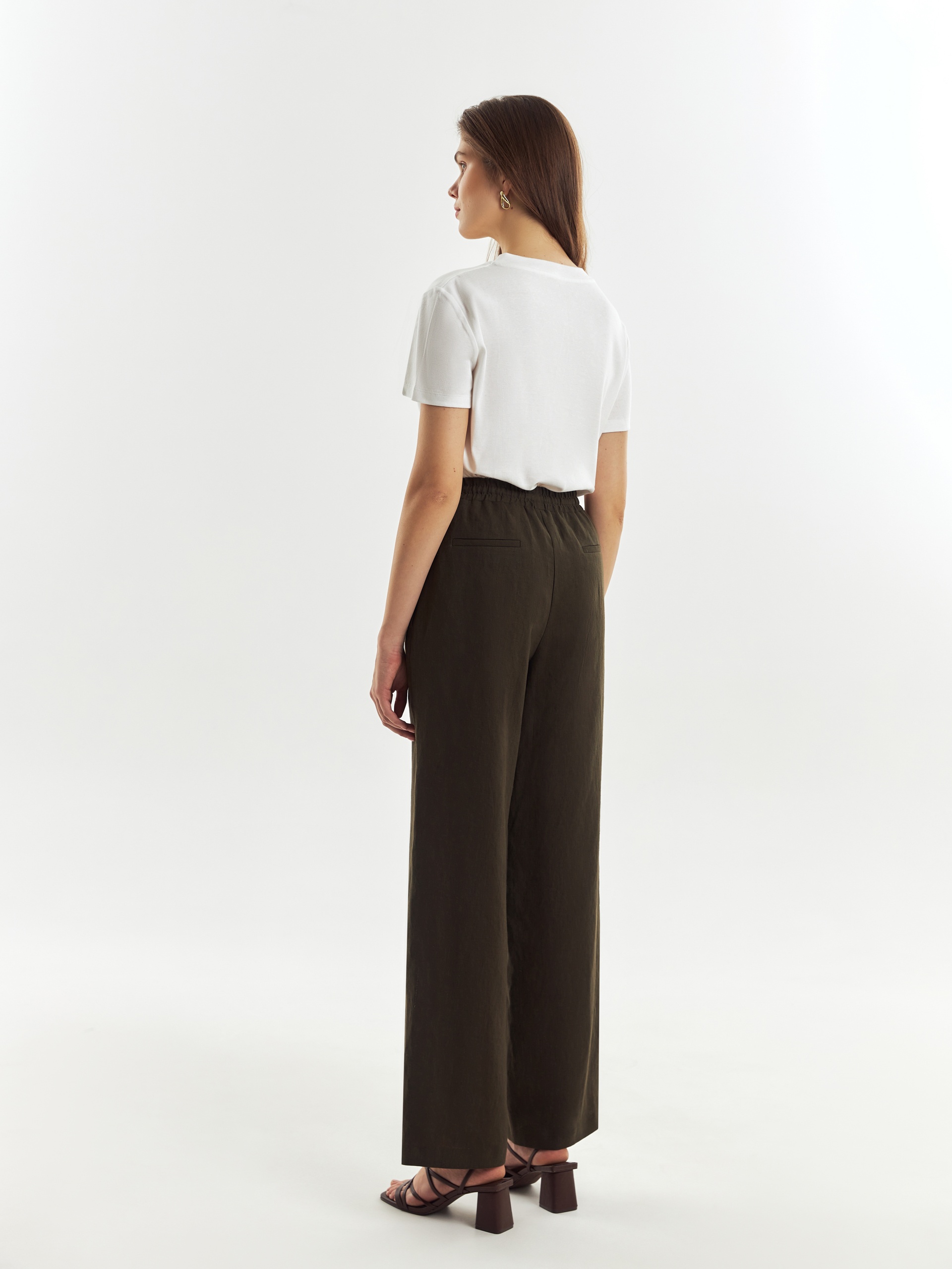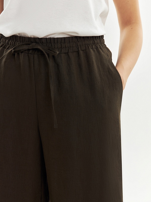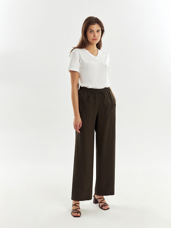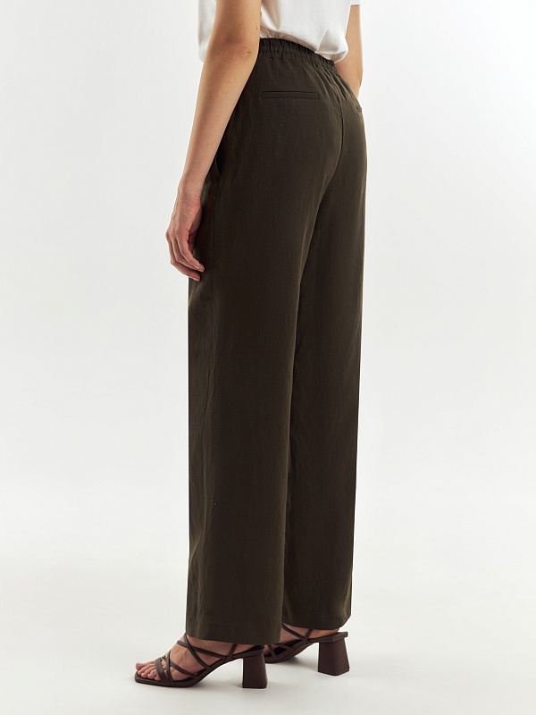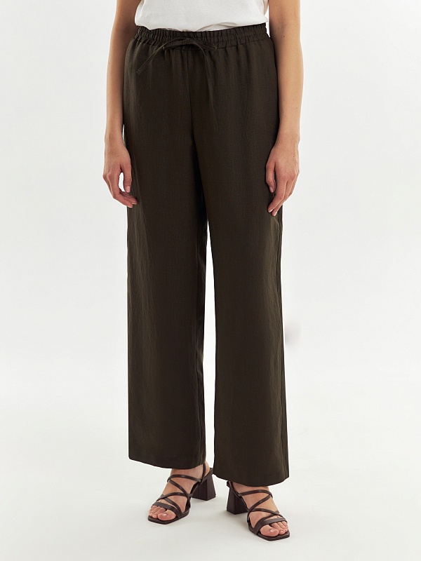 Прямые классические брюки из 100% льняной ткани в цвете хаки на резинке со стрелками, с карманами в боковых швах и кулиской на талии.