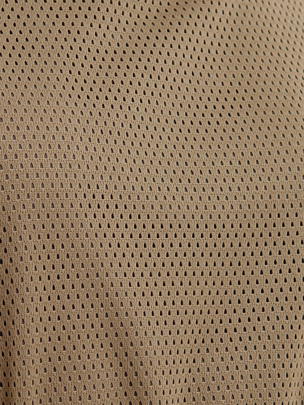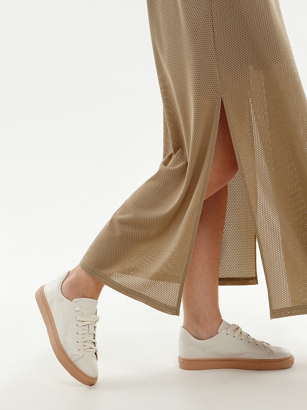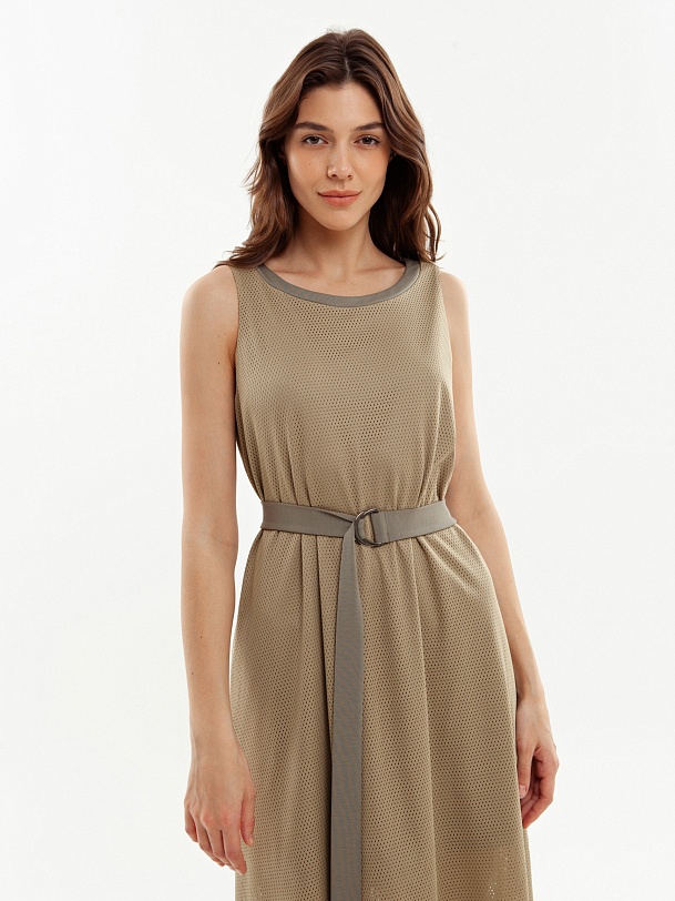 Платье миди из трикотажной сетки, круглая горловина, пояс с металлическими полукольцами, по бокам разрезы.