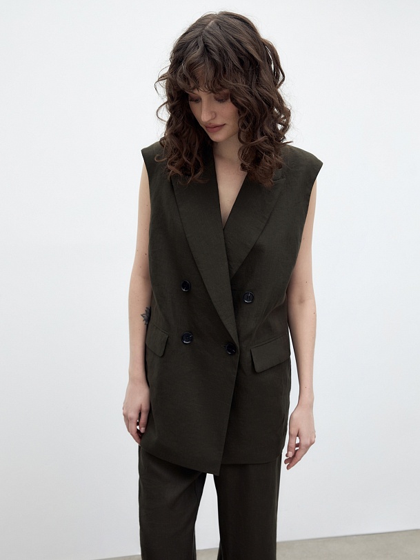 Прямой льняной удлиненный двубортный жилет со спущенной линией плеча. С акцентными лацканами, прорезными карманами с клапанами. Жилет на подкладке.