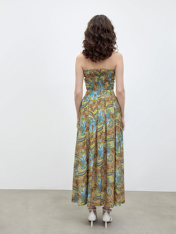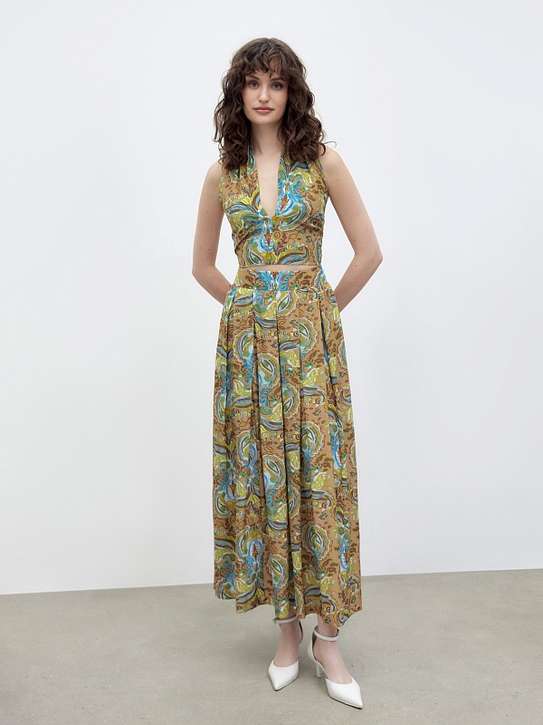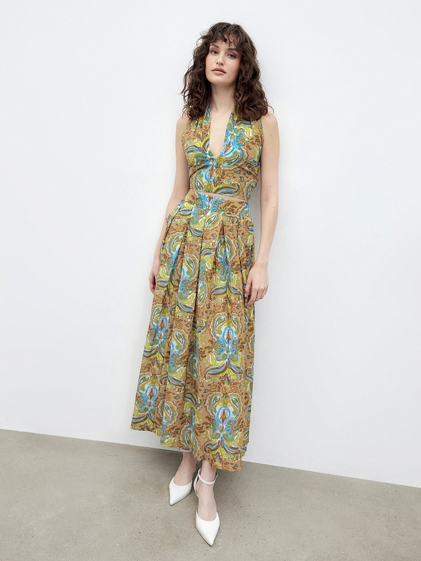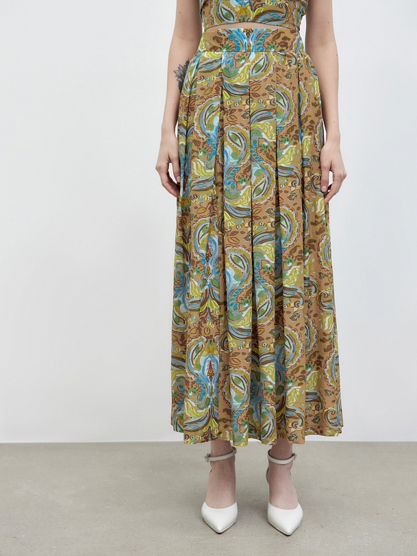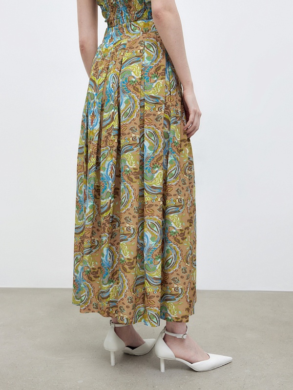 Юбка макси на кокетке со складками из натуральной ткани в принте.