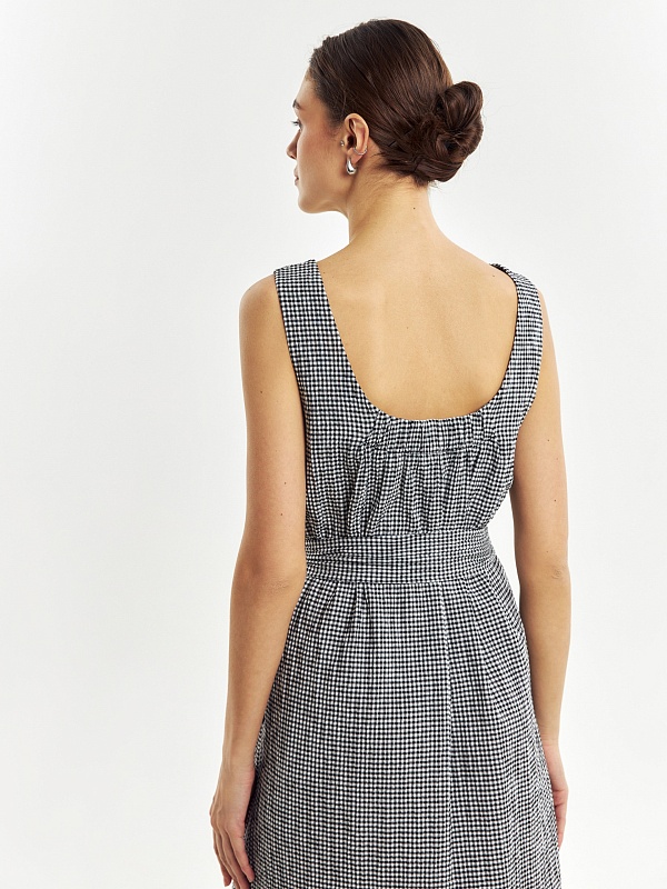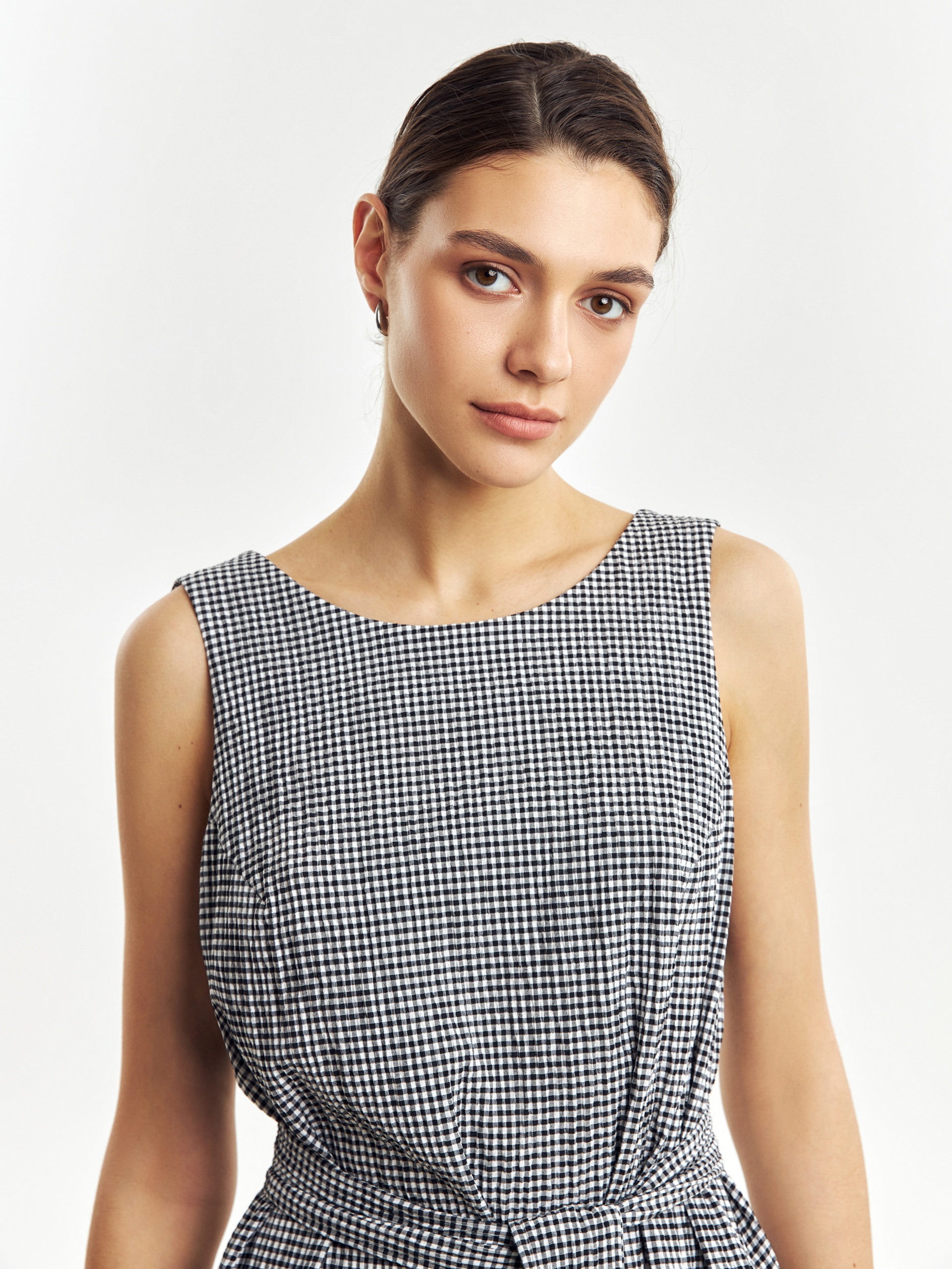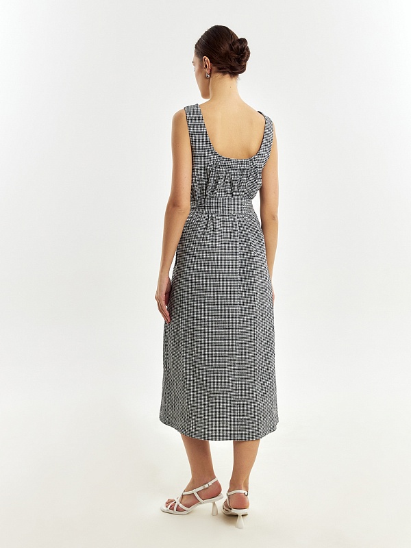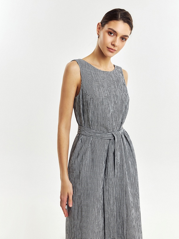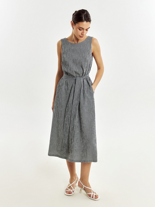 Платье прямого силуэта из хлопковой ткани с круглым вырезом спереди и более глубоким, собранным на резинку, круглым вырезом сзади. Для придания завершенного образа имеет пояс из основной ткани.