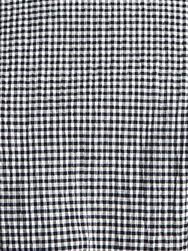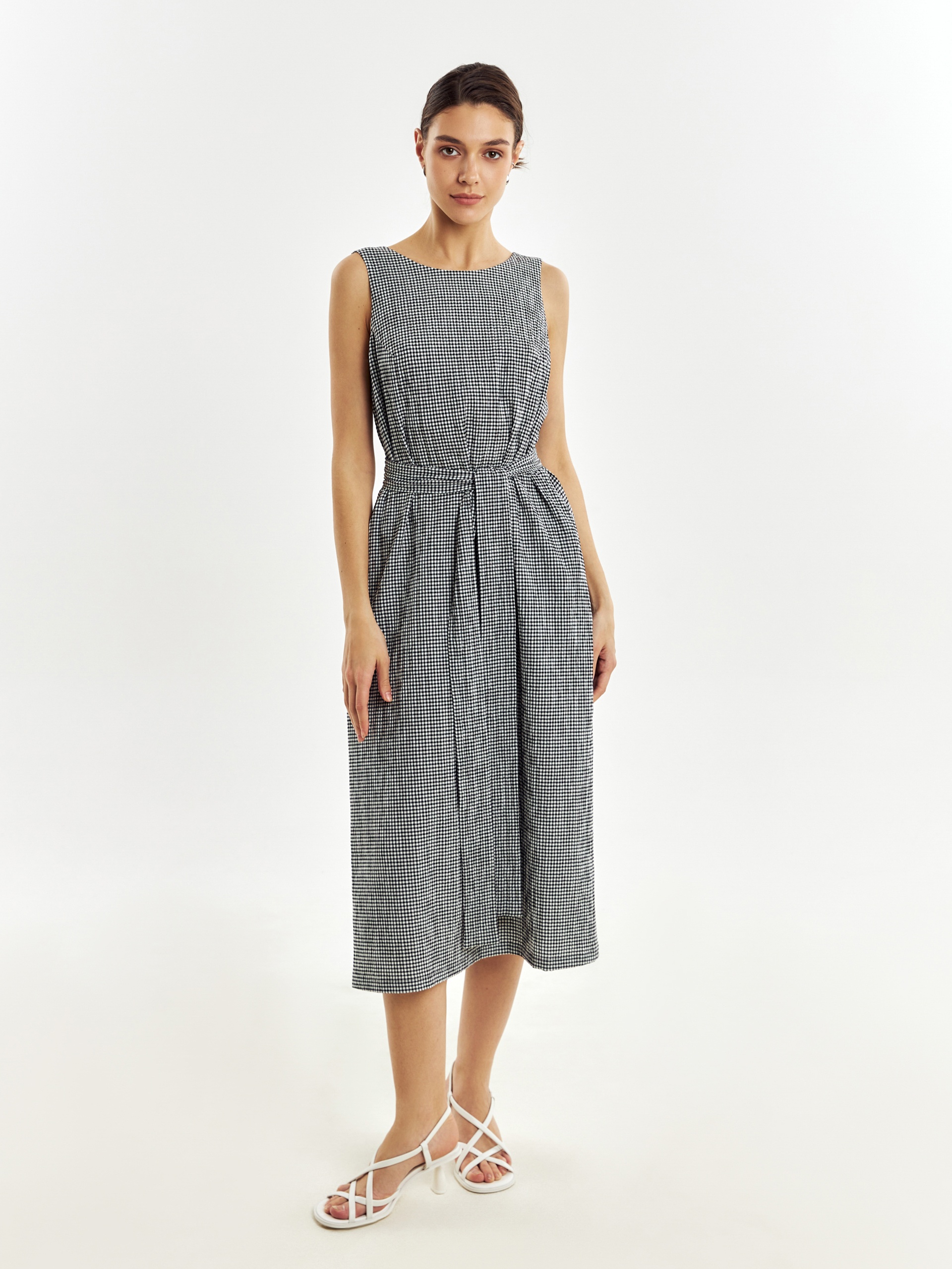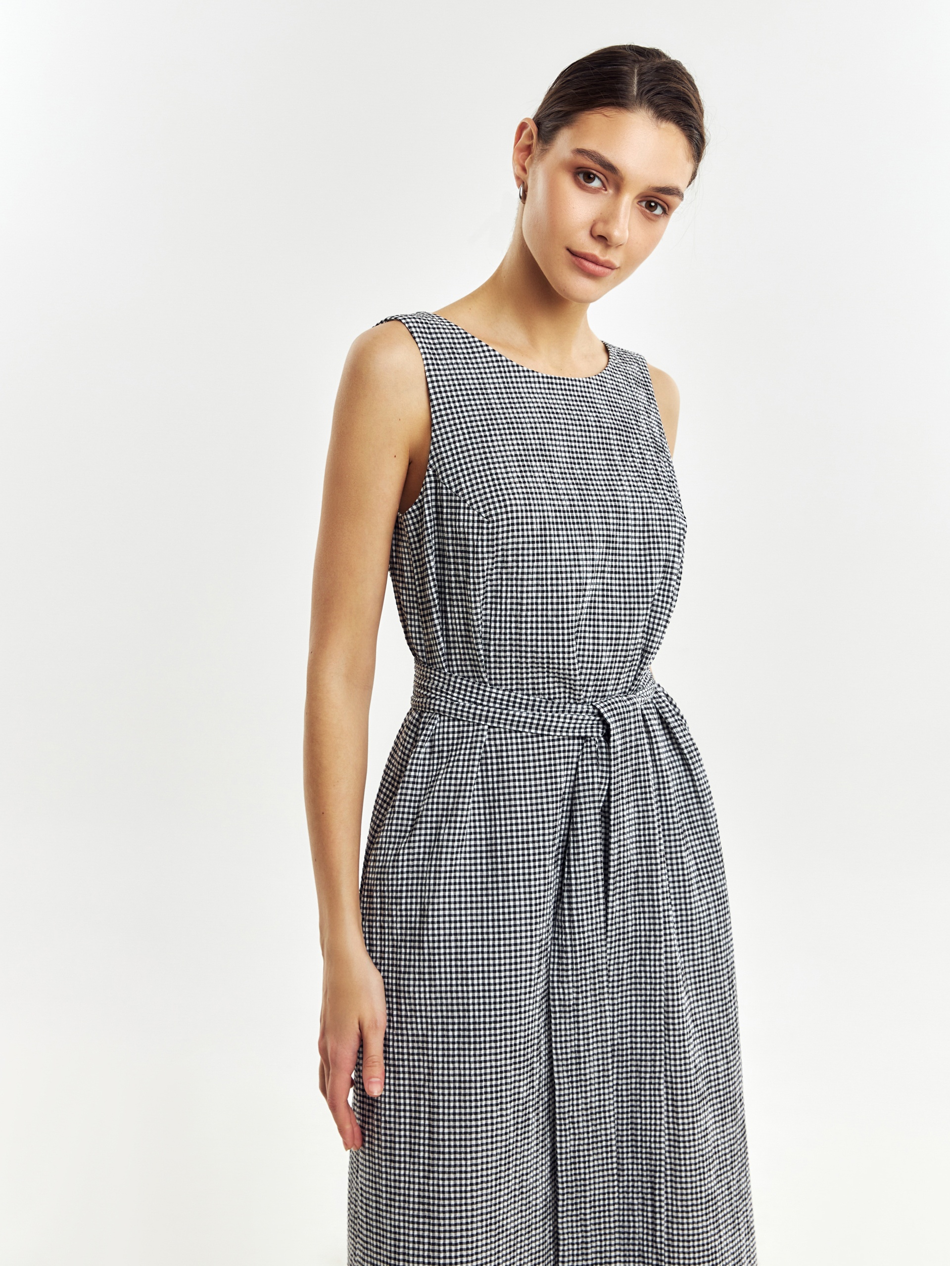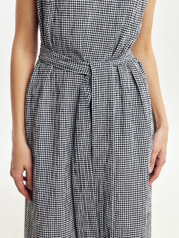 Платье прямого силуэта из хлопковой ткани с круглым вырезом спереди и более глубоким, собранным на резинку, круглым вырезом сзади. Для придания завершенного образа имеет пояс из основной ткани.
